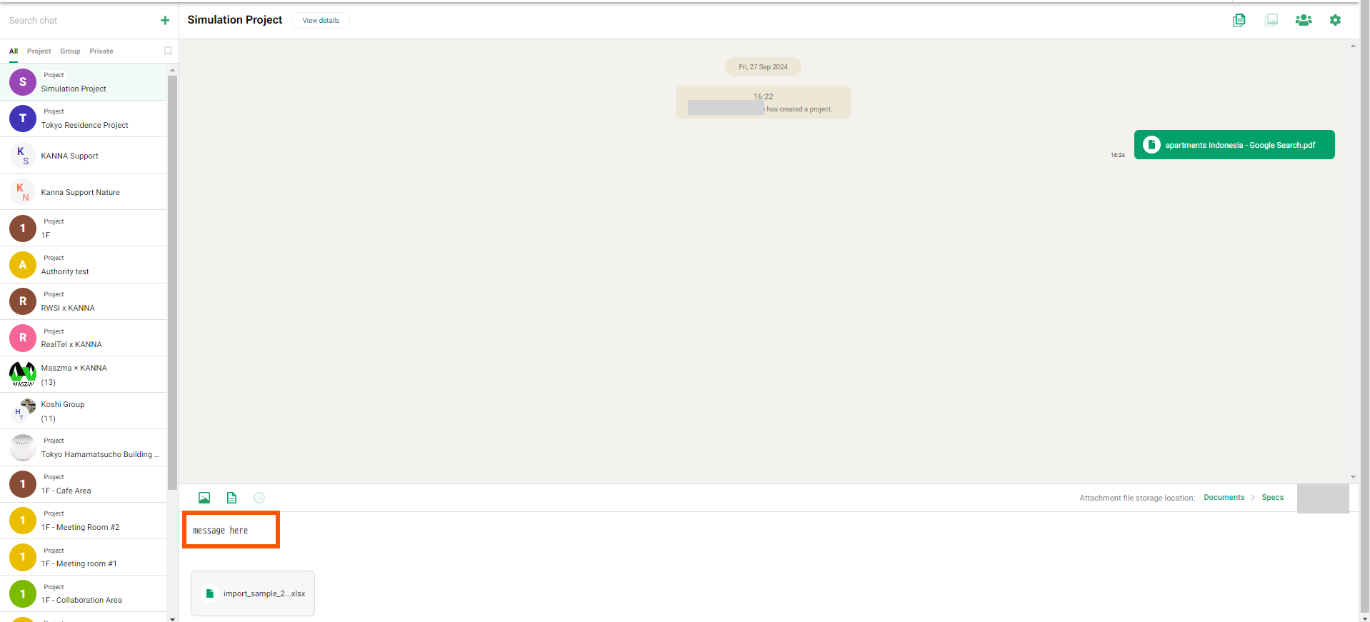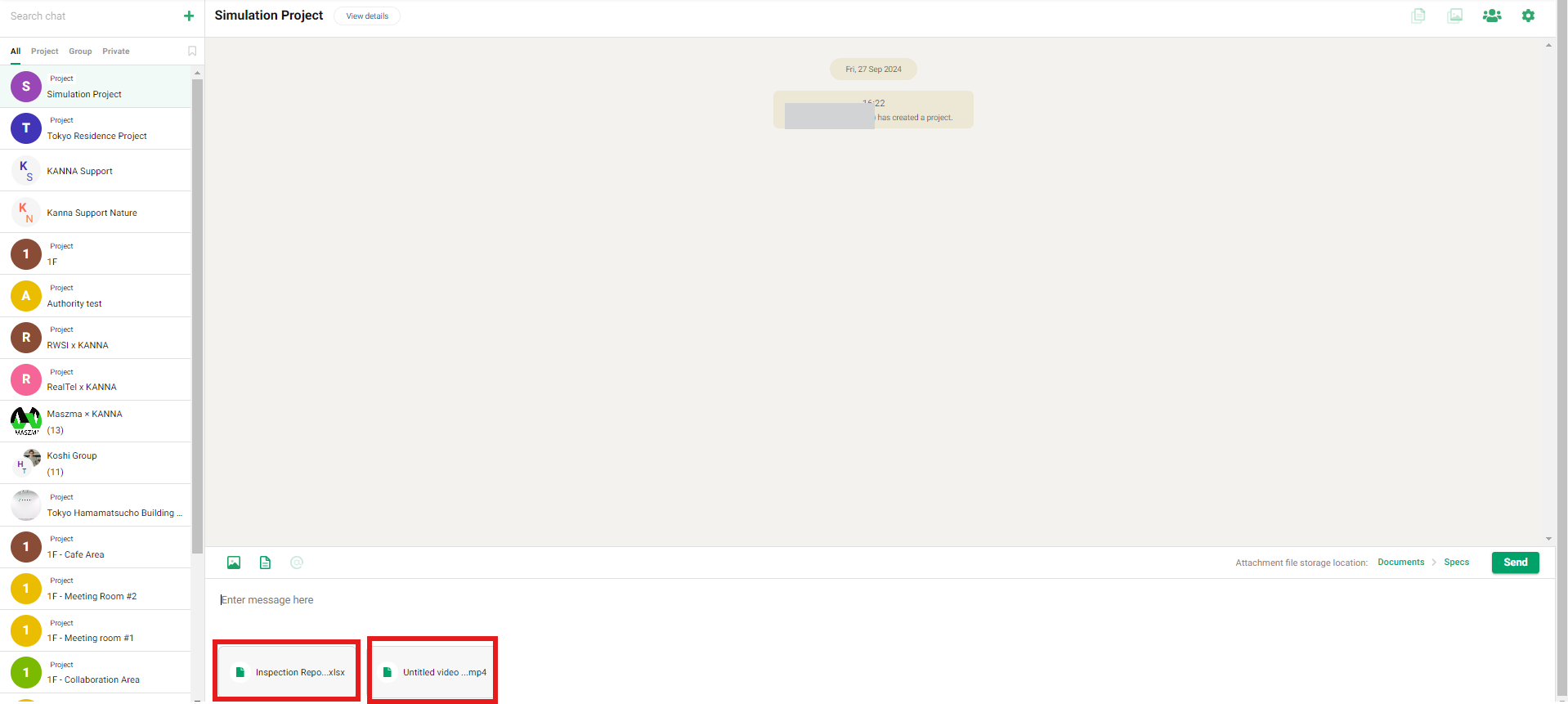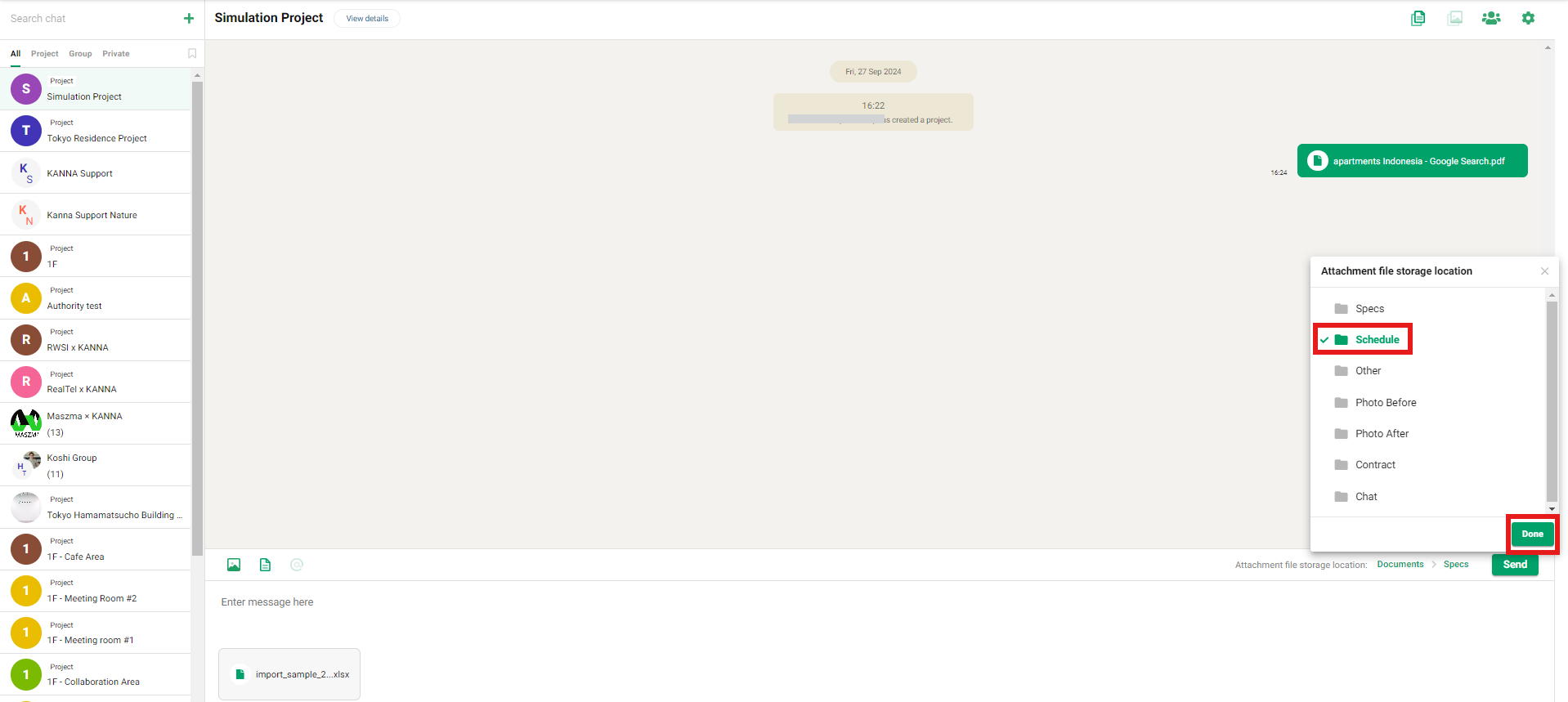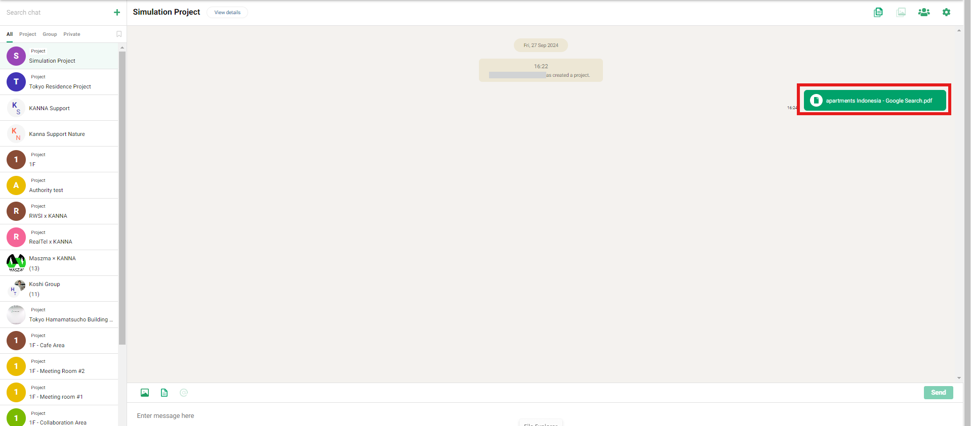 Selain itu, dokumen yang dikirim dalam obrolan setiap proyek secara otomatis disimpan di folder yang sesuai dalam proyek tersebut.