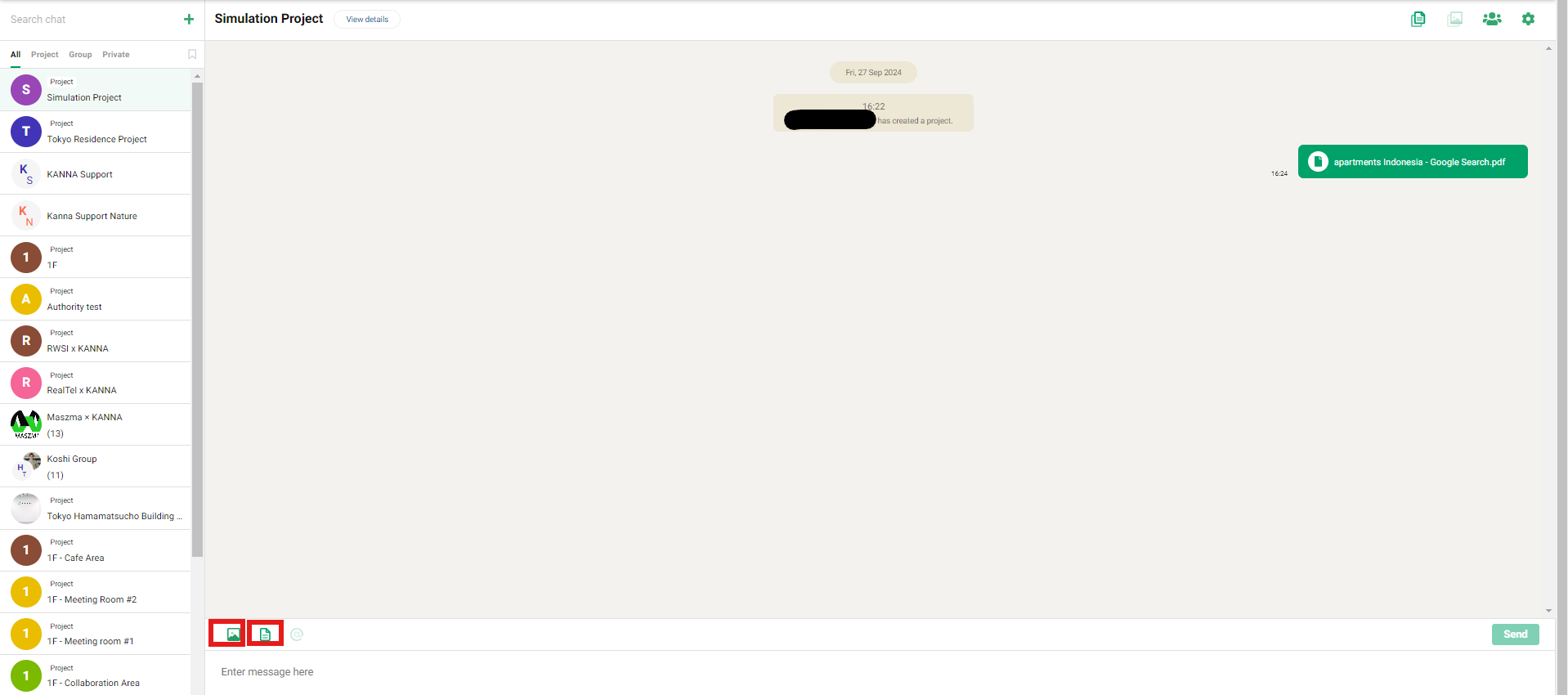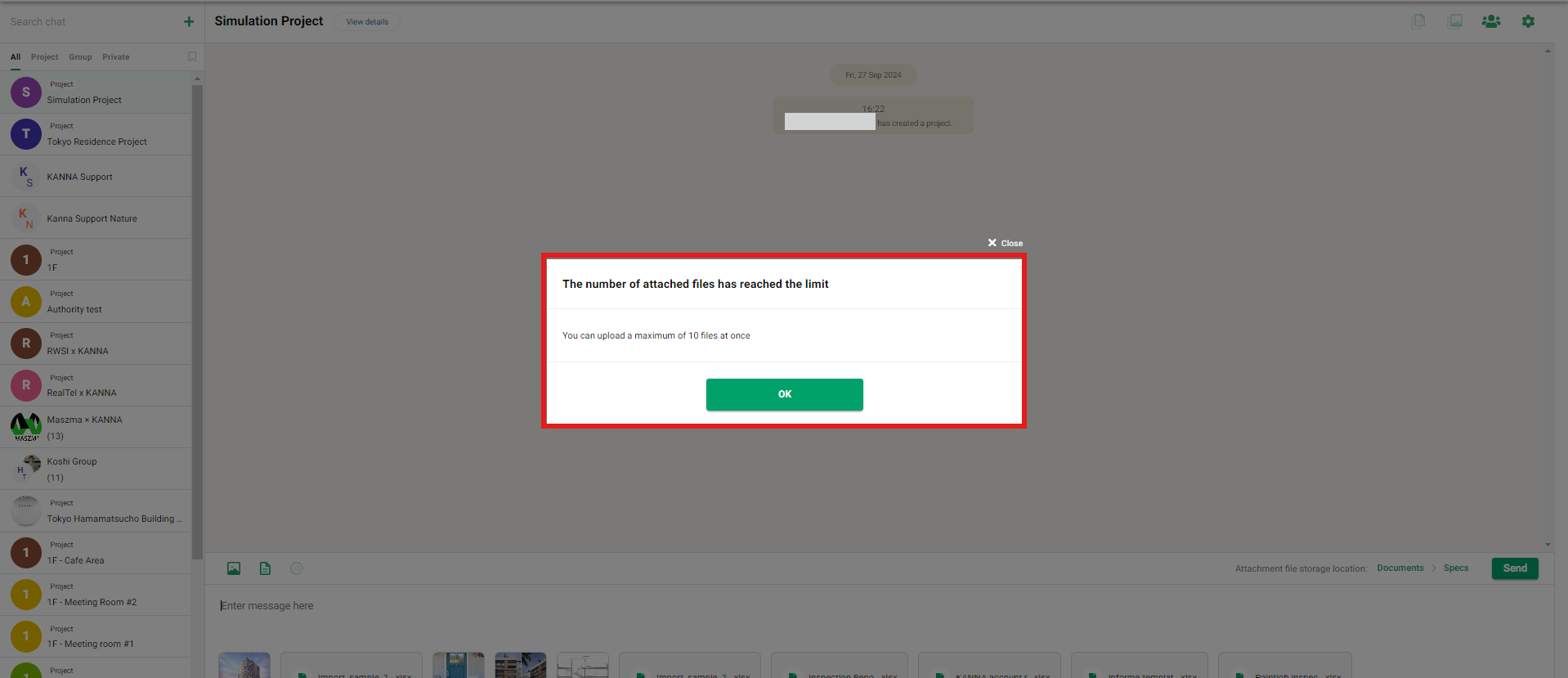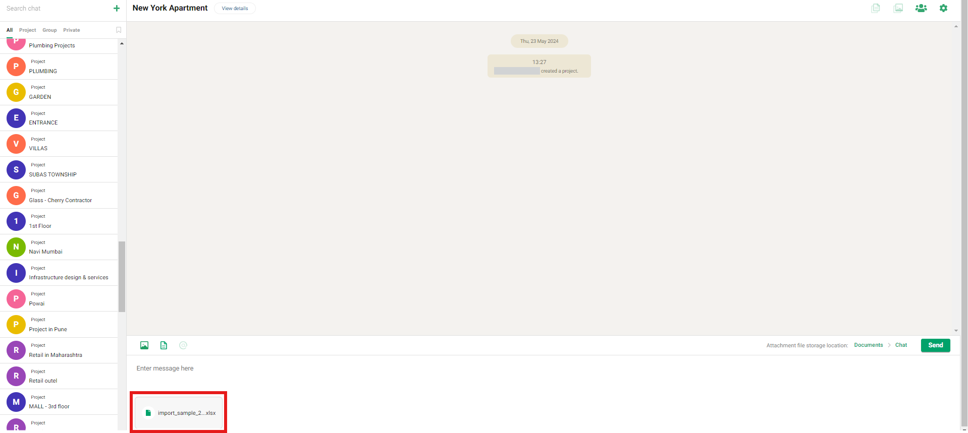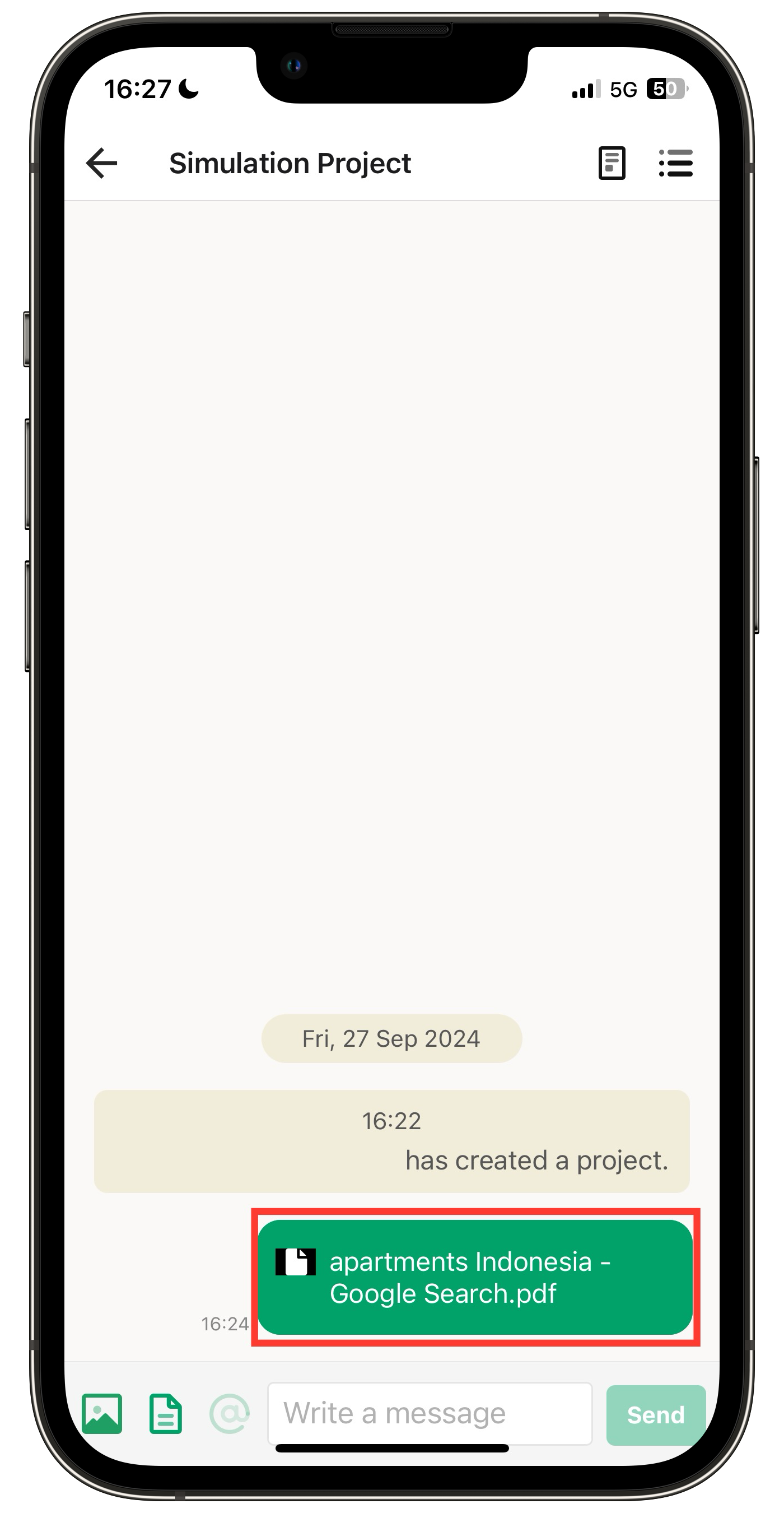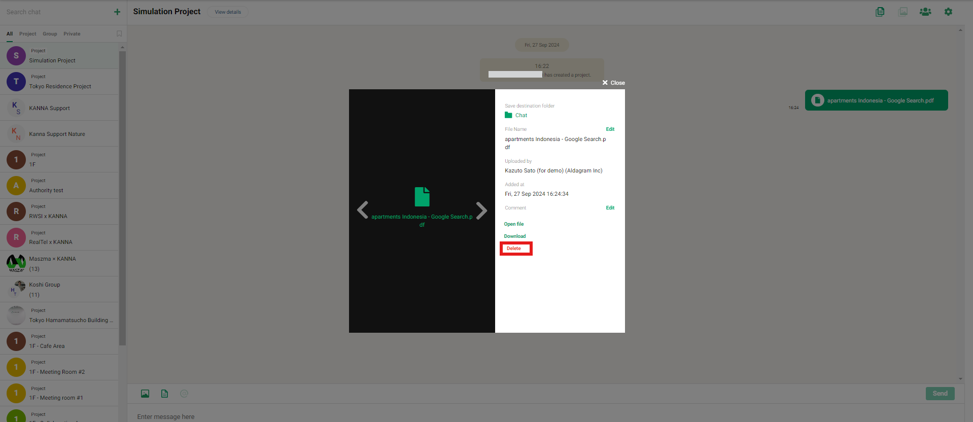 Selain itu, dokumen yang dikirim dalam obrolan setiap proyek secara otomatis disimpan di folder yang sesuai dalam proyek tersebut.