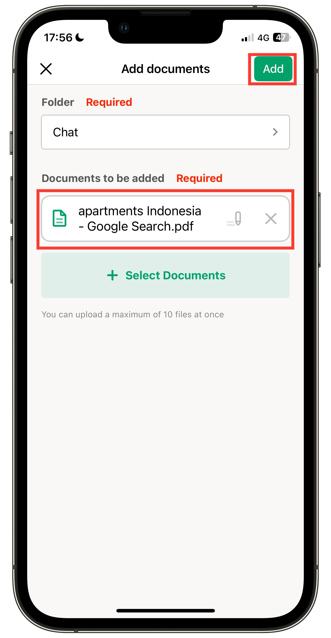 3. Pilih dokumen yang ingin Anda tambahkan dari “+ Pilih Dokumen,” kemudian ketuk “Tambahkan” di pojok kanan atas.