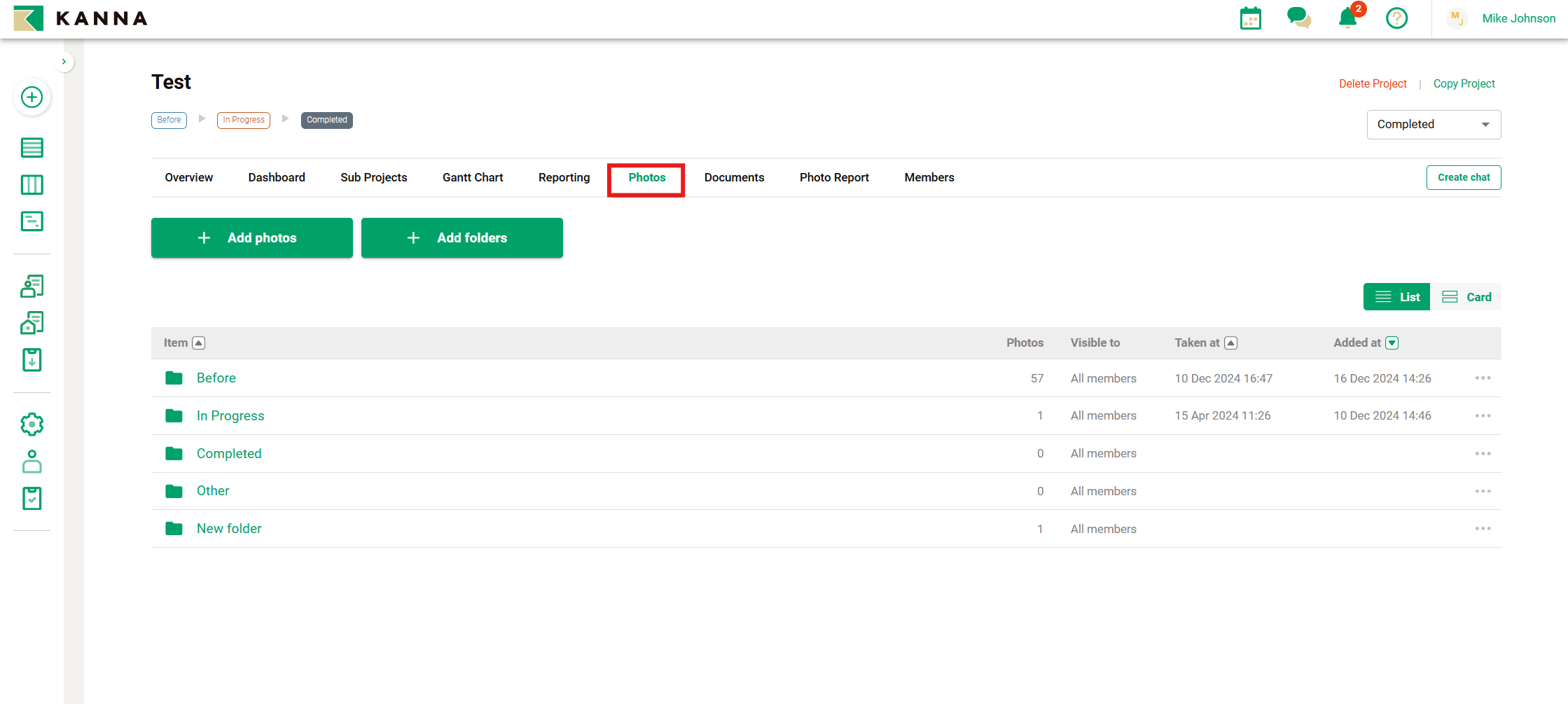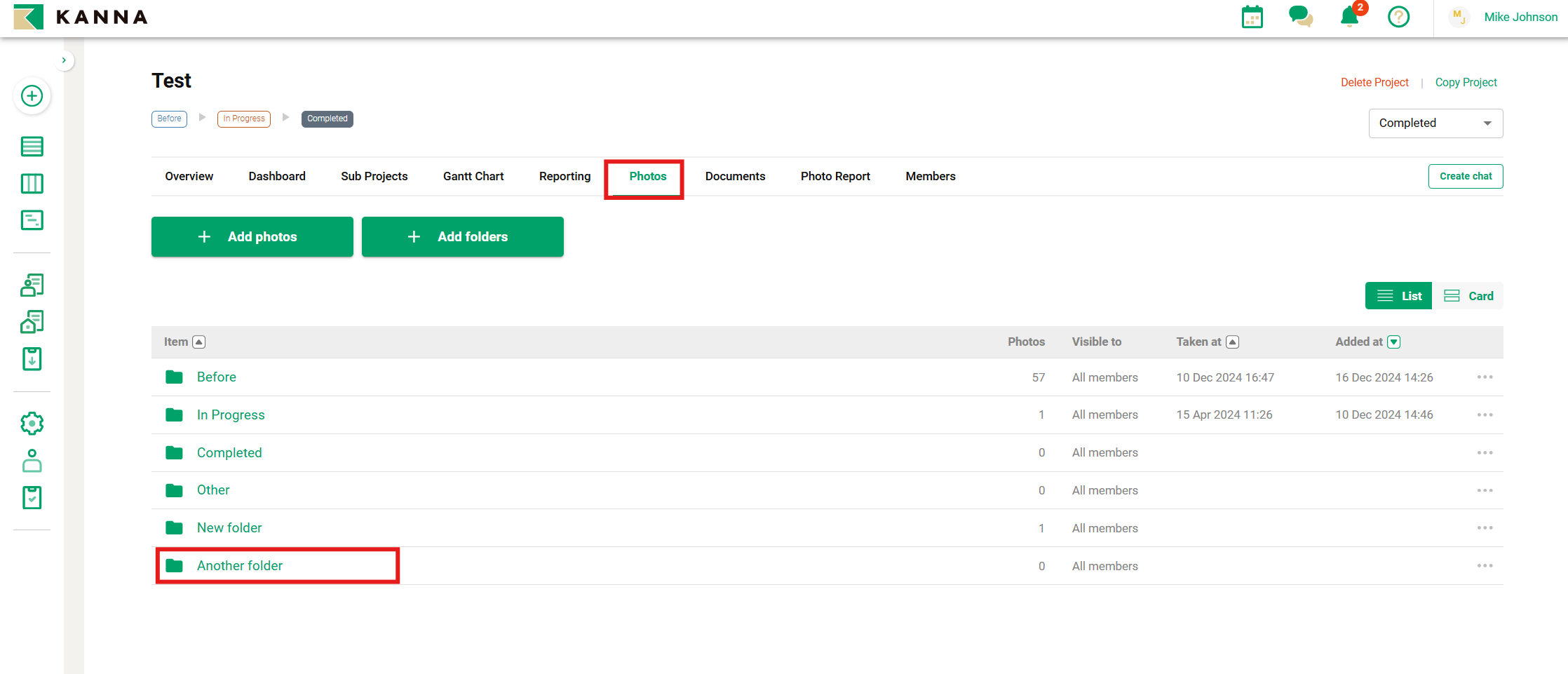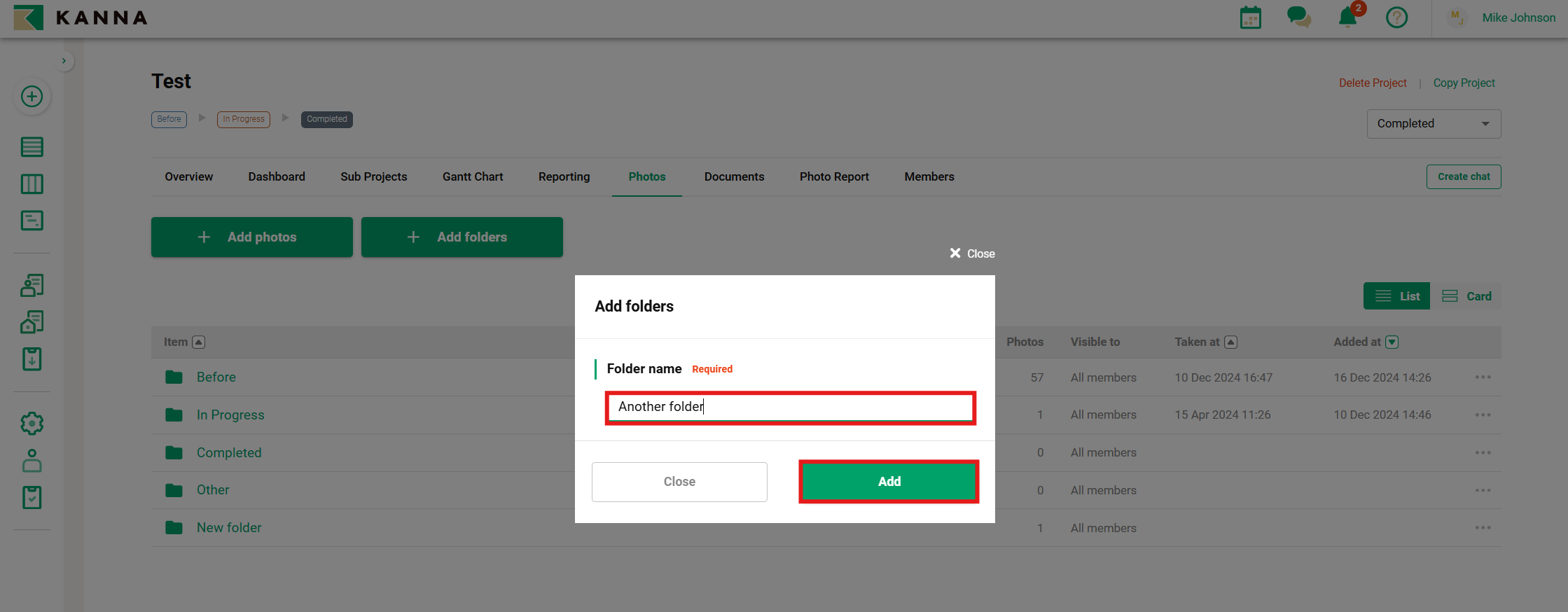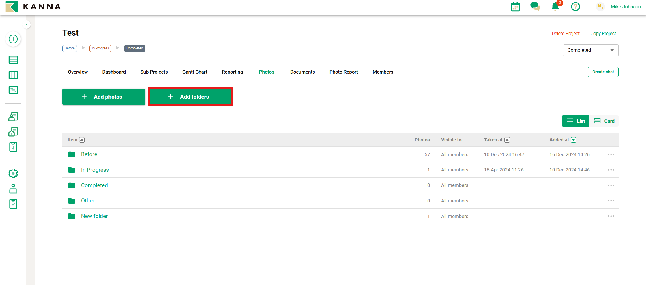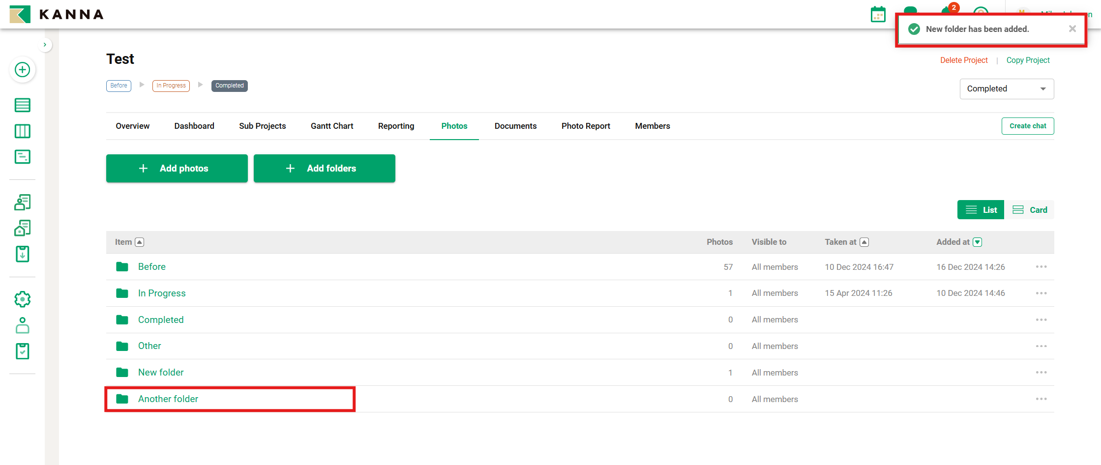 Di KANNA, Anda dapat menambahkan dan membuat folder foto. Dengan mengorganisir lokasi penyimpanan foto ke dalam folder di lokasi proyek, Anda dapat menghindari masalah seperti kesulitan menemukan di mana foto disimpan atau urutan kronologis foto saat kembali ke kantor.