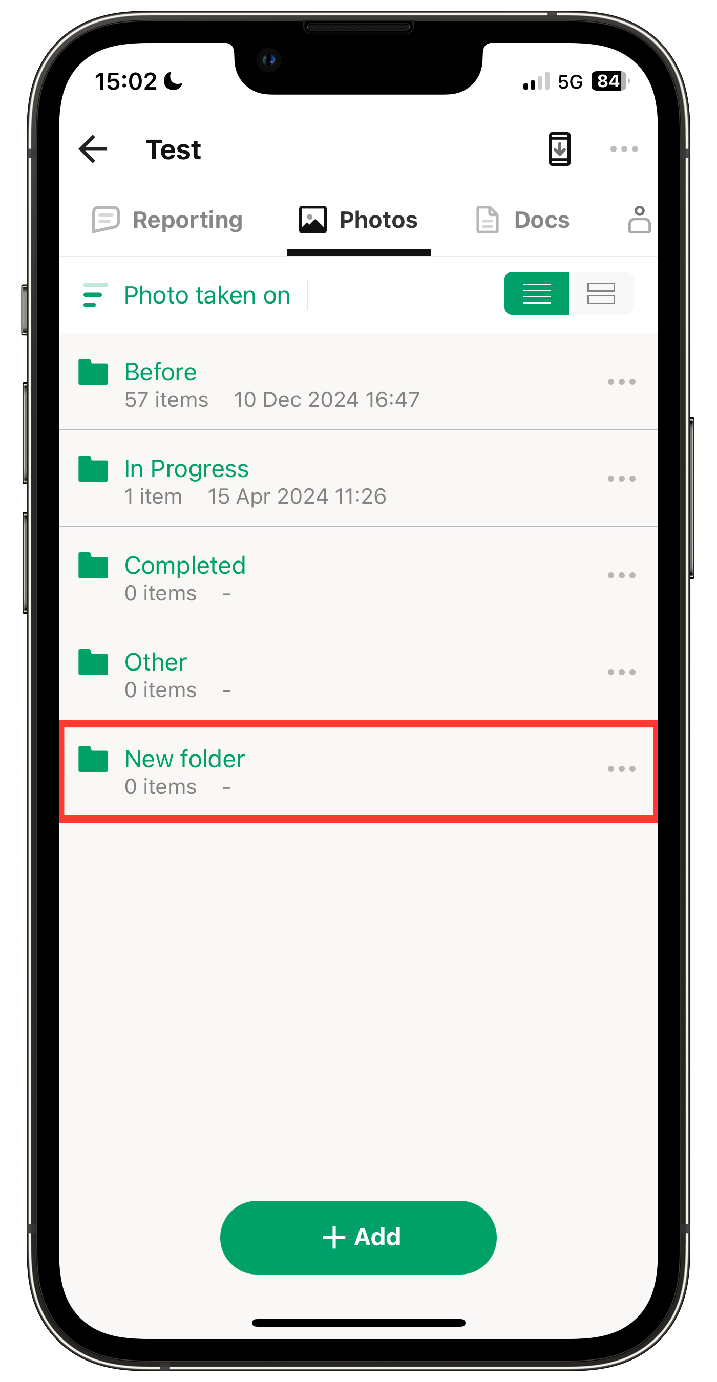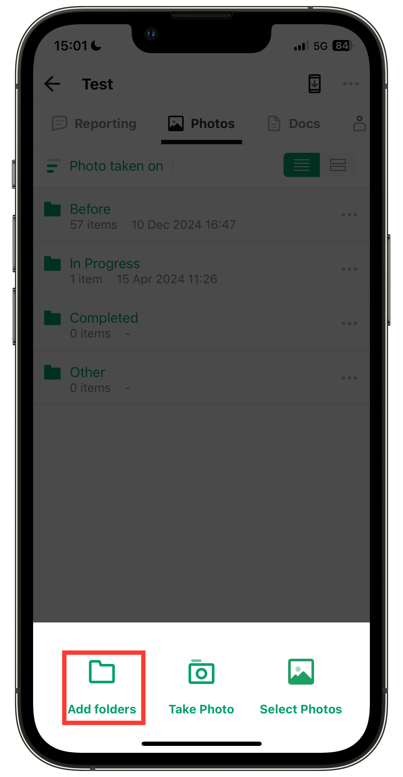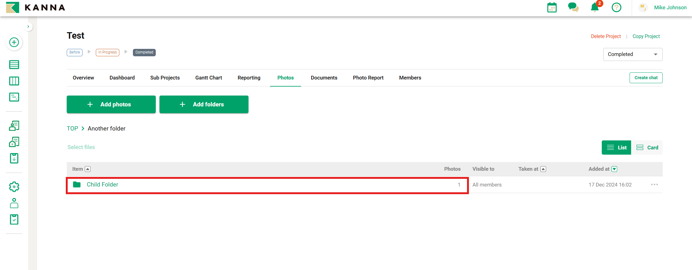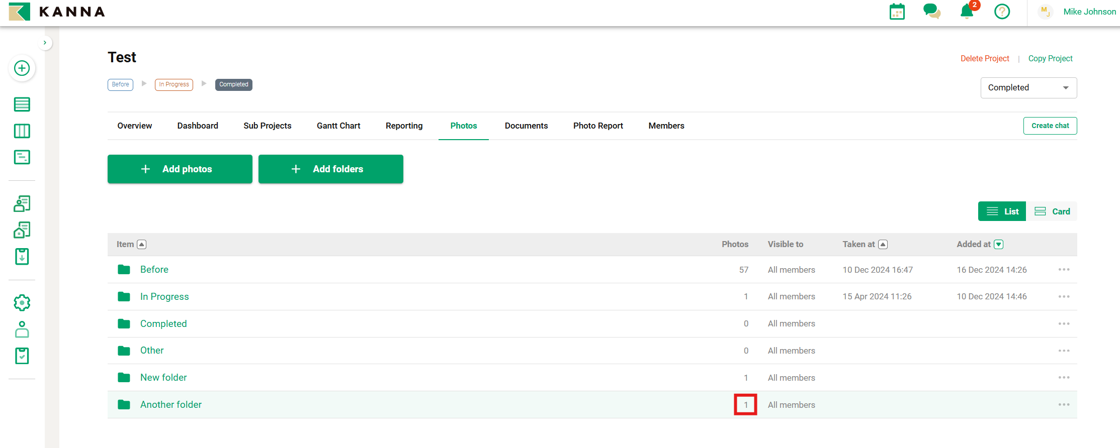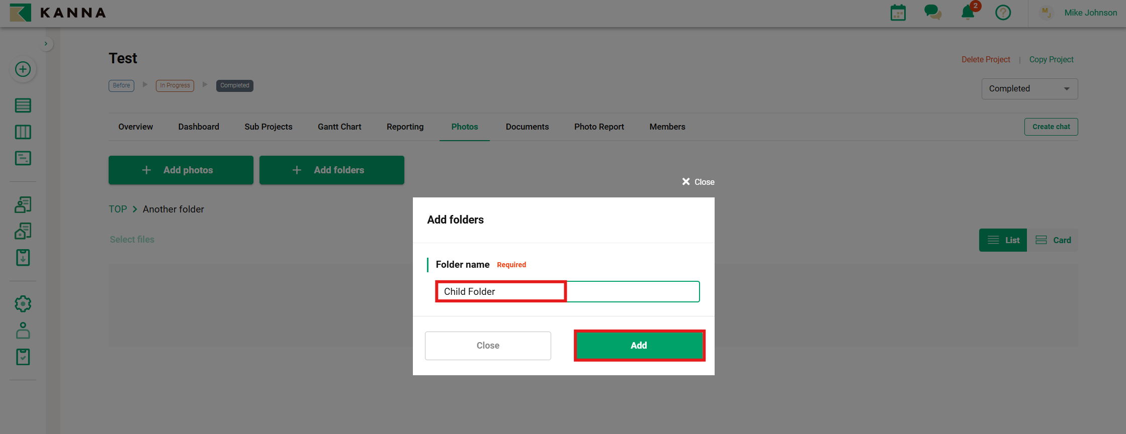 Di KANNA, Anda dapat menambahkan dan membuat folder foto. Dengan mengorganisir lokasi penyimpanan foto ke dalam folder di lokasi proyek, Anda dapat menghindari masalah seperti kesulitan menemukan di mana foto disimpan atau urutan kronologis foto saat kembali ke kantor.
