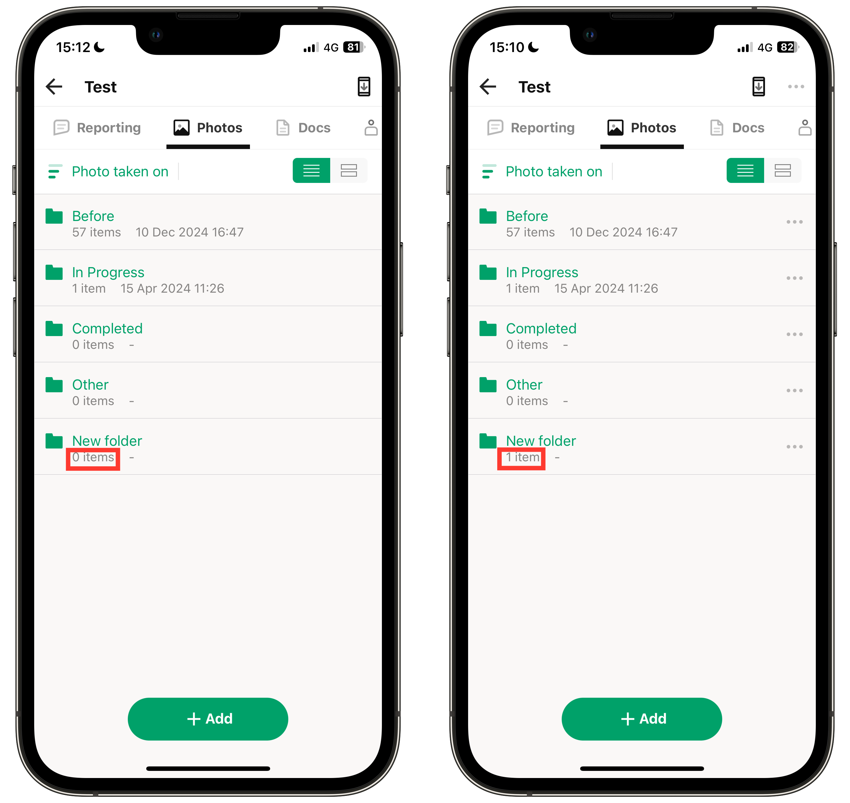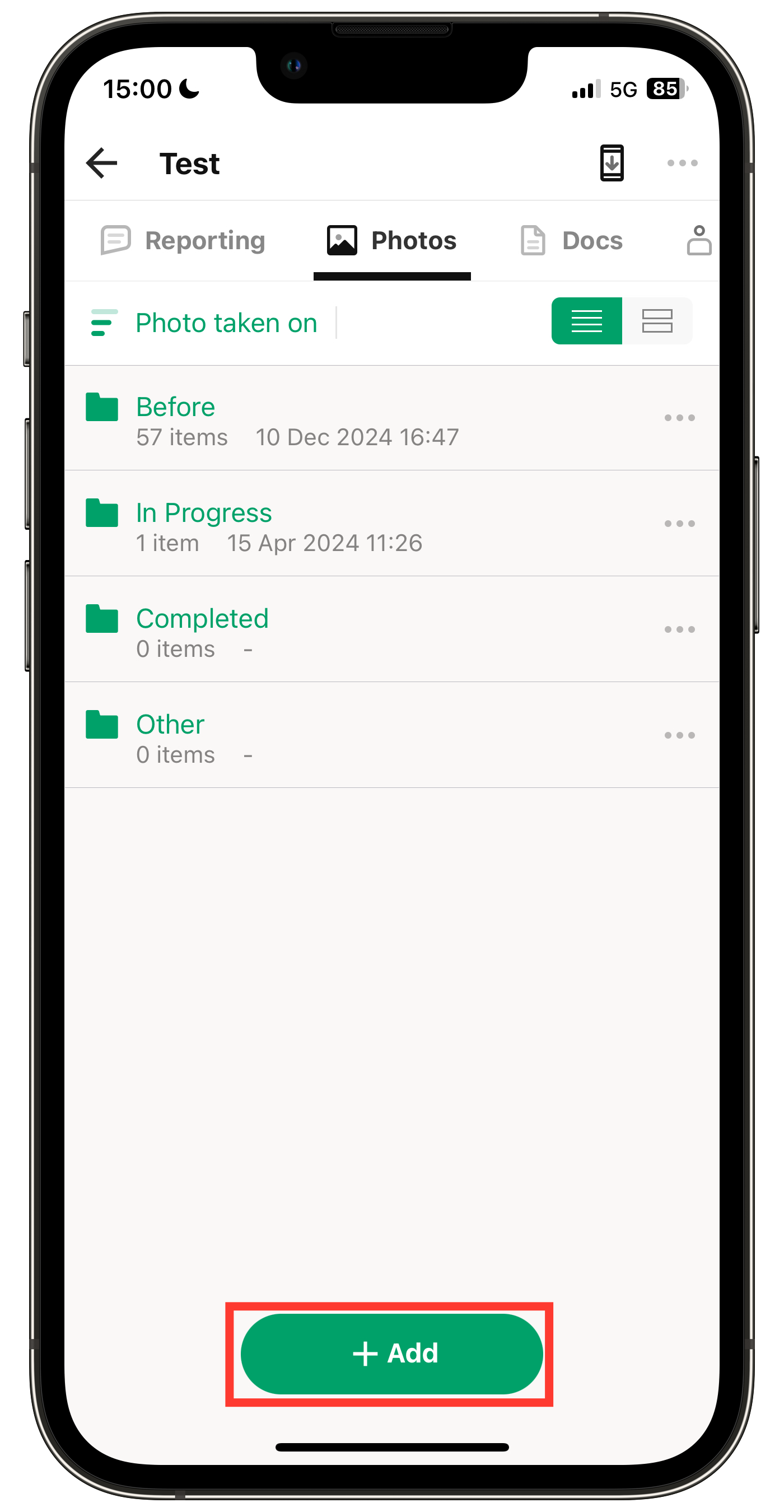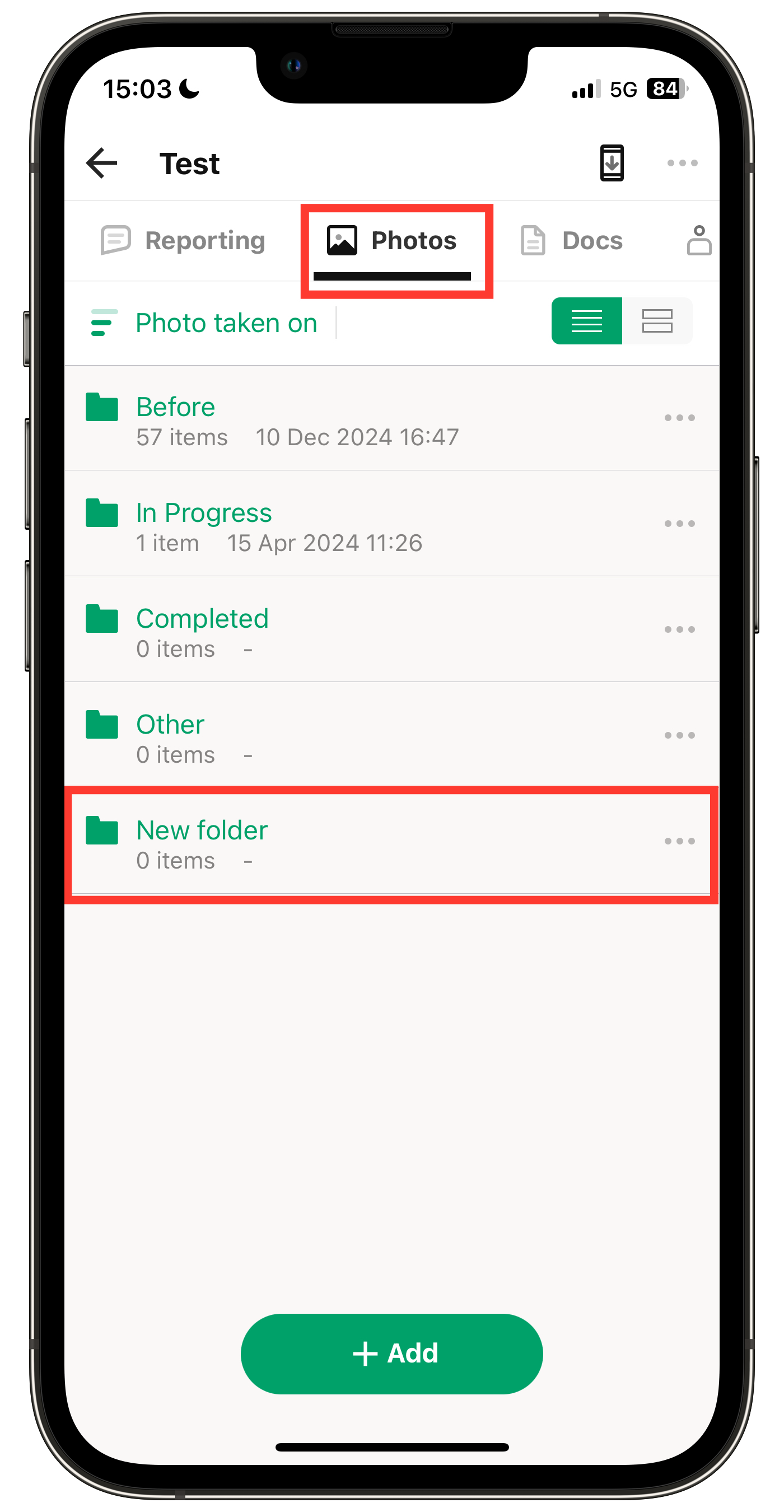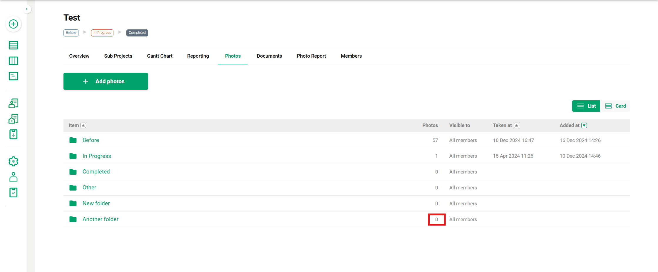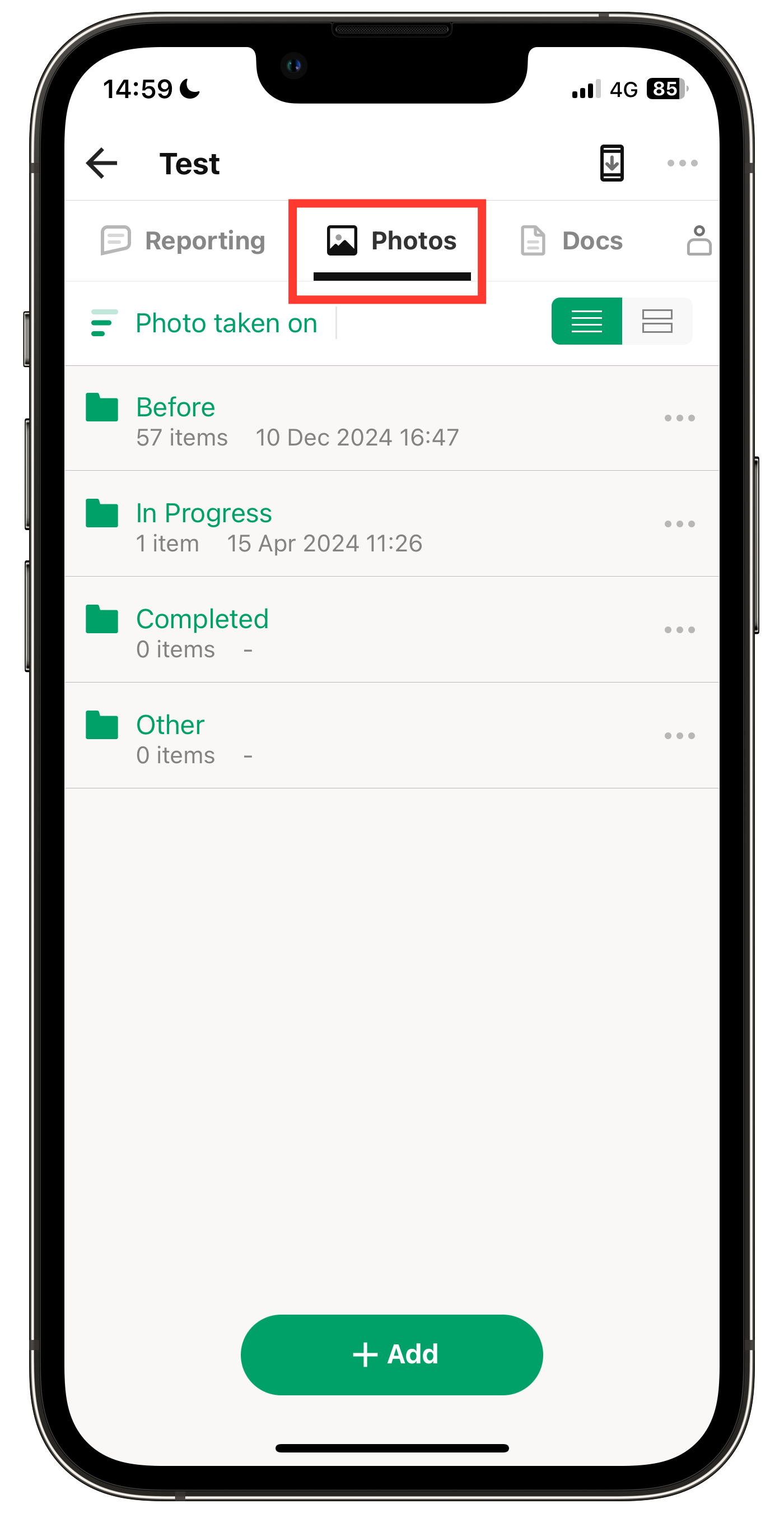 Di KANNA, Anda dapat menambahkan dan membuat folder foto. Dengan mengorganisir lokasi penyimpanan foto ke dalam folder di lokasi proyek, Anda dapat menghindari masalah seperti kesulitan menemukan di mana foto disimpan atau urutan kronologis foto saat kembali ke kantor.