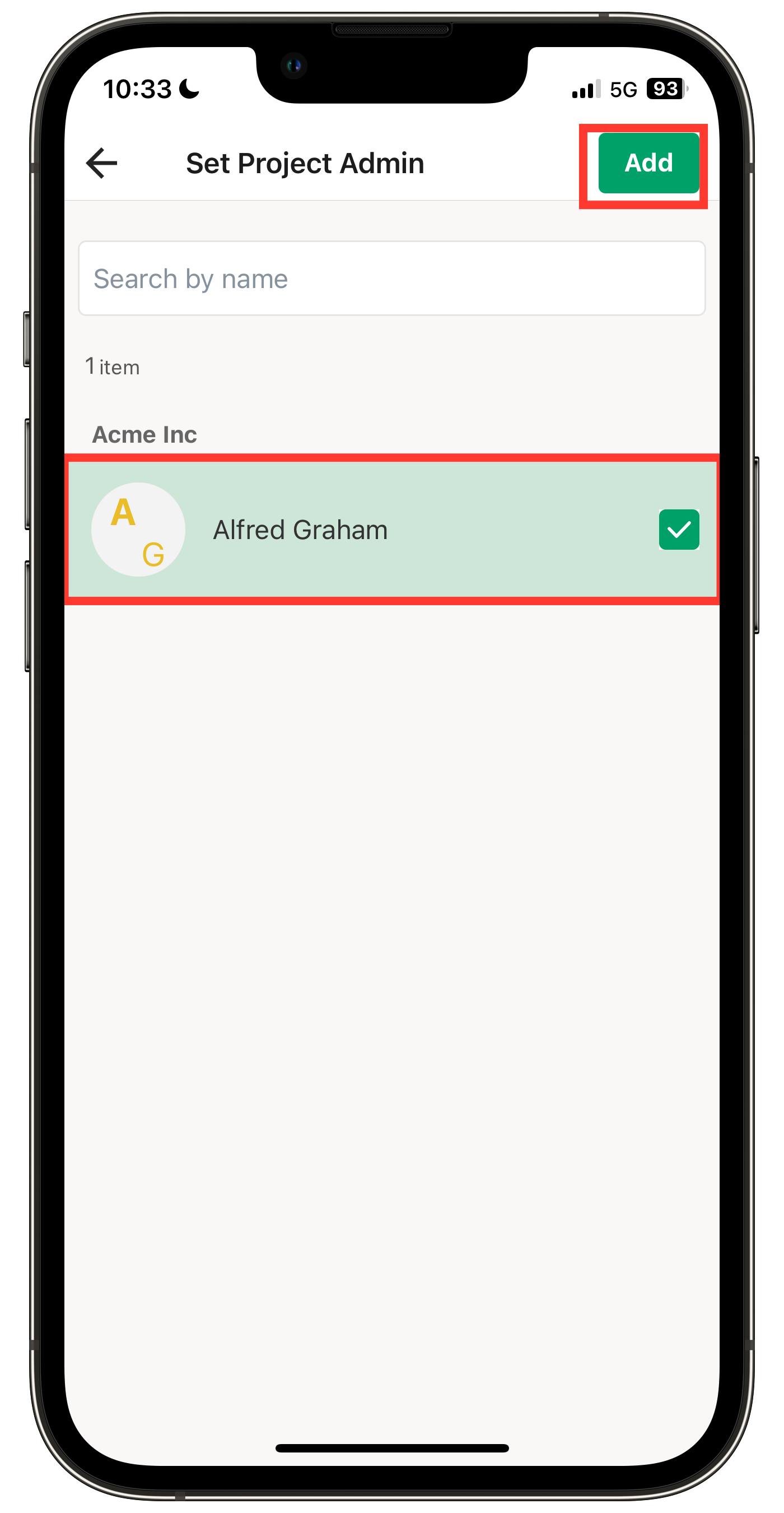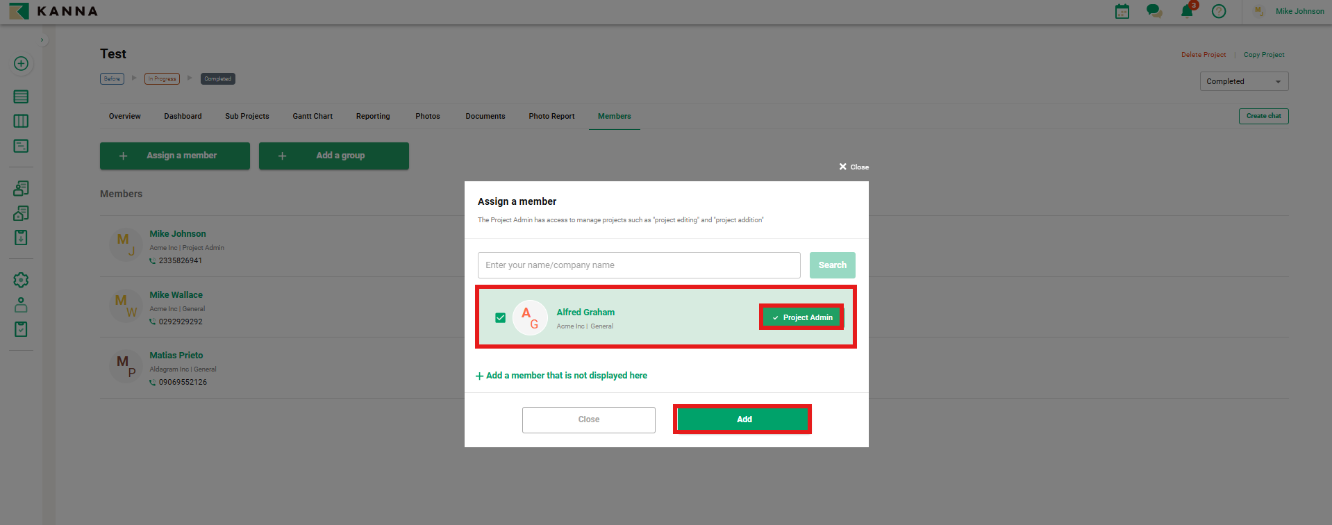 5. Pilih anggota yang ingin Anda tetapkan sebagai Admin Proyek, lalu klik Tambah di bagian atas.