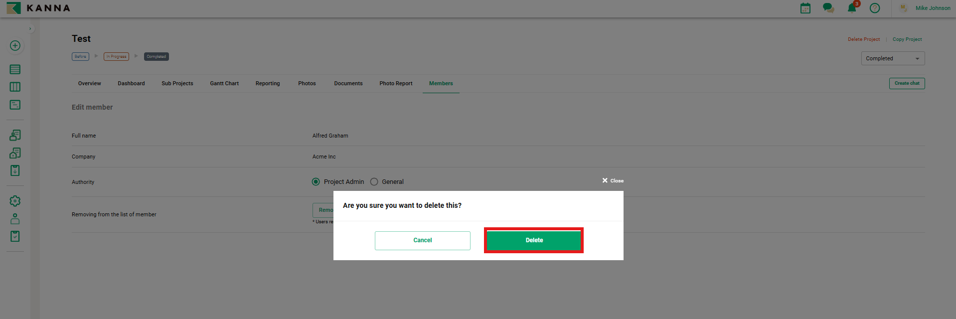 Catatan: Setelah anggota dihapus dari proyek, anggota umum dari perusahaan Anda dan anggota eksternal tidak akan lagi memiliki akses ke informasi terkait proyek.