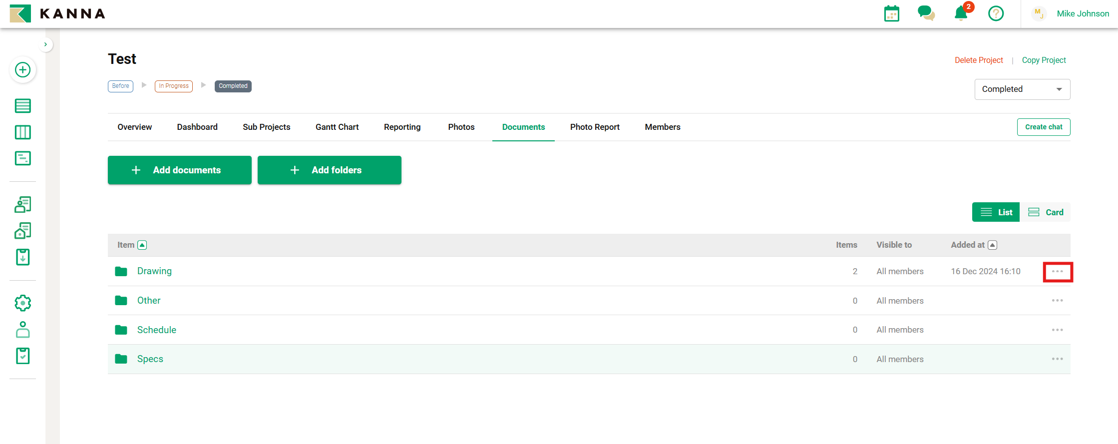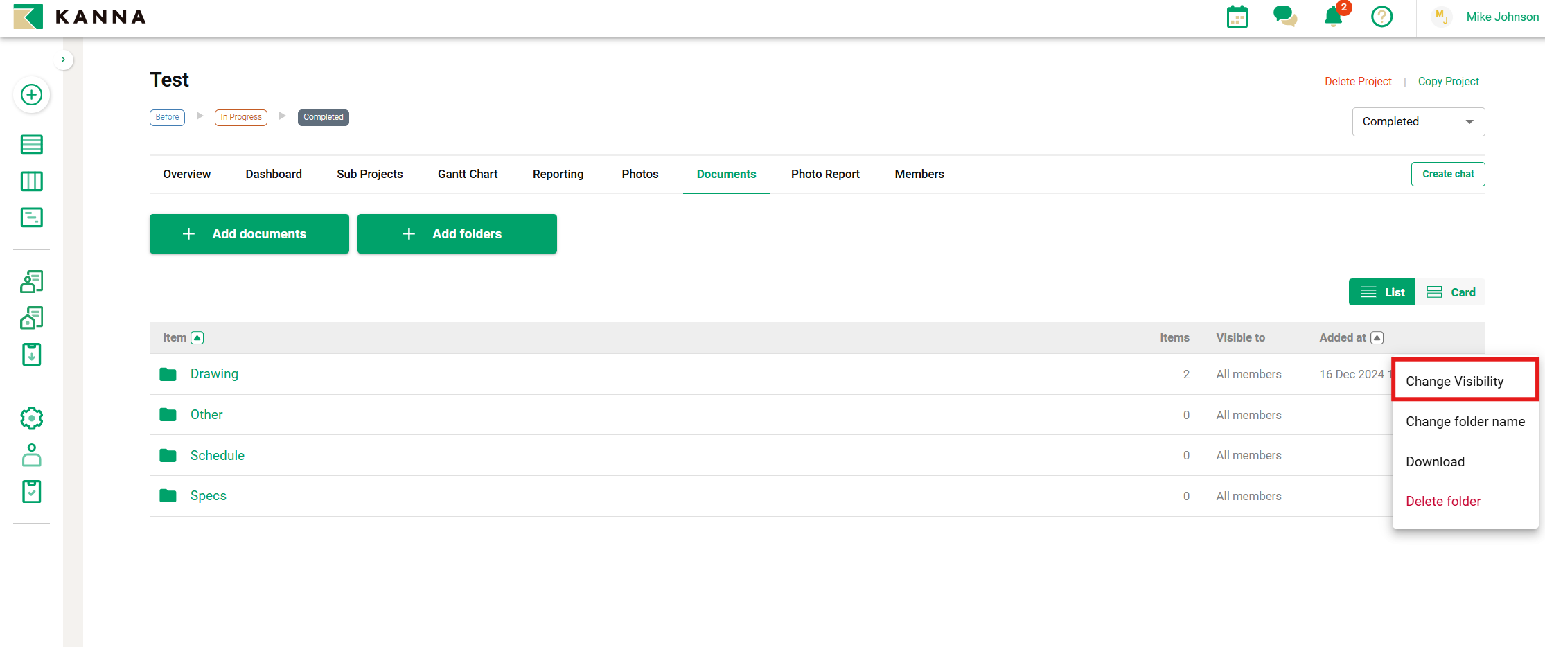 Di setiap proyek, Anda dapat mengubah pengaturan visibilitas untuk folder foto/dokumen.