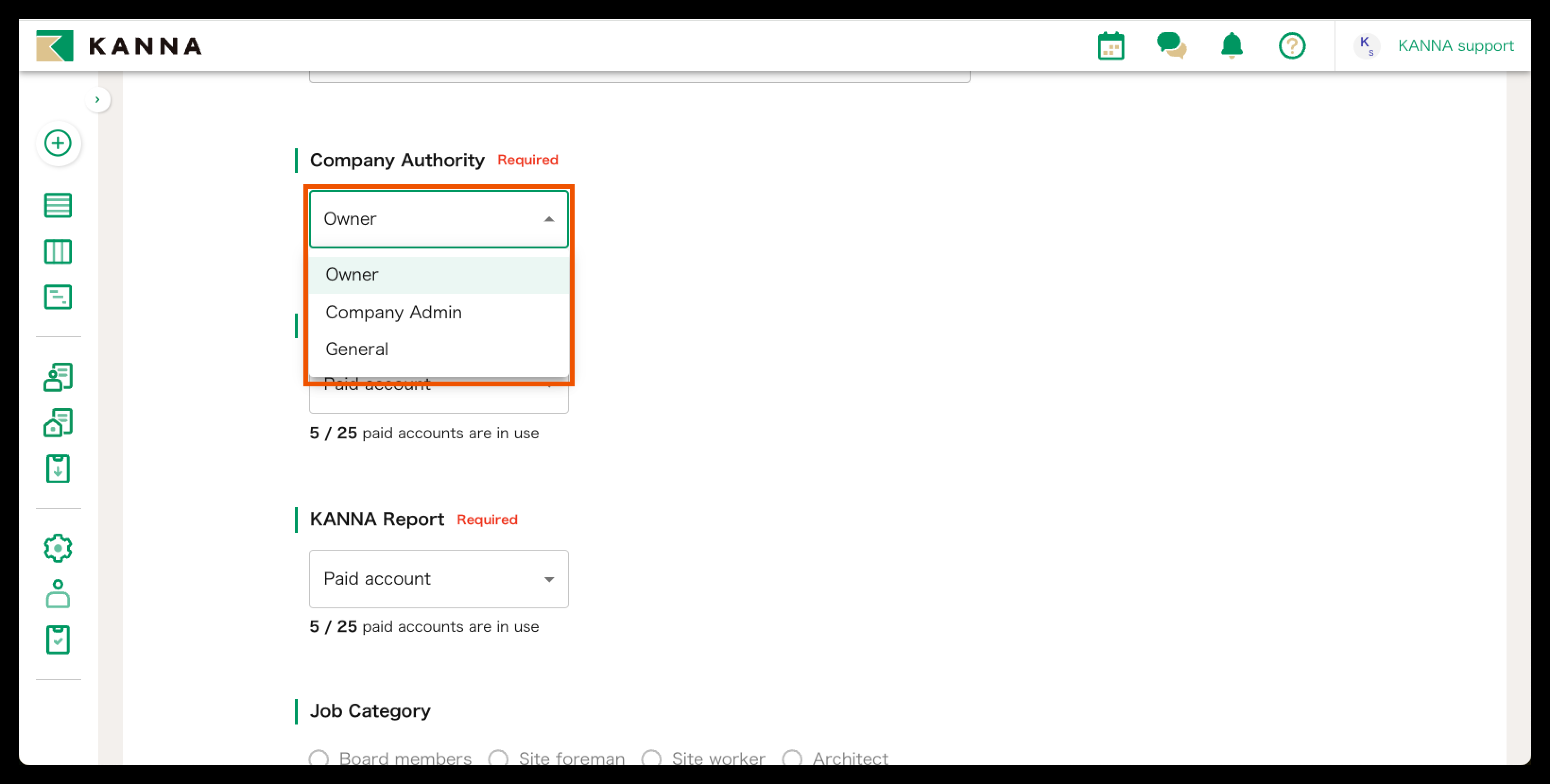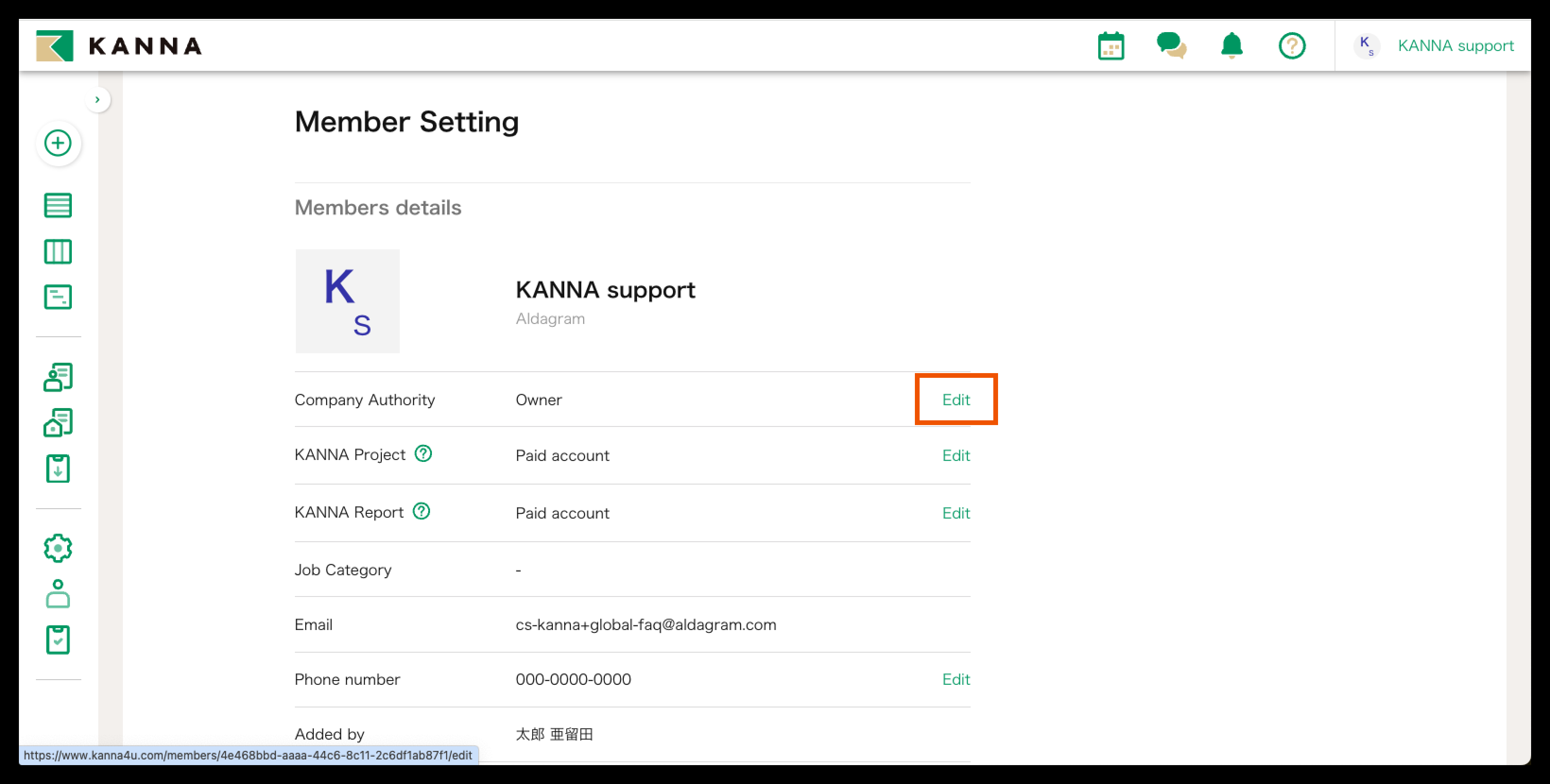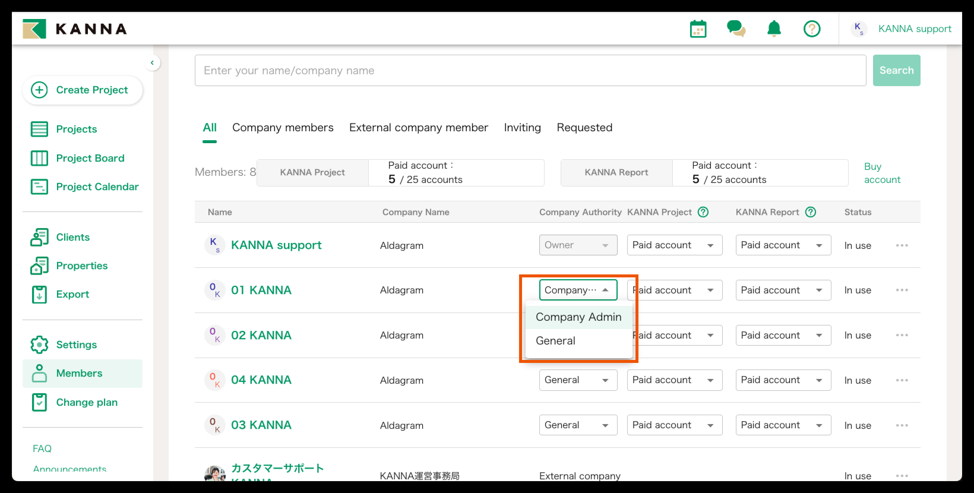 Pemilik dapat mengubah anggota perusahaan menjadi "Pemilik", "Administrator Perusahaan", dan "Umum".