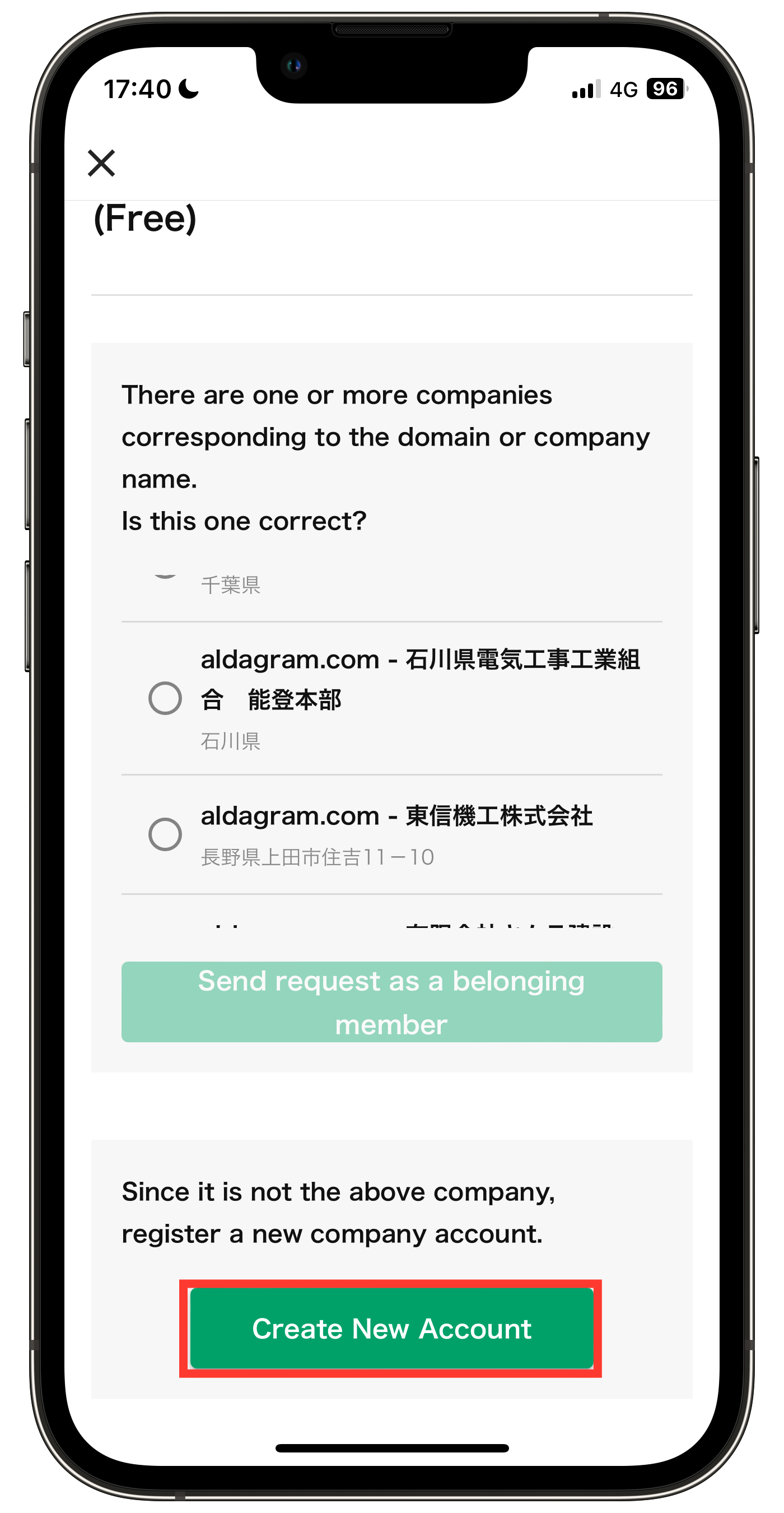 Jika domain email cocok dengan akun yang sudah terdaftar, akun perusahaan yang ada akan muncul sebagai saran. Harap pastikan bahwa nama perusahaan Anda tidak terdaftar sebelum melanjutkan dengan pendaftaran baru.