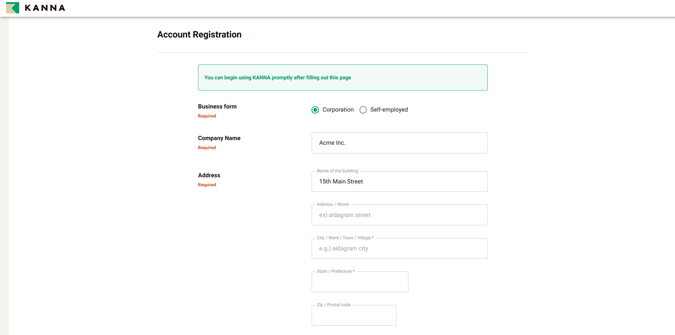 Masukkan detail berikut: Bentuk Bisnis, Nama Perusahaan, Alamat, Jumlah Karyawan, Jumlah situs, Nama Lengkap, Nomor Telepon, Kata Sandi (yang digunakan untuk login KANNA).