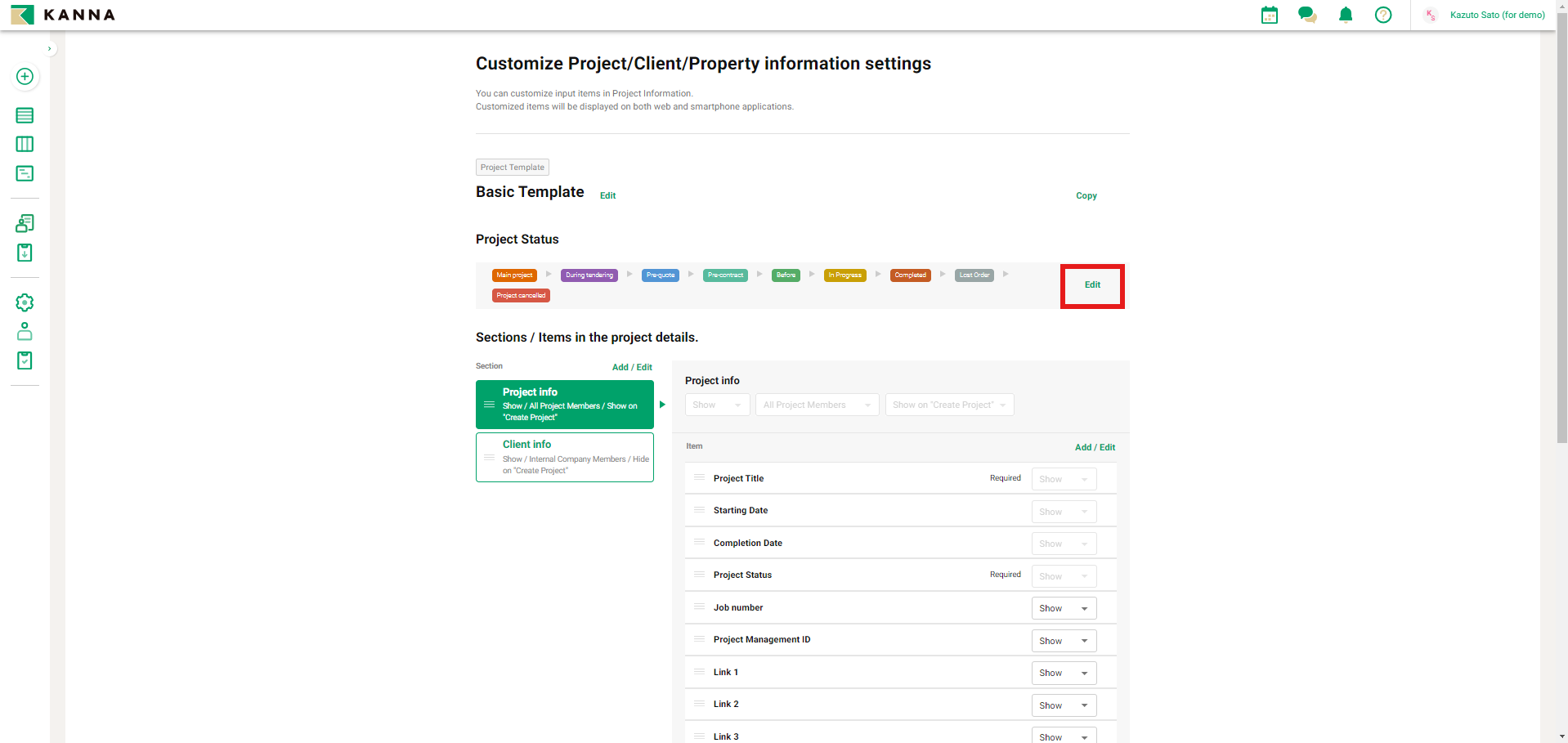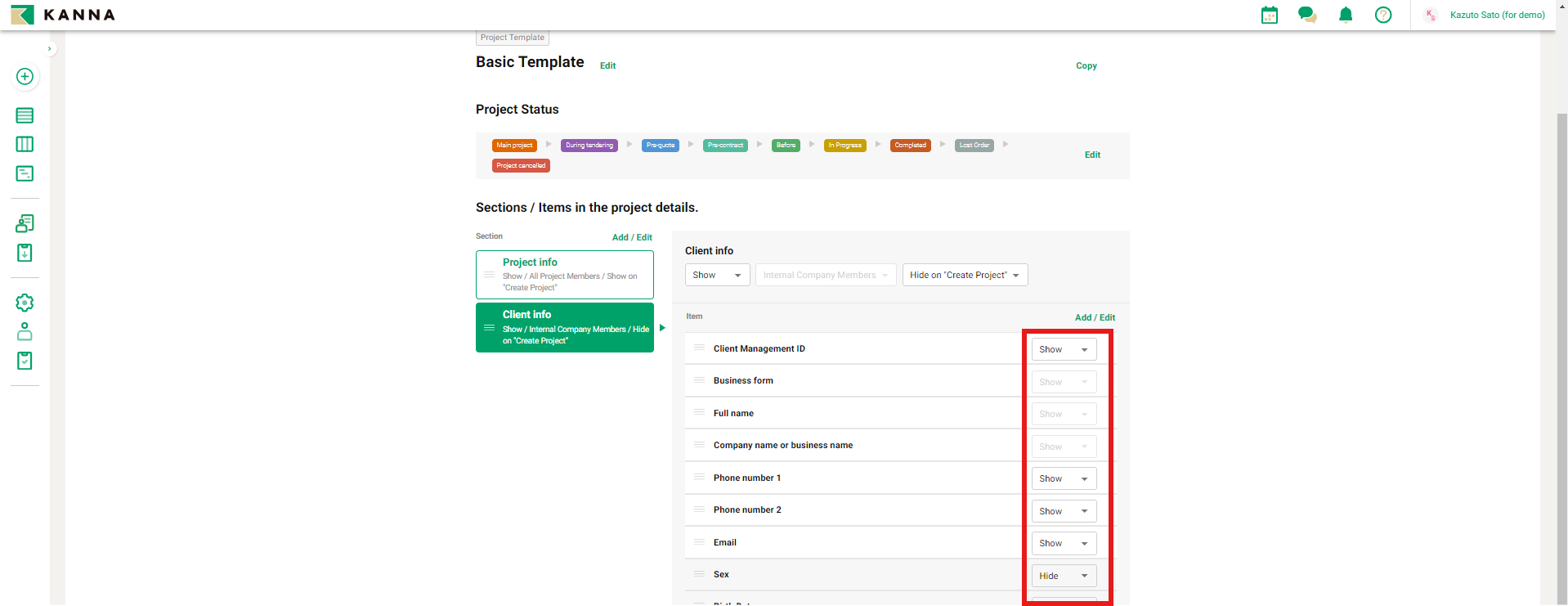 Anda dapat menampilkan, menyembunyikan, dan mengatur ulang item yang telah Anda kustomisasi di pengaturan master proyek, seperti informasi proyek/klien/properti, dalam setiap template.