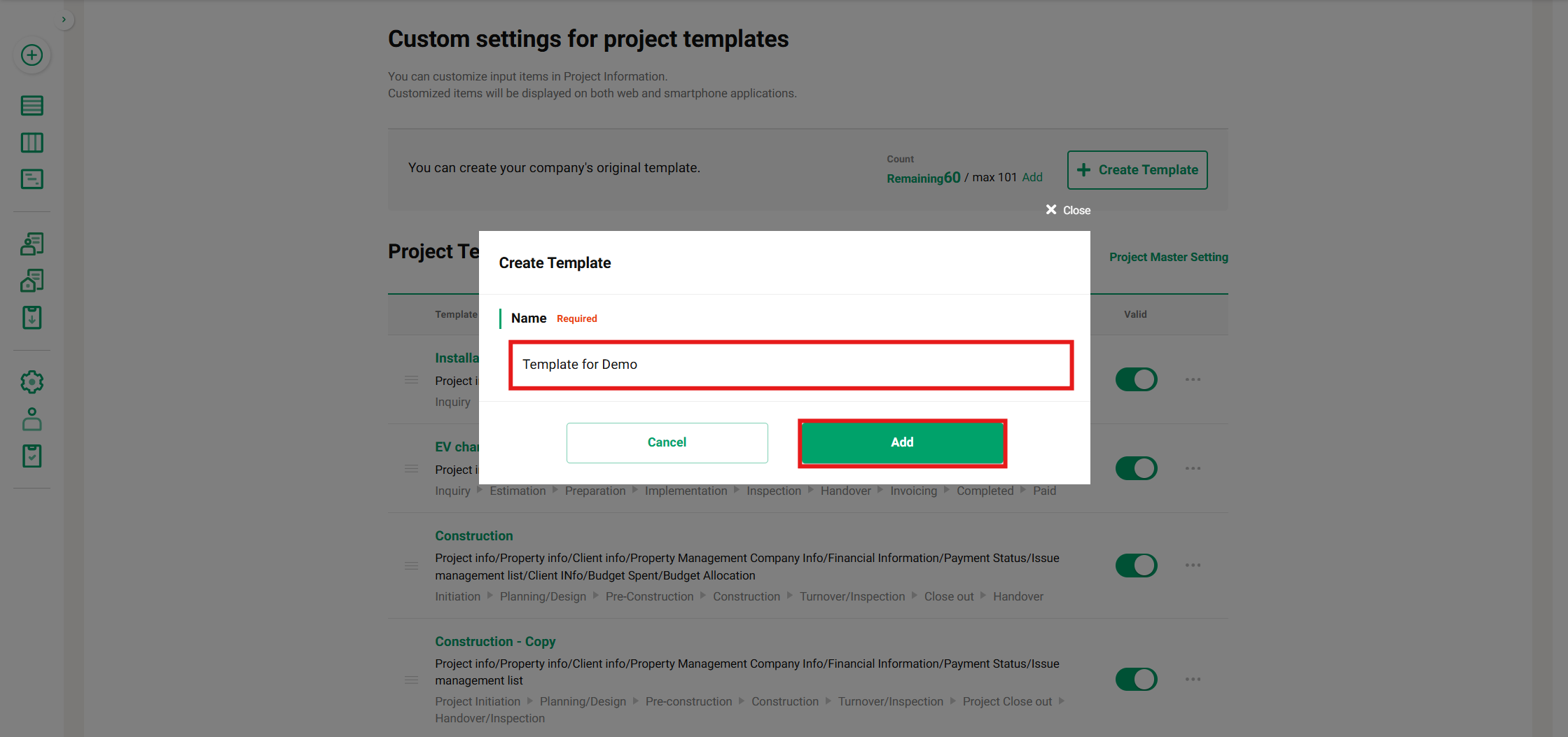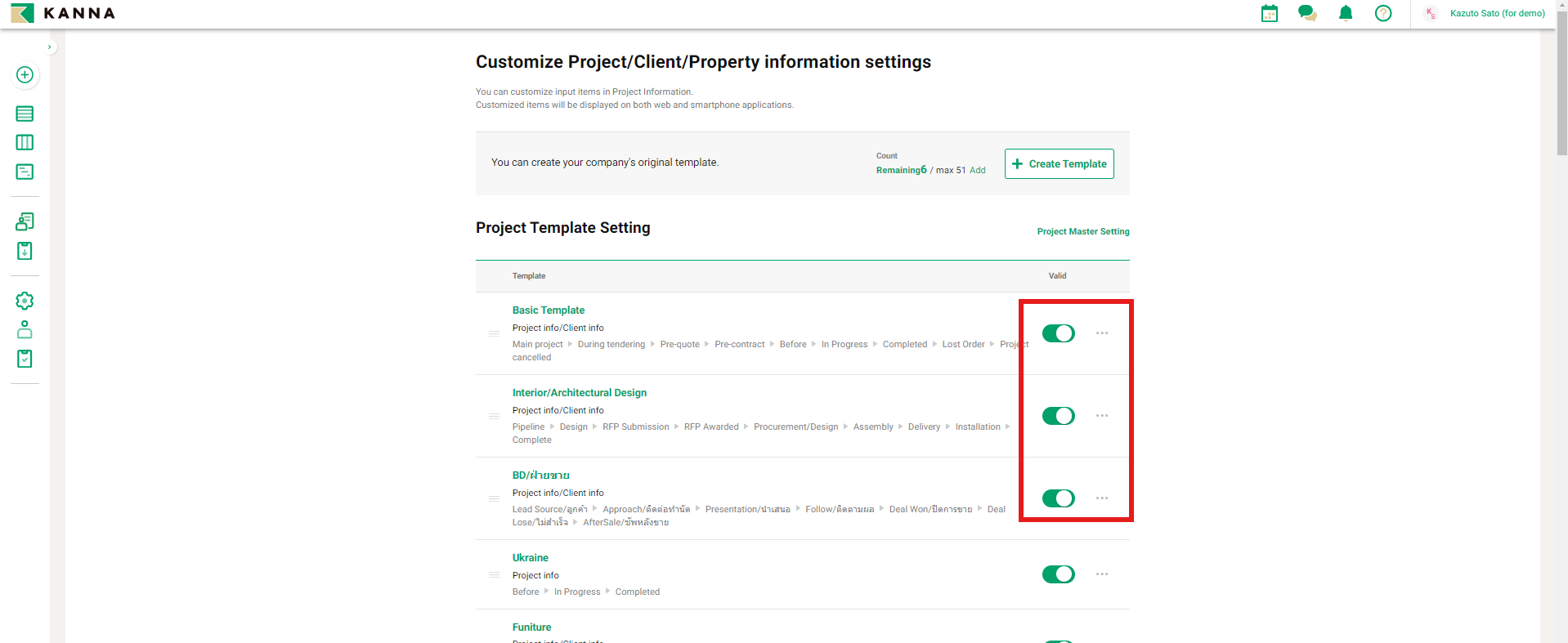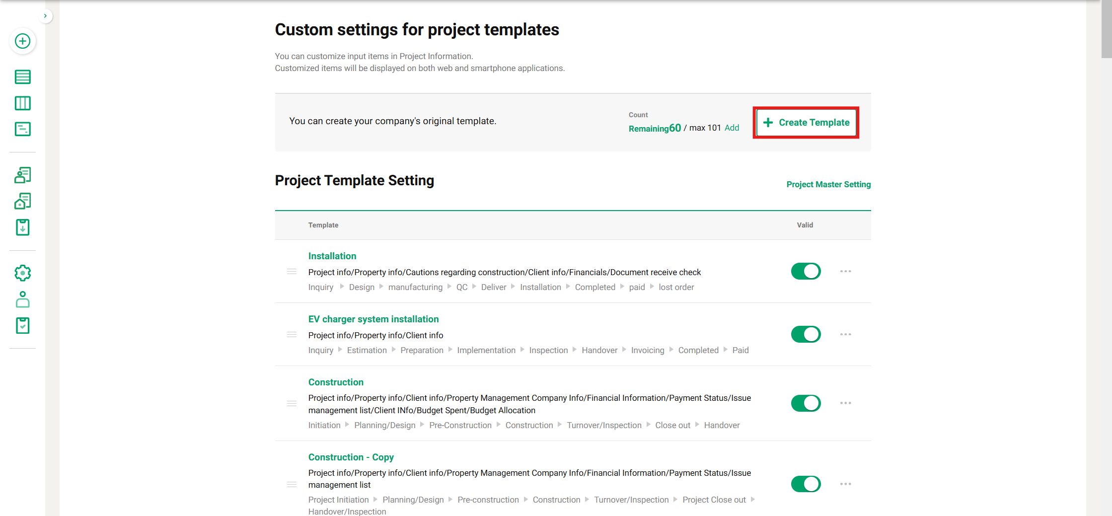 Anda dapat menambah/menghapus/mengatur ulang status proyek pada setiap template proyek.