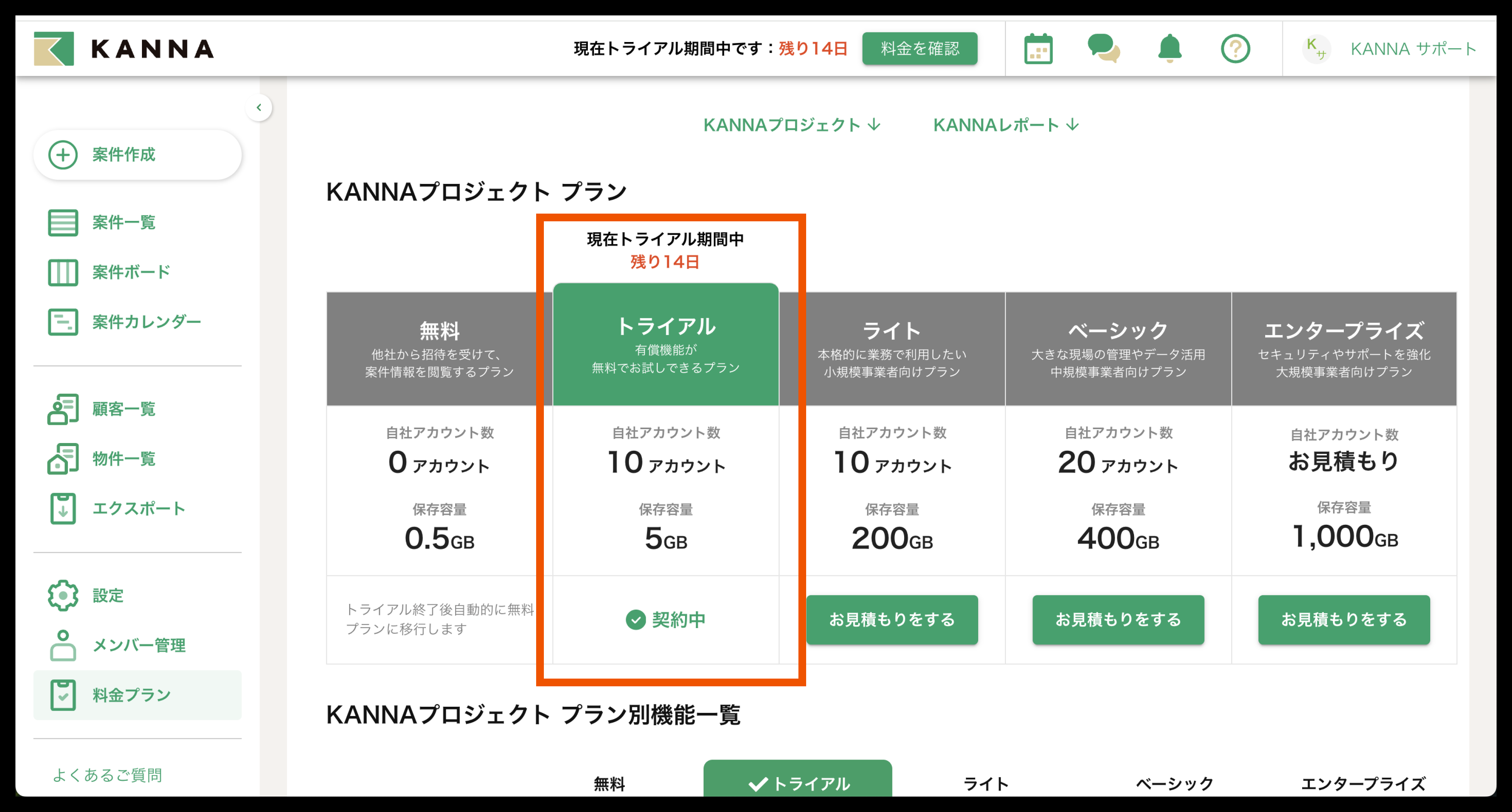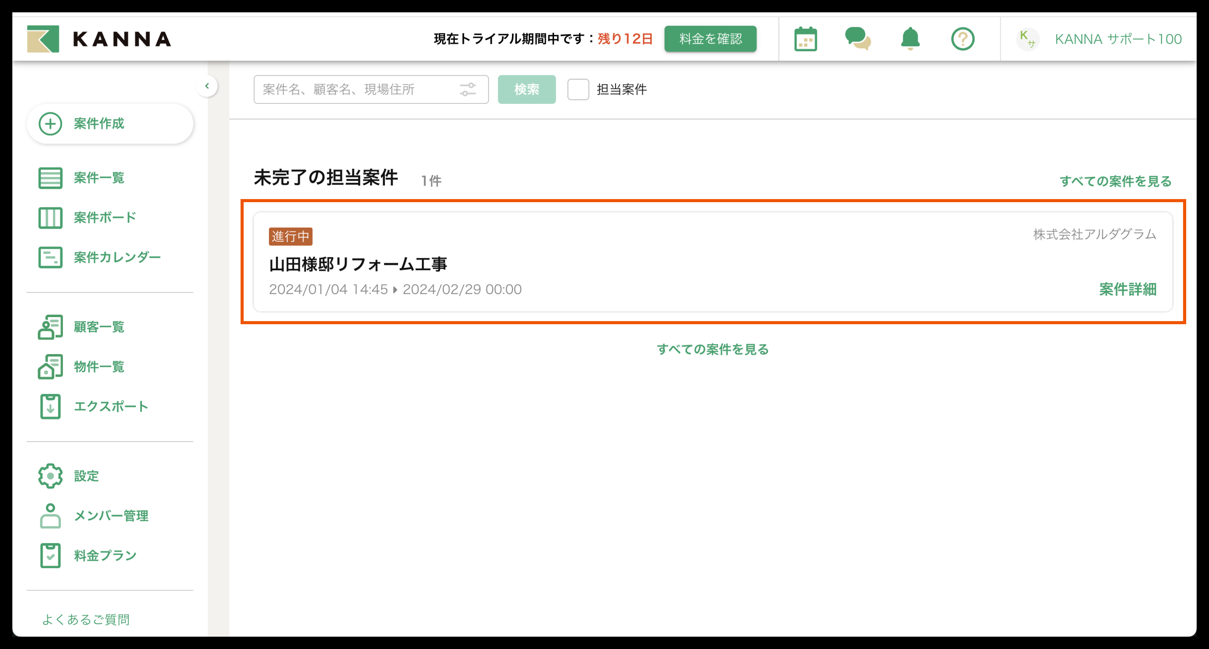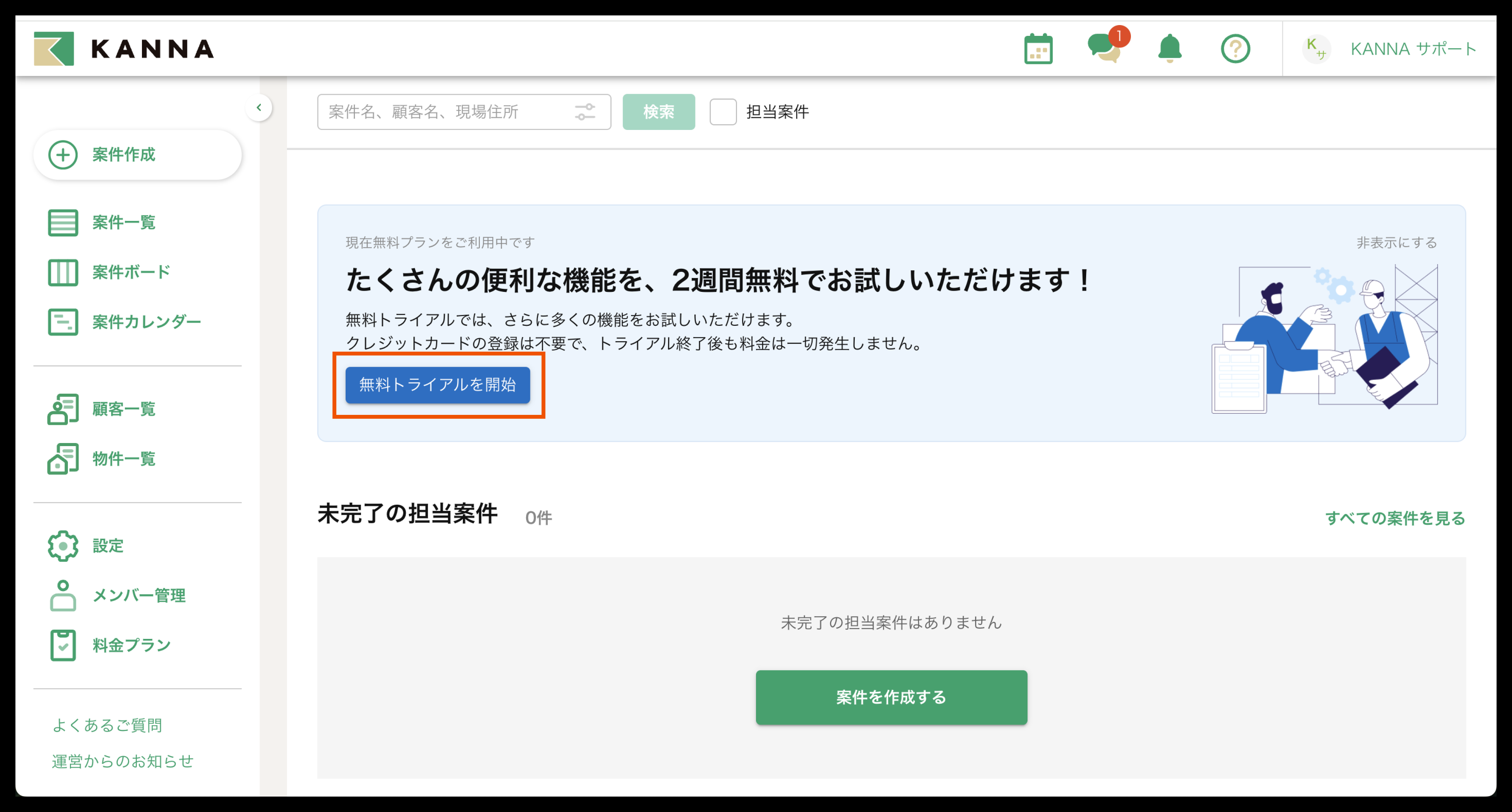 他社(KANNA有料会員)からの招待でアカウントを作成した場合は、任意のタイミングでトライアルを開始できます。※トライアルを開始しなくても招待元会社に追加された案件は閲覧可能です