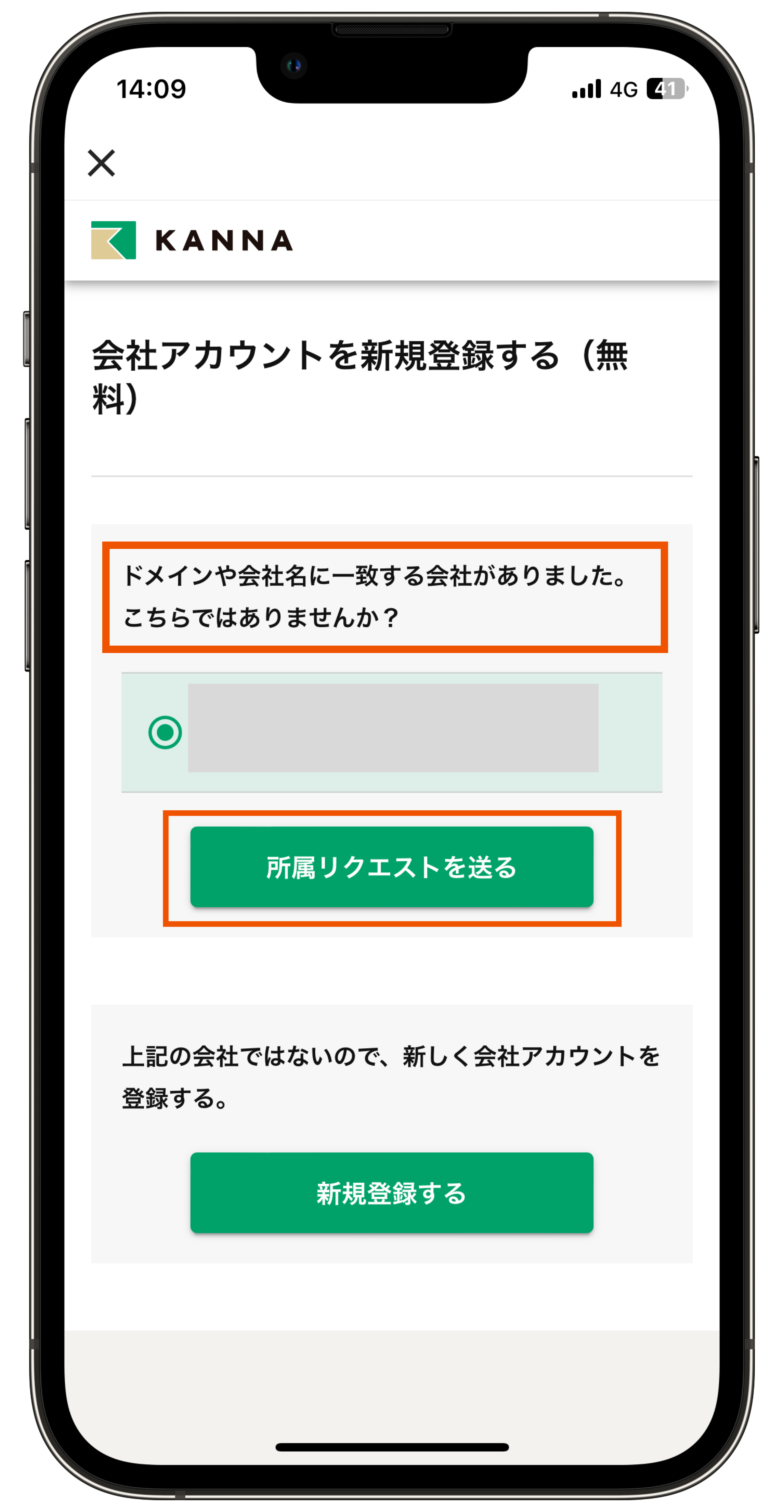 アカウント情報として会社名やメールアドレスを入力した際に、すでにKANNAに登録されている情報(同じ会社でKANNAのアカウントを持っている人がいる)の場合、以下の画像のように「ドメインや会社名に一致する会社がありました。こちらではありませんか?」と表示されます。