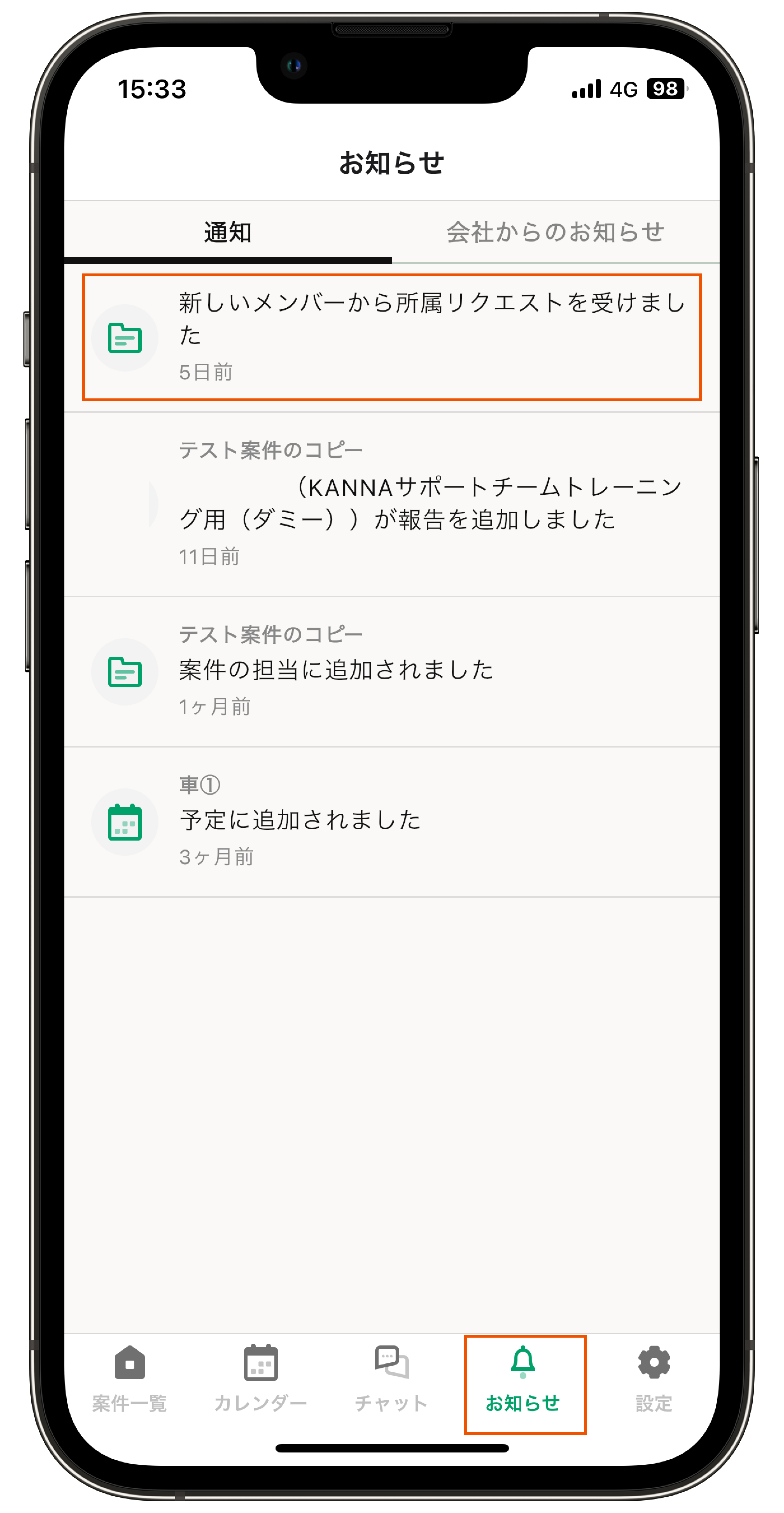 1. お知らせ(ベルマーク)から、【新しいメンバーから所属リクエストを受けました】をタップ