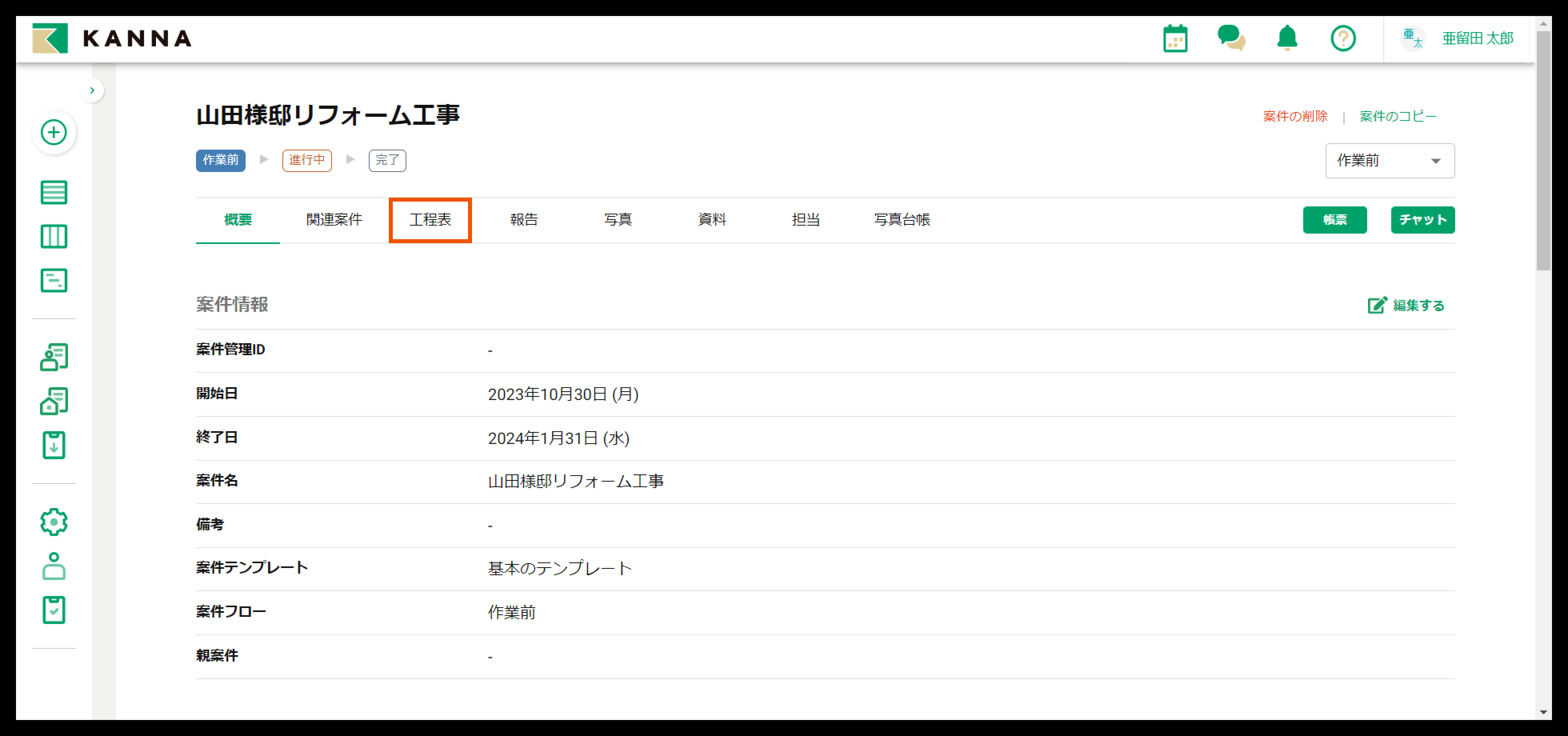 2. 第2階層以降の案件の「開始/終了日」または「開始/終了実績日」を入力