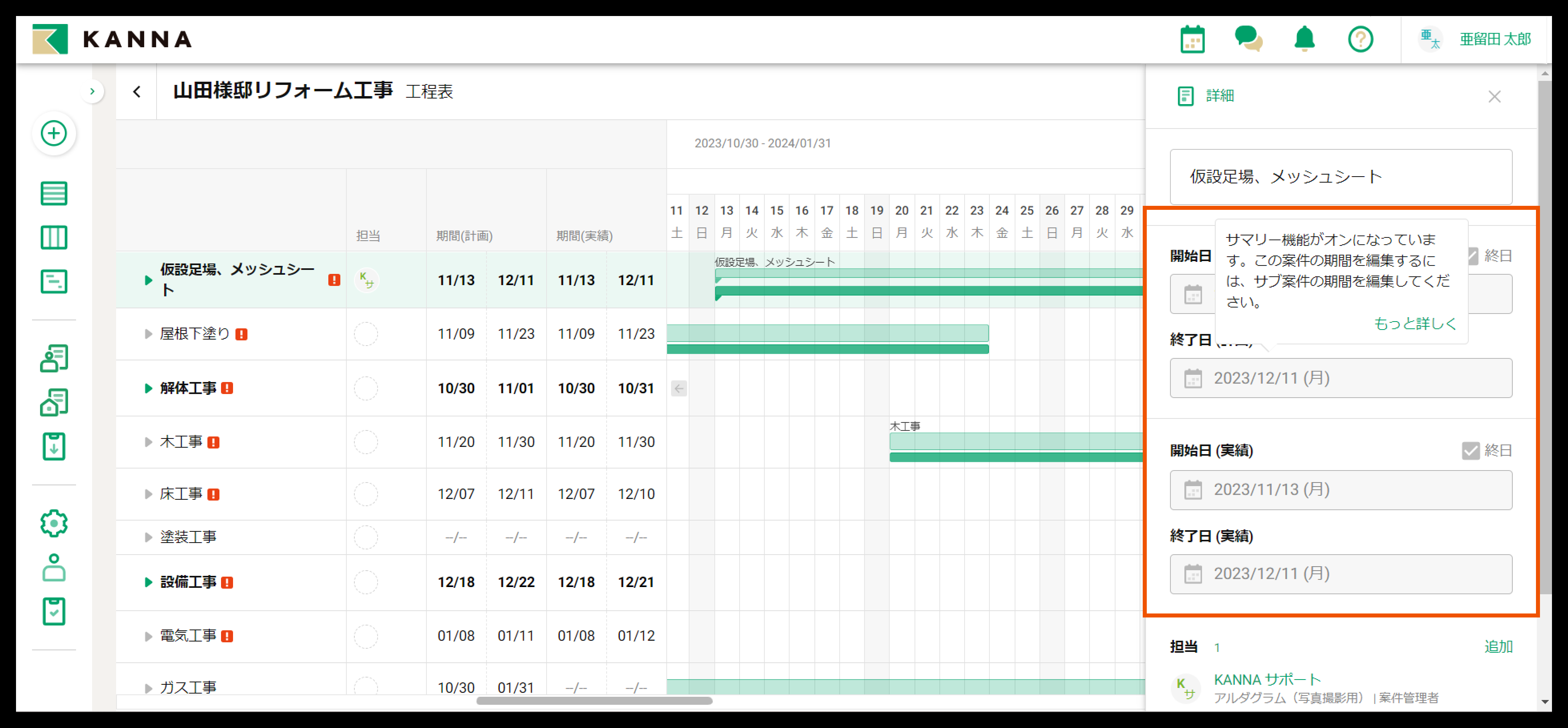 工程表のサマリー機能を有効にすると、第2階層案件の「開始/終了日」または「開始実績日/終了実績日」を直接編集できません。