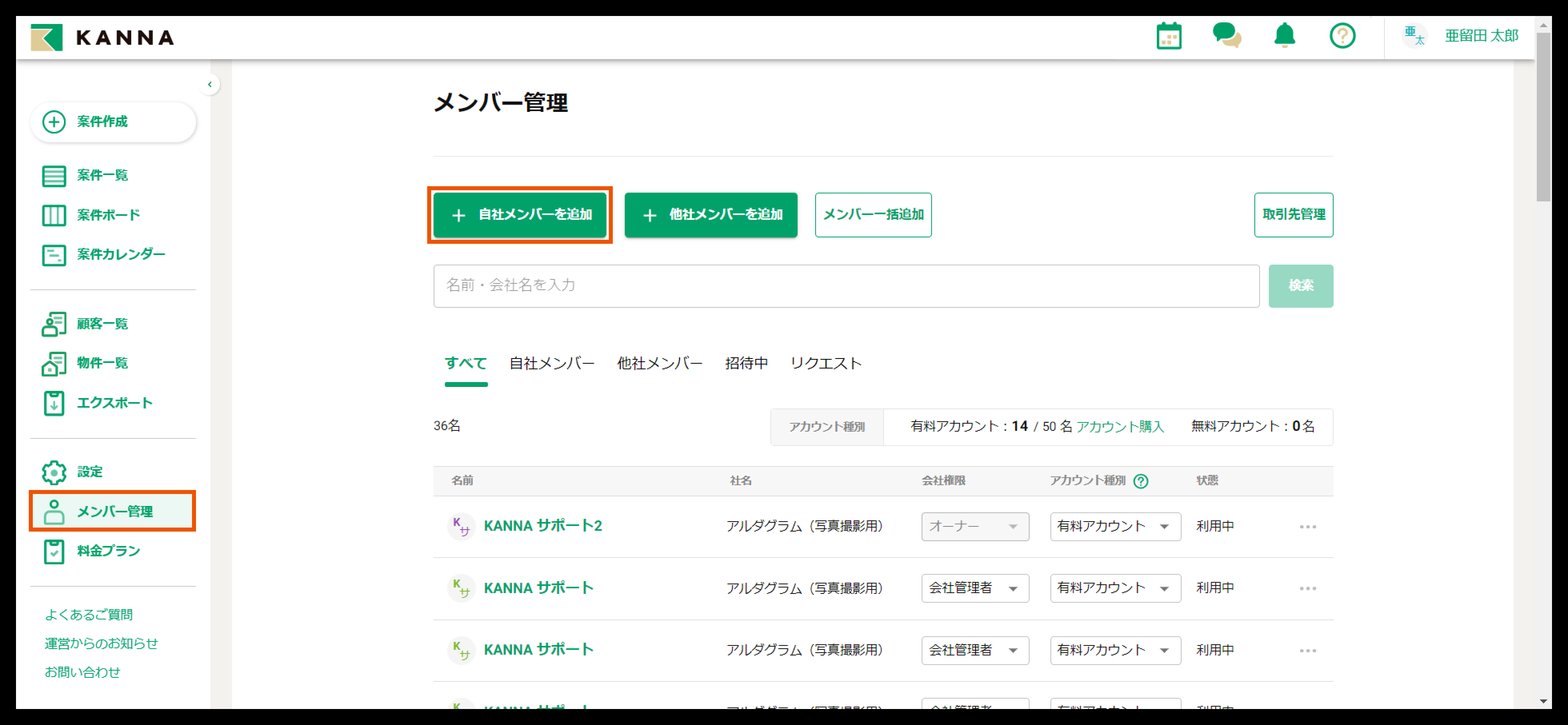 【メンバー管理】から【自社メンバーを追加】をクリックし招待
