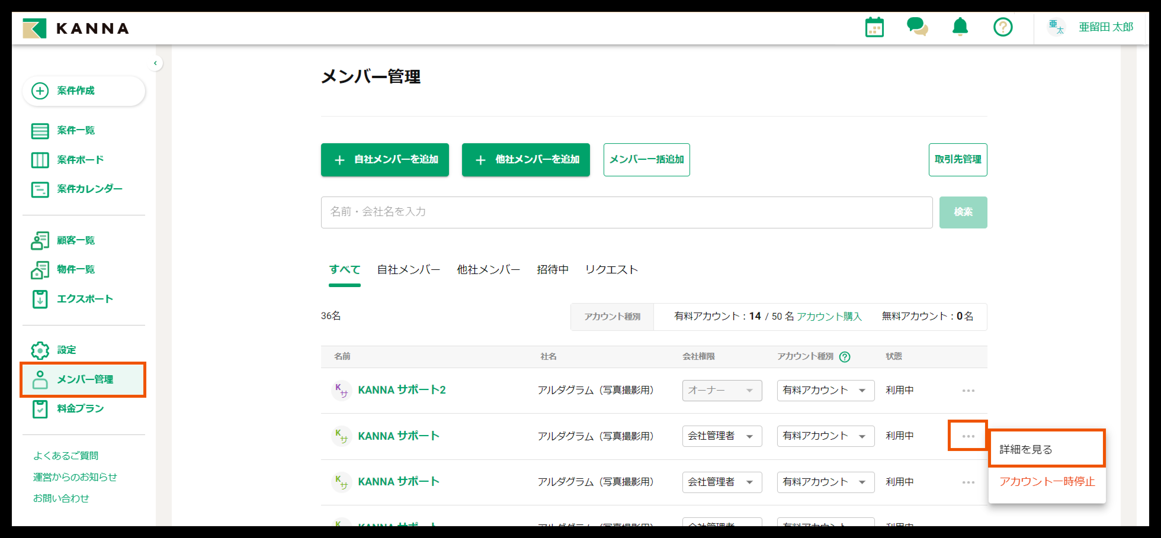 1. 【メンバー管理】を開き、削除したいメンバーの3点リーダーから【詳細を見る】をクリック