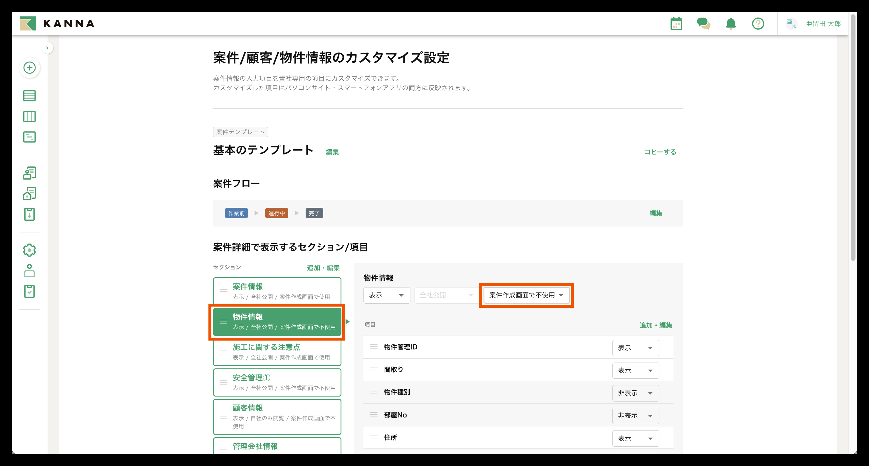 案件作成時に使用する入力項目を設定する