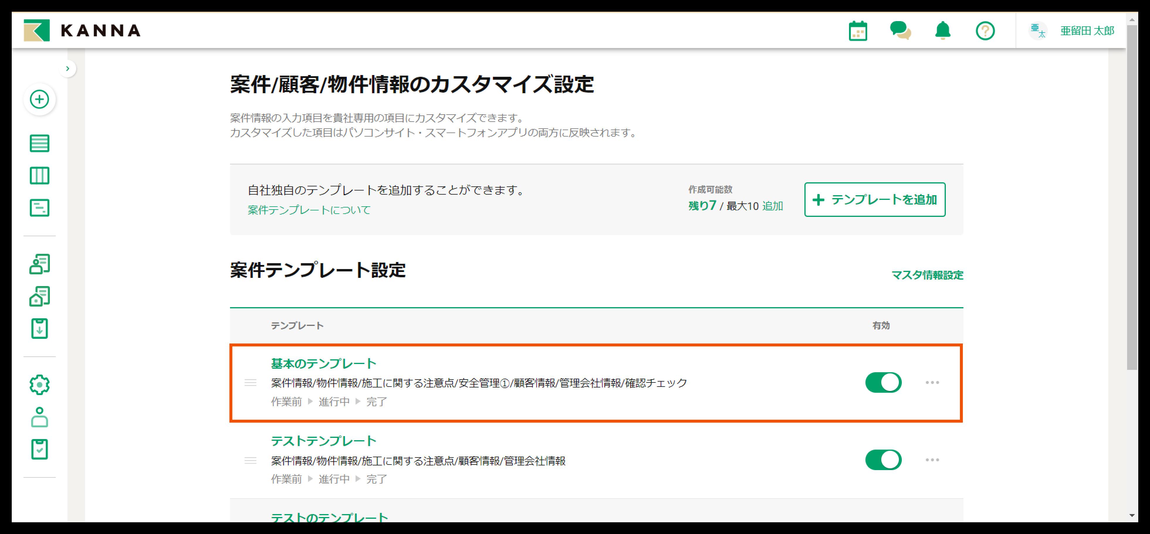 3. カスタマイズ設定したい案件テンプレートを選択