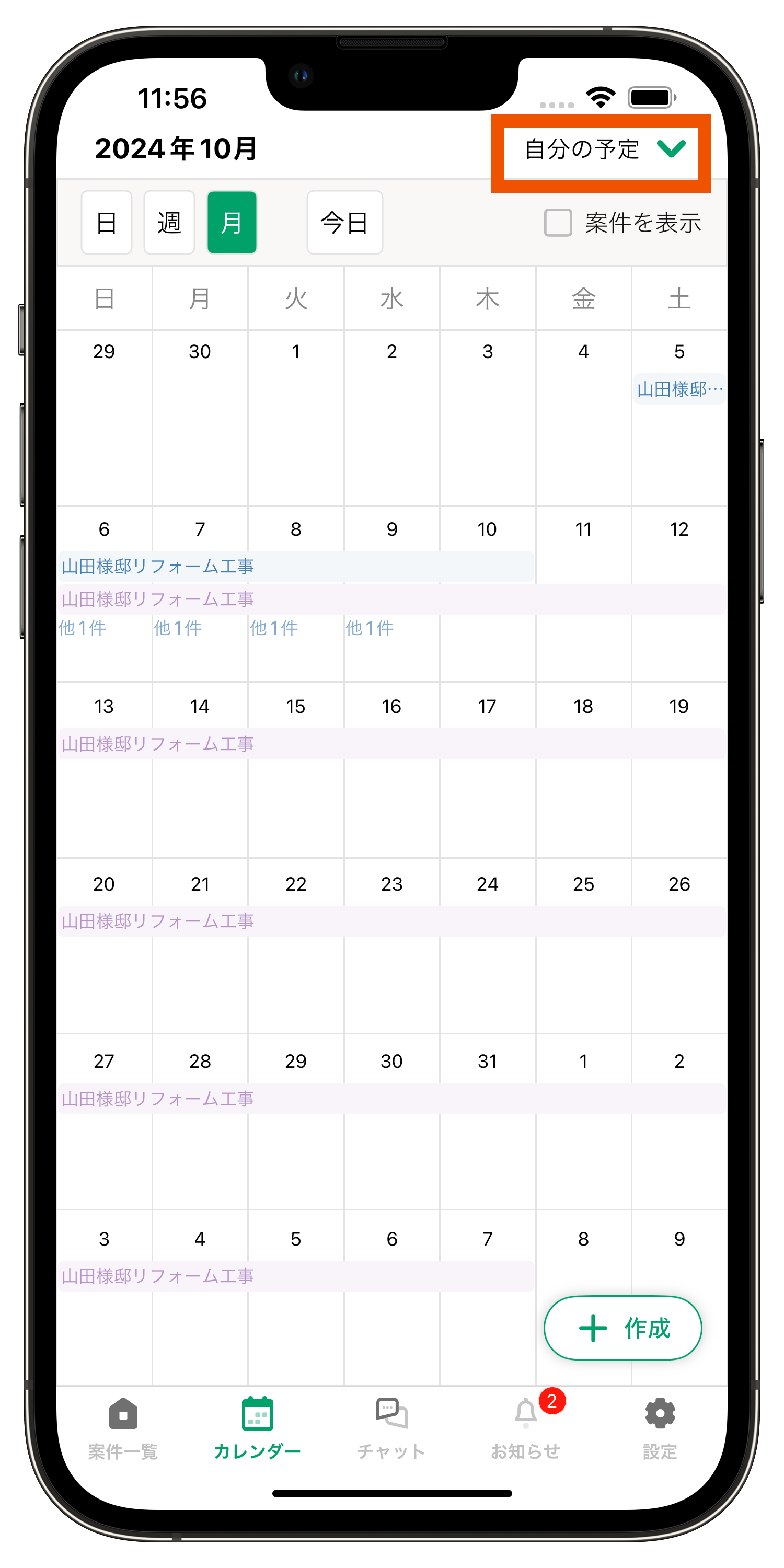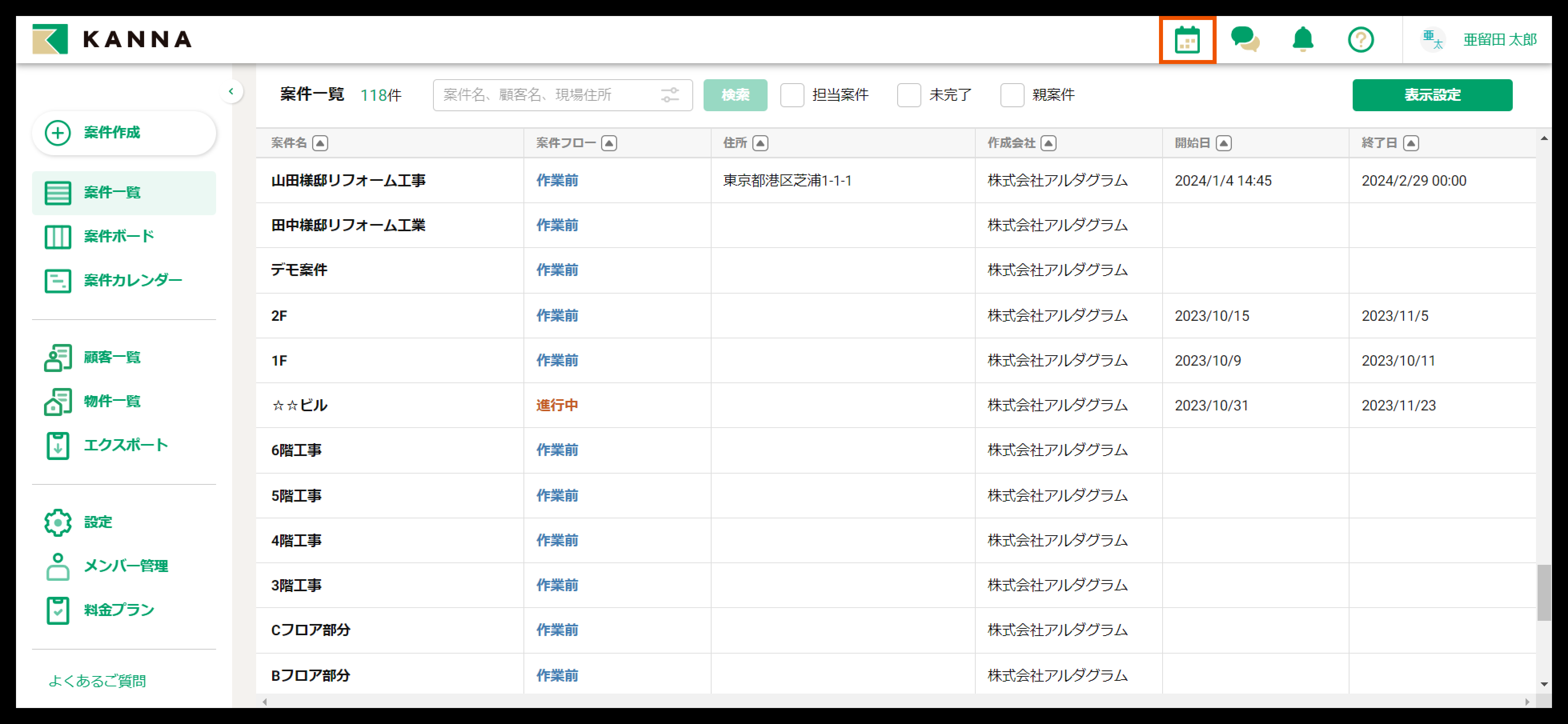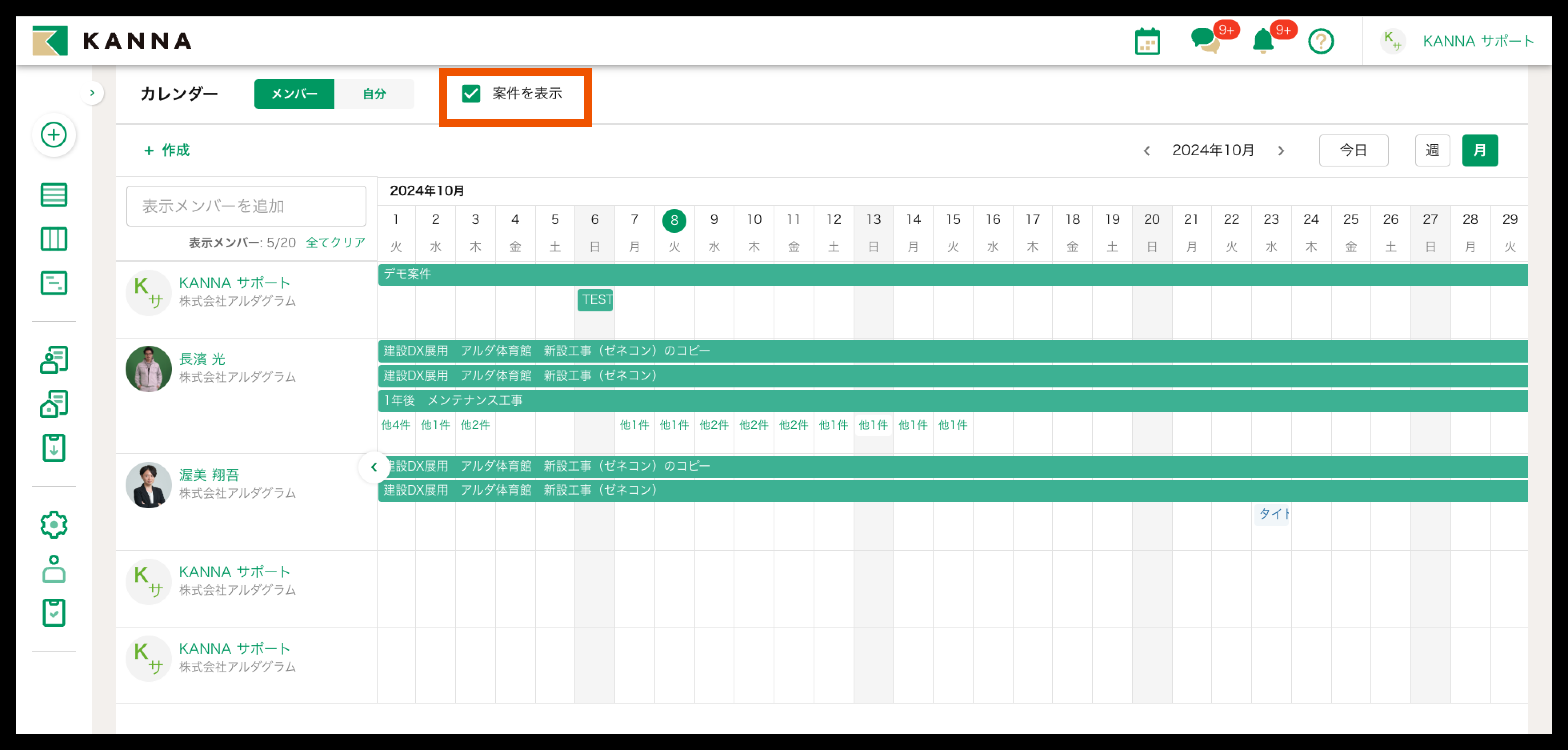 画面上部の【案件を表示】で、担当案件の工期の表示/非表示が切り替えられます。