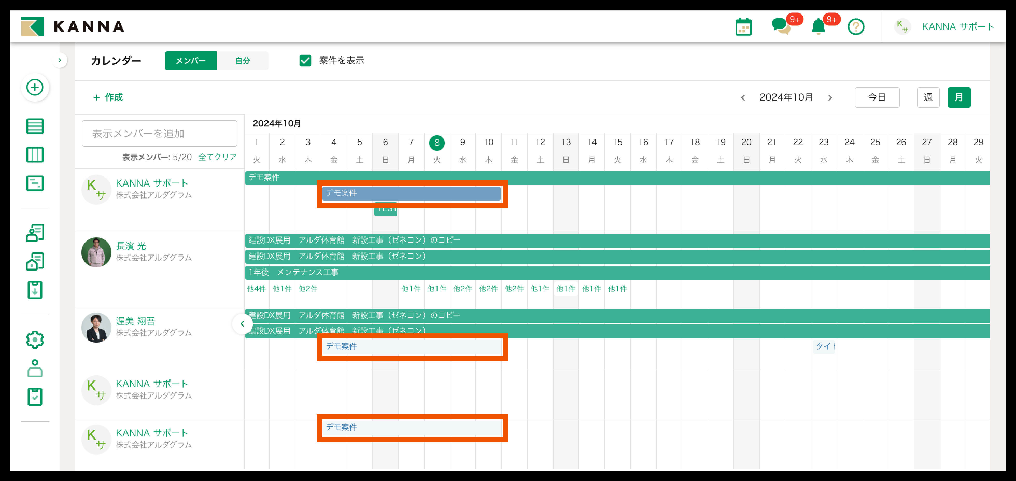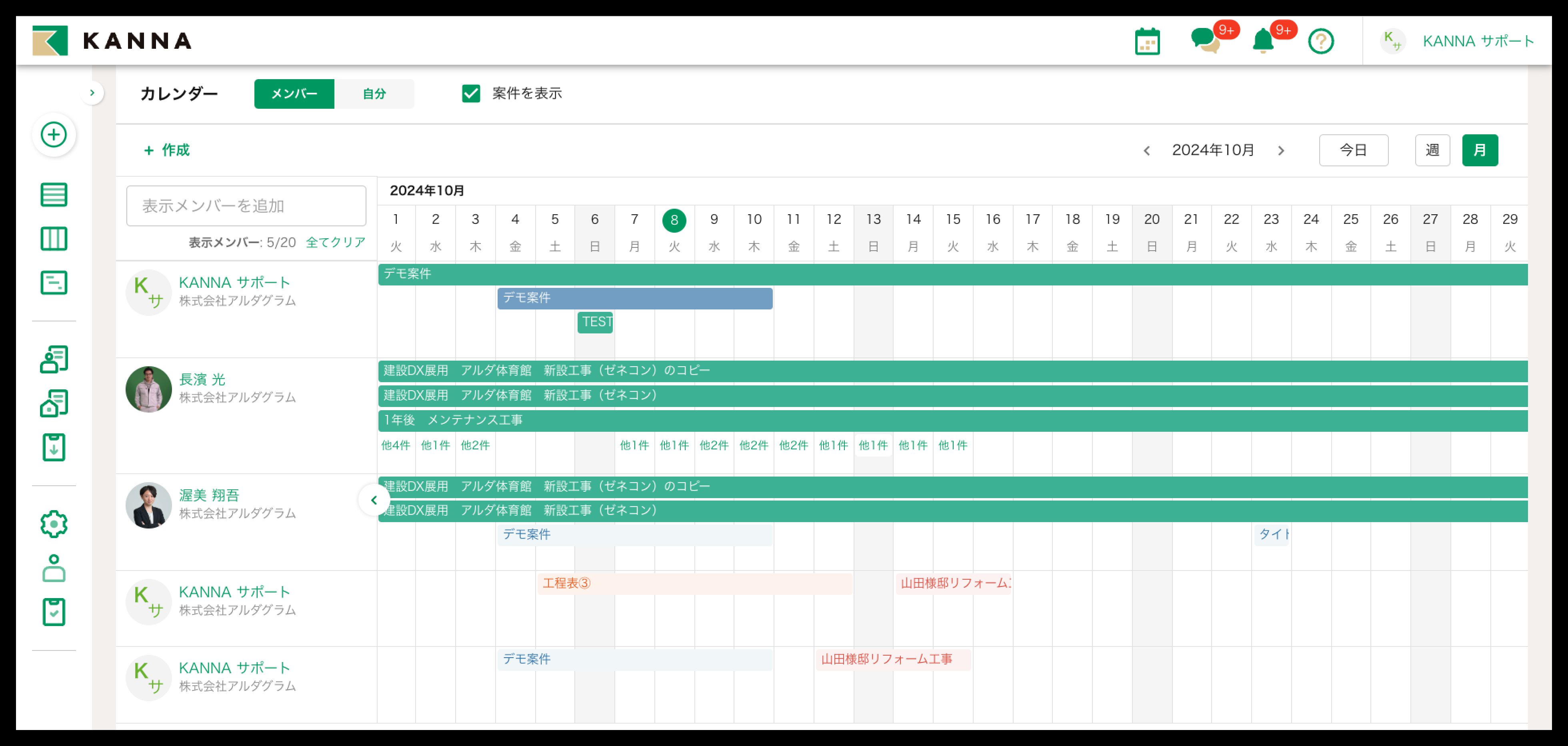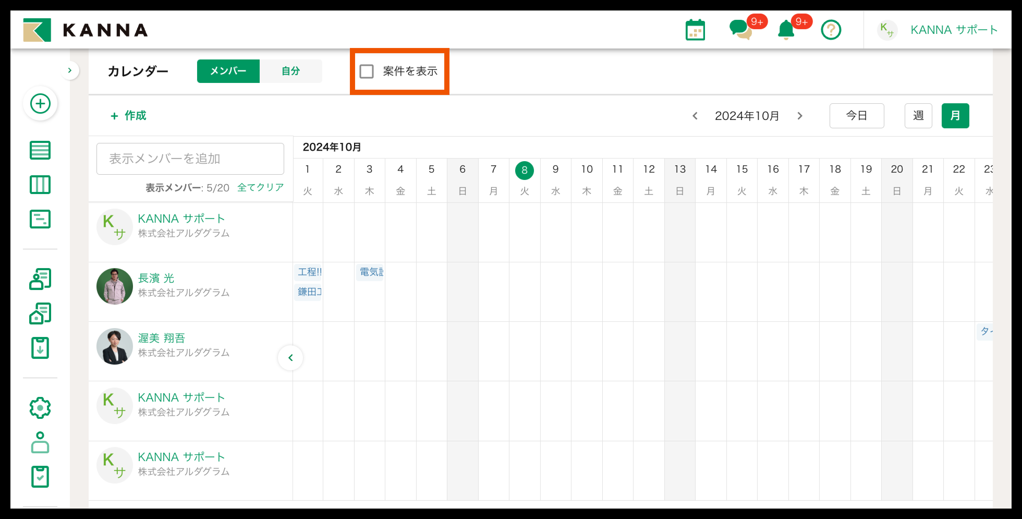 画面上部の【案件を表示】で、担当案件の工期の表示/非表示が切り替えられます。