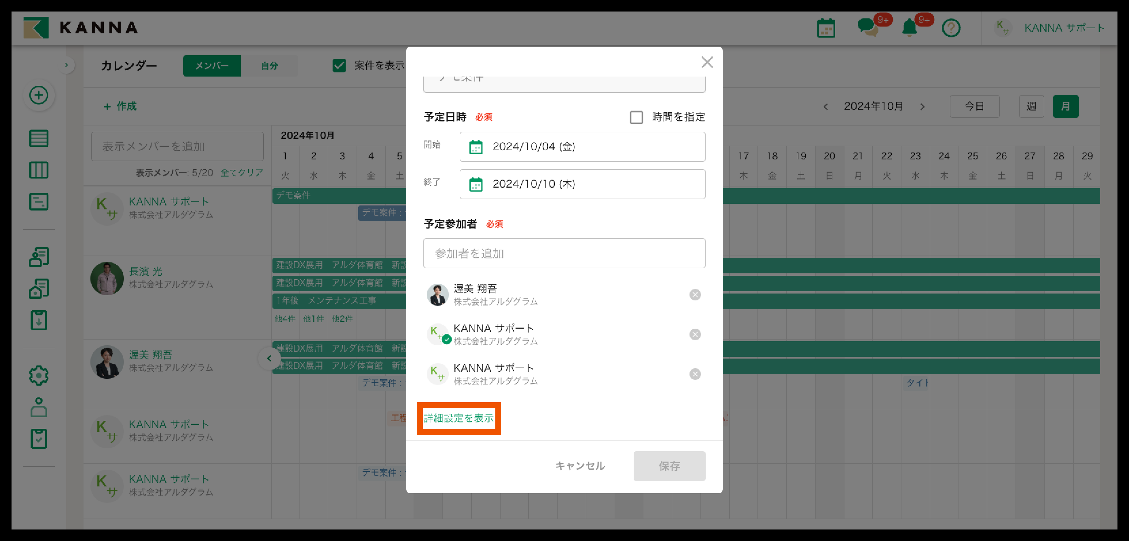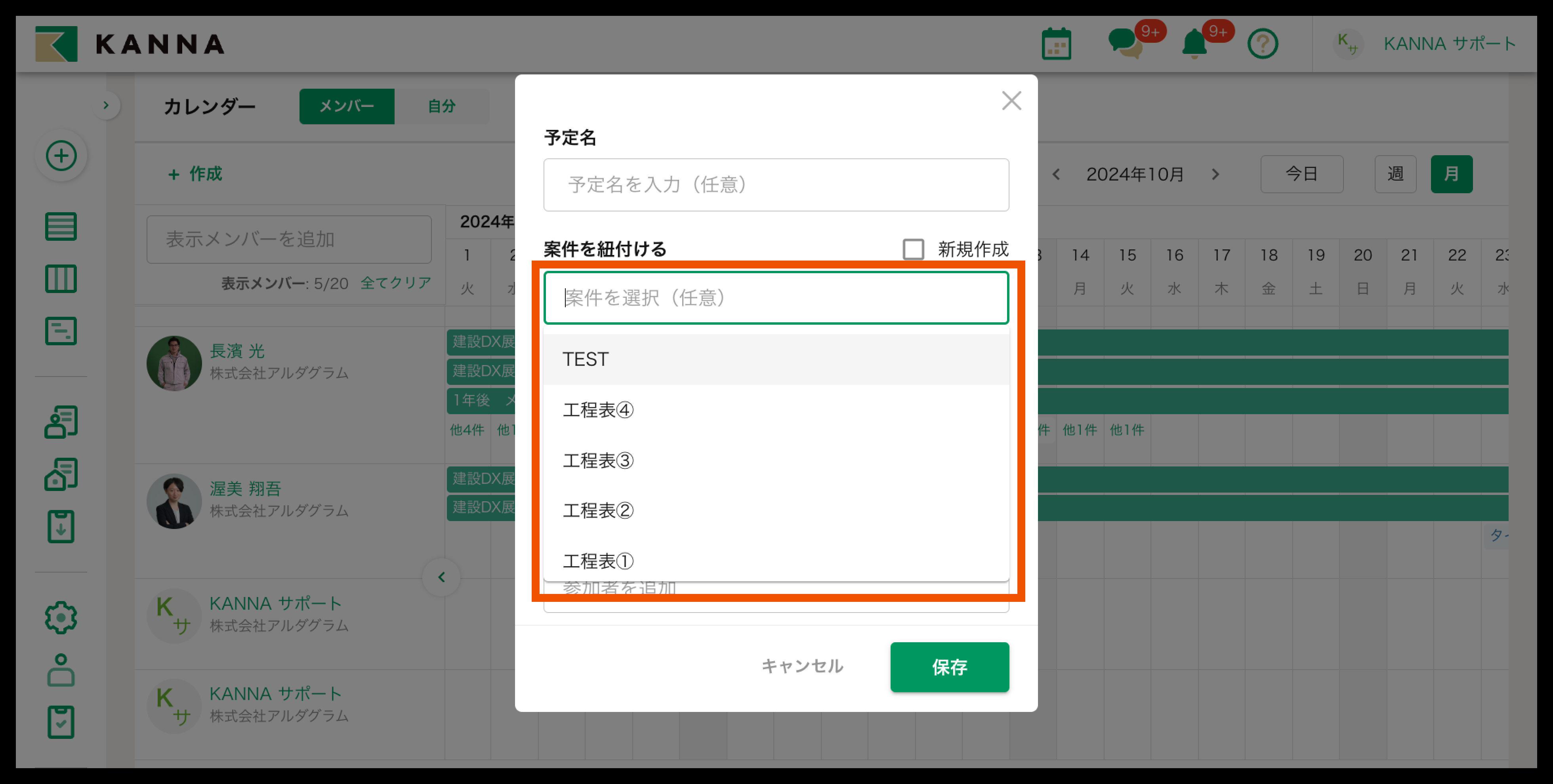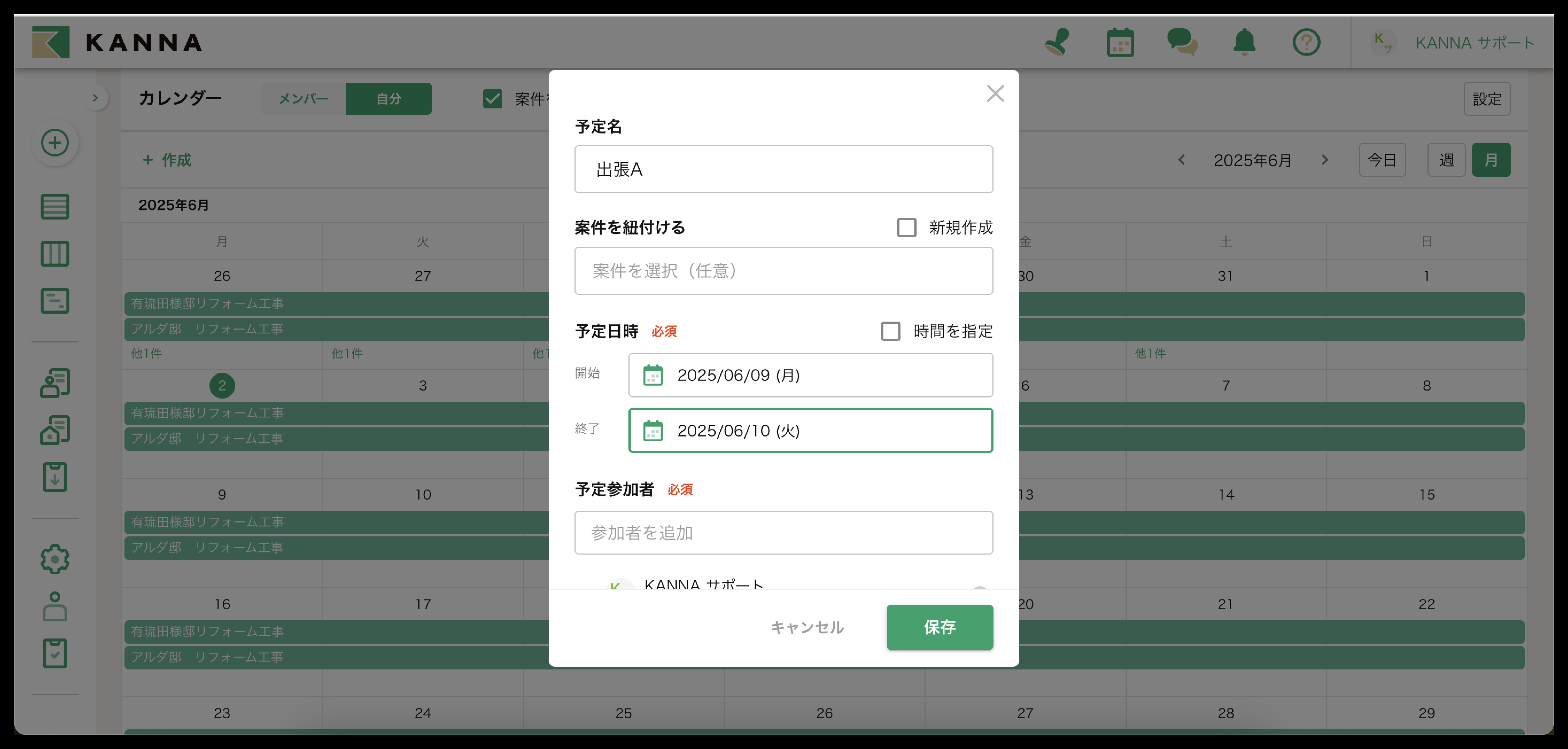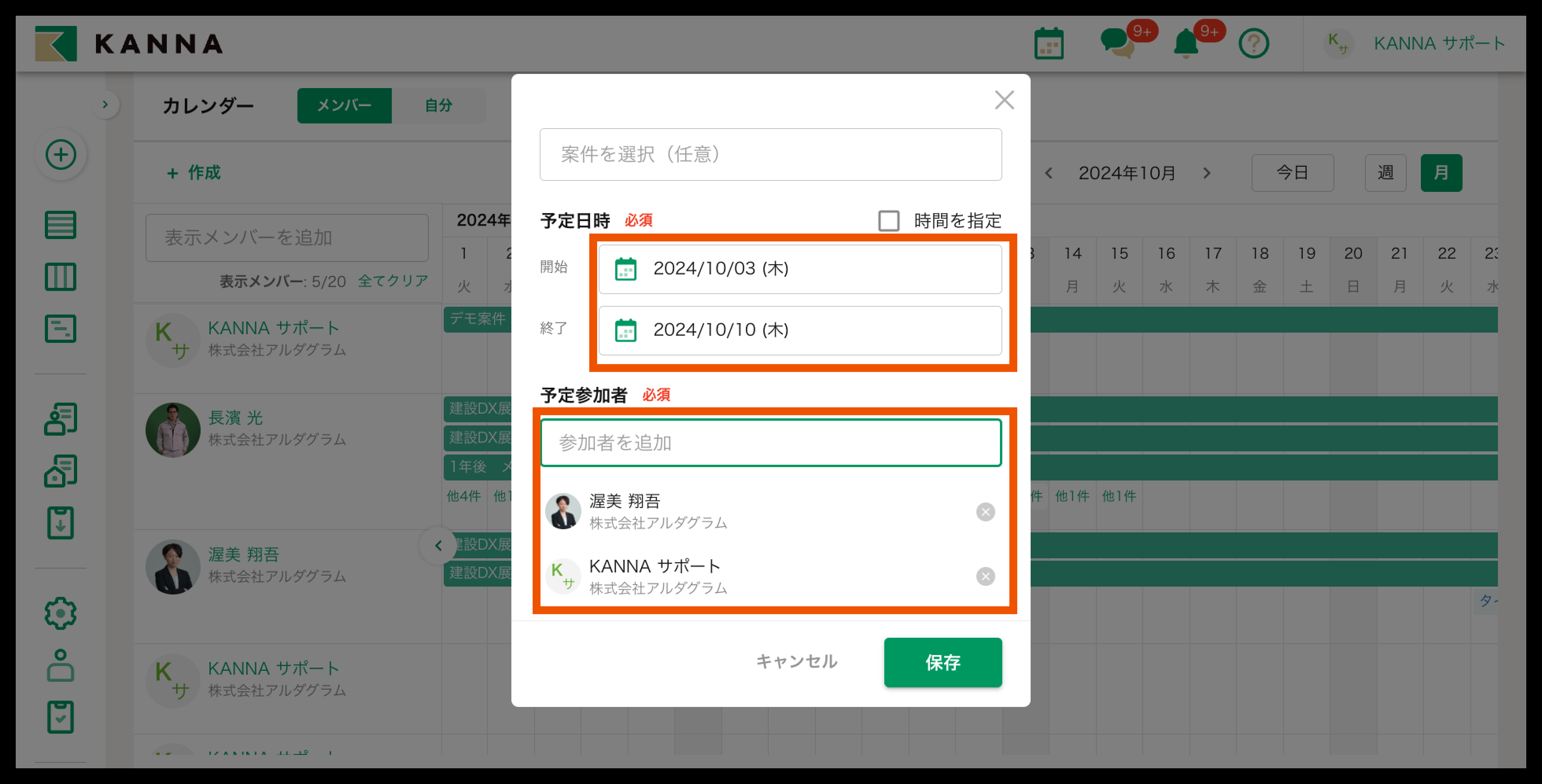 4. 予定日時、予定参加者(案件に差配したいメンバー)を選択後、【保存】をクリック