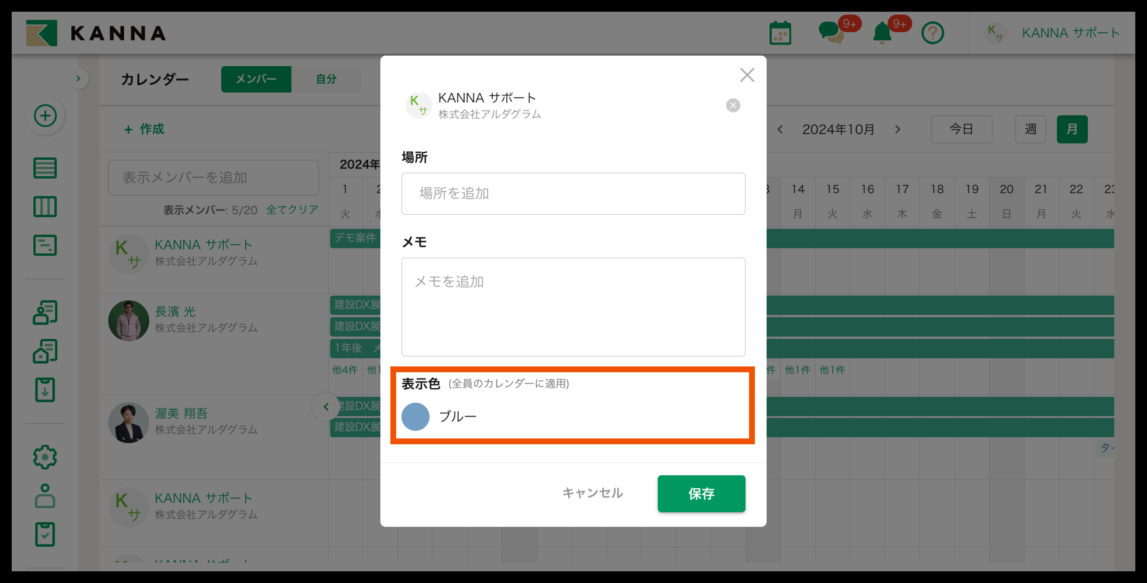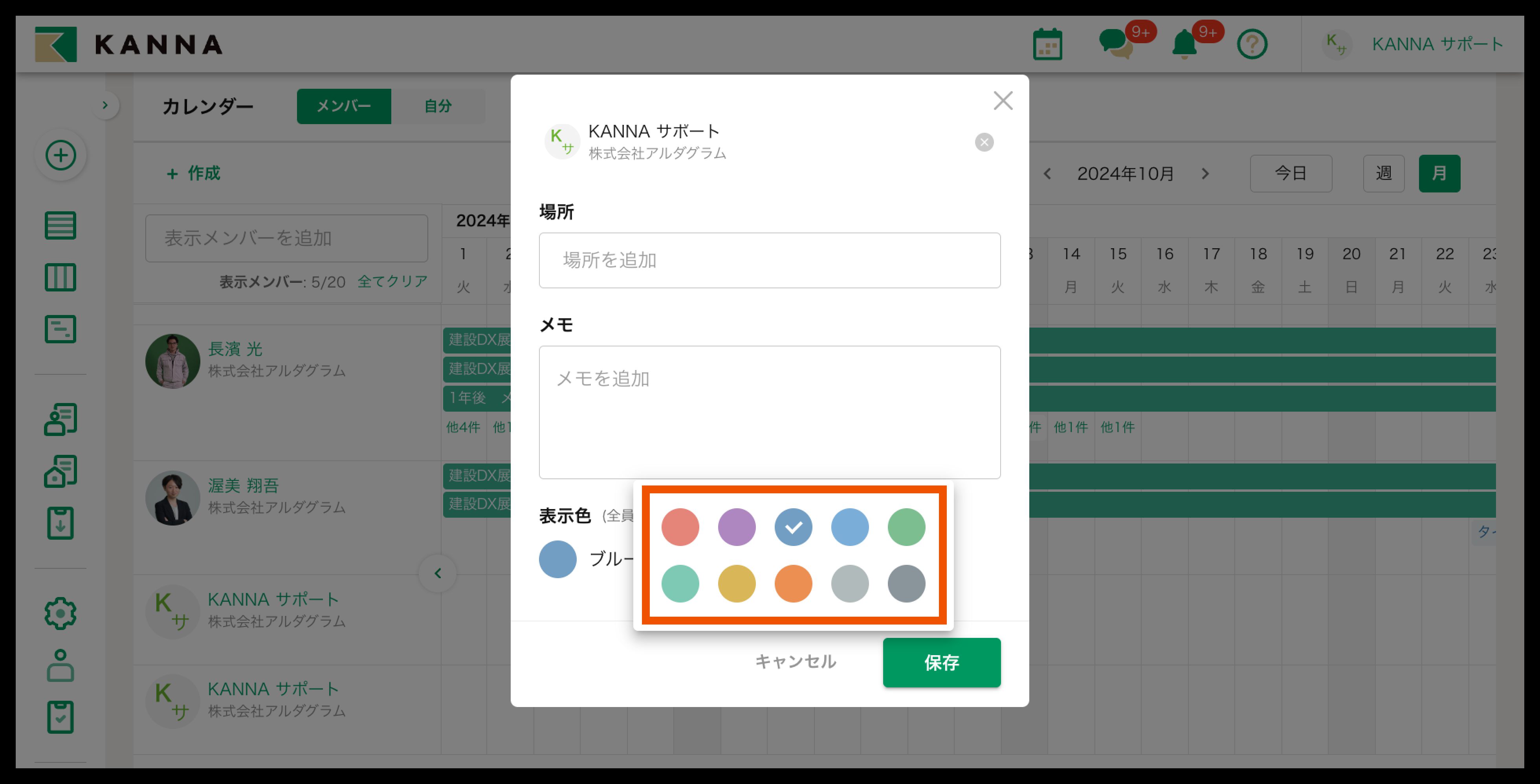 差配した予定の【編集】から、案件の「場所」「メモ」を書き加えたり、表示色を変更することができます。