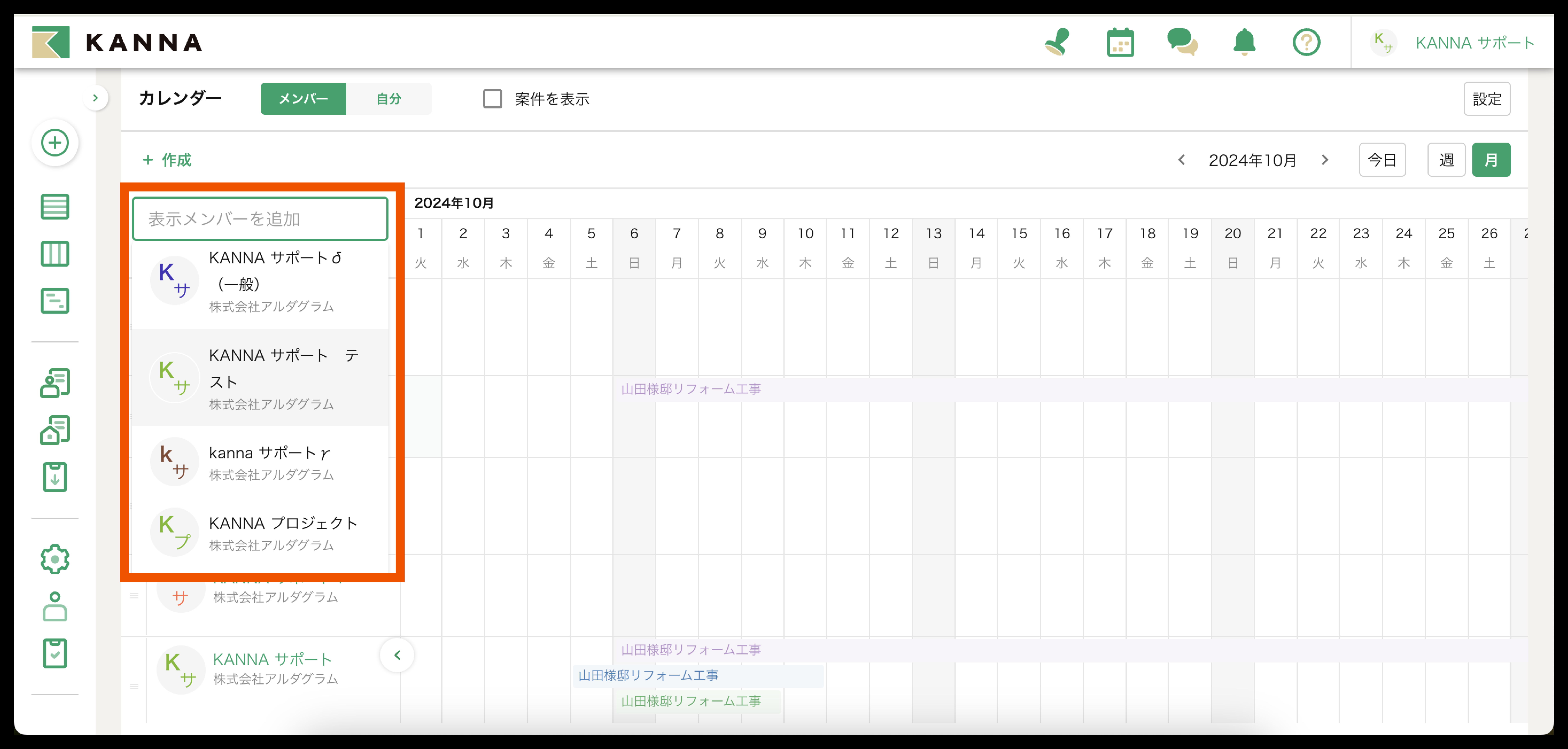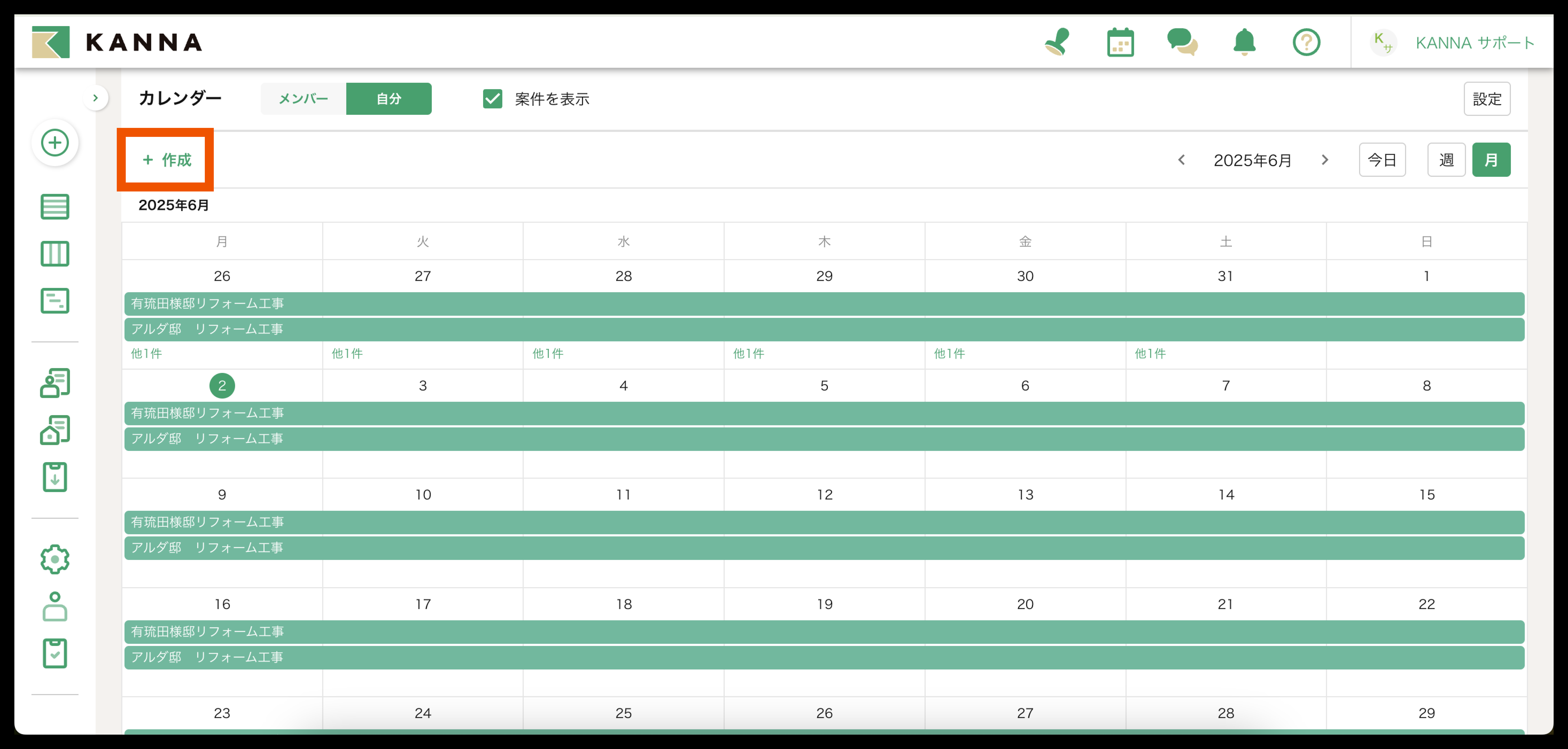 カレンダー上でメンバーを既存案件に紐づけて予定を作成することが可能です。