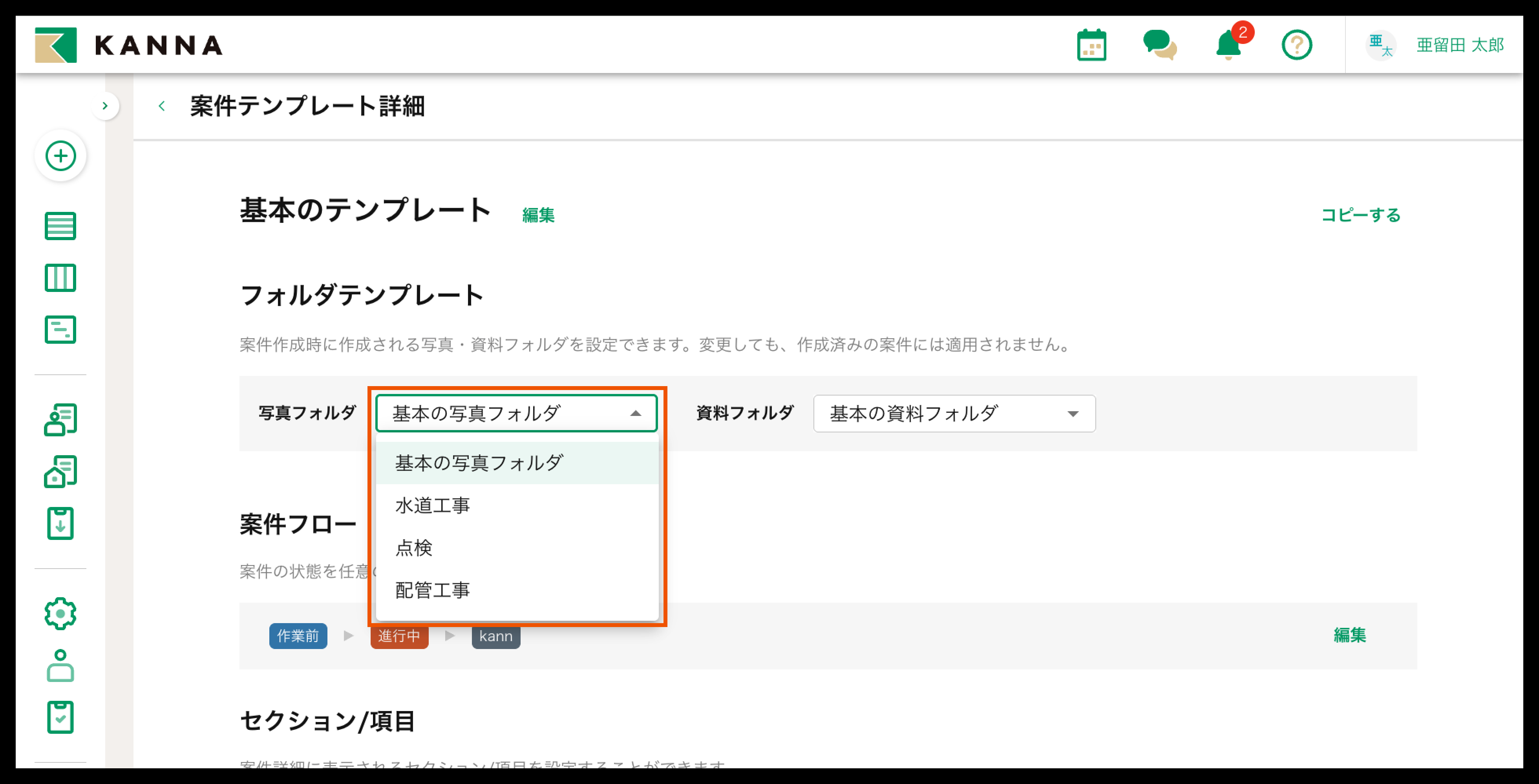 ※ 案件作成後に案件テンプレートを変更しても、写真/資料フォルダテンプレートは変更することはできません。