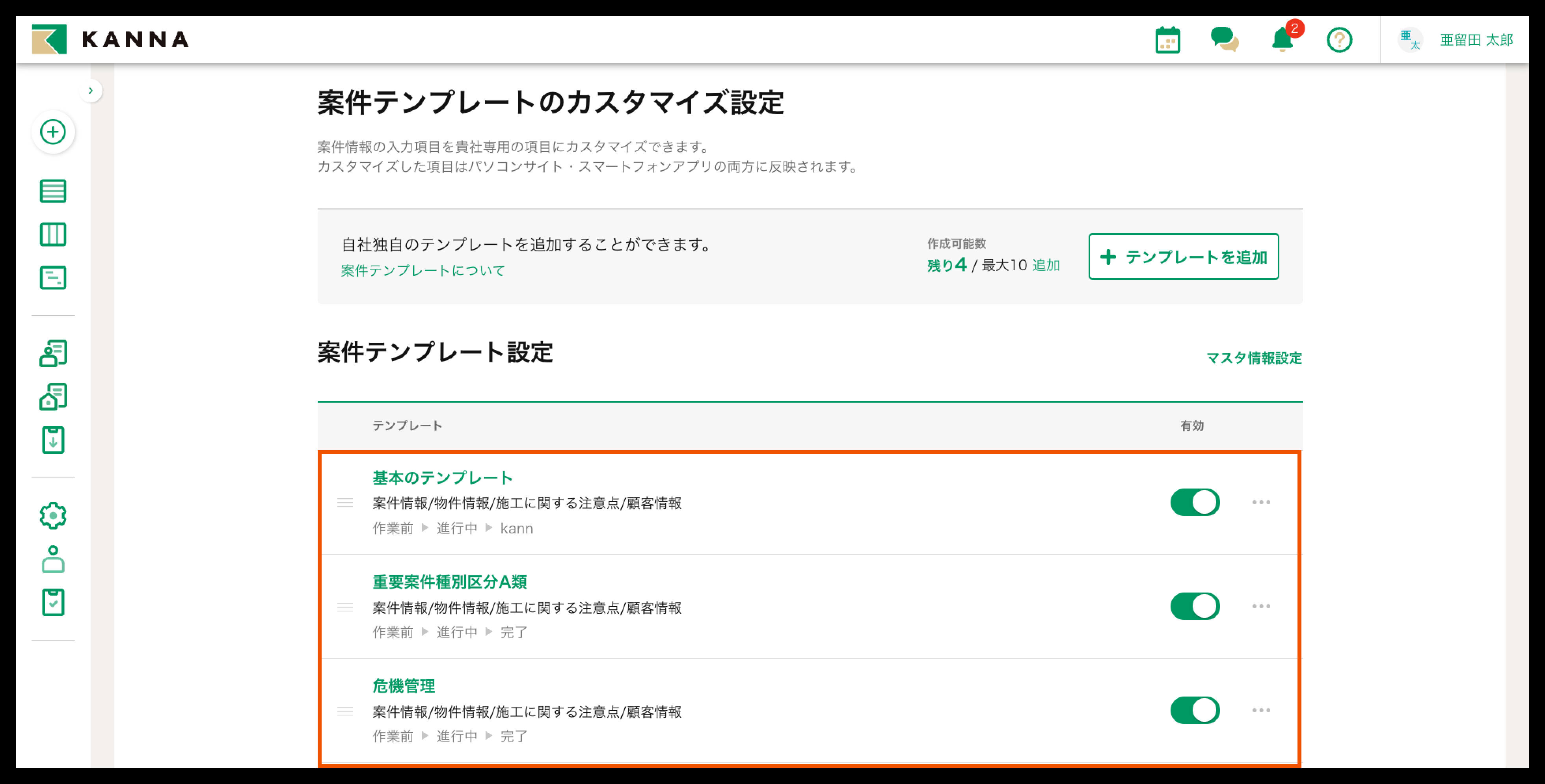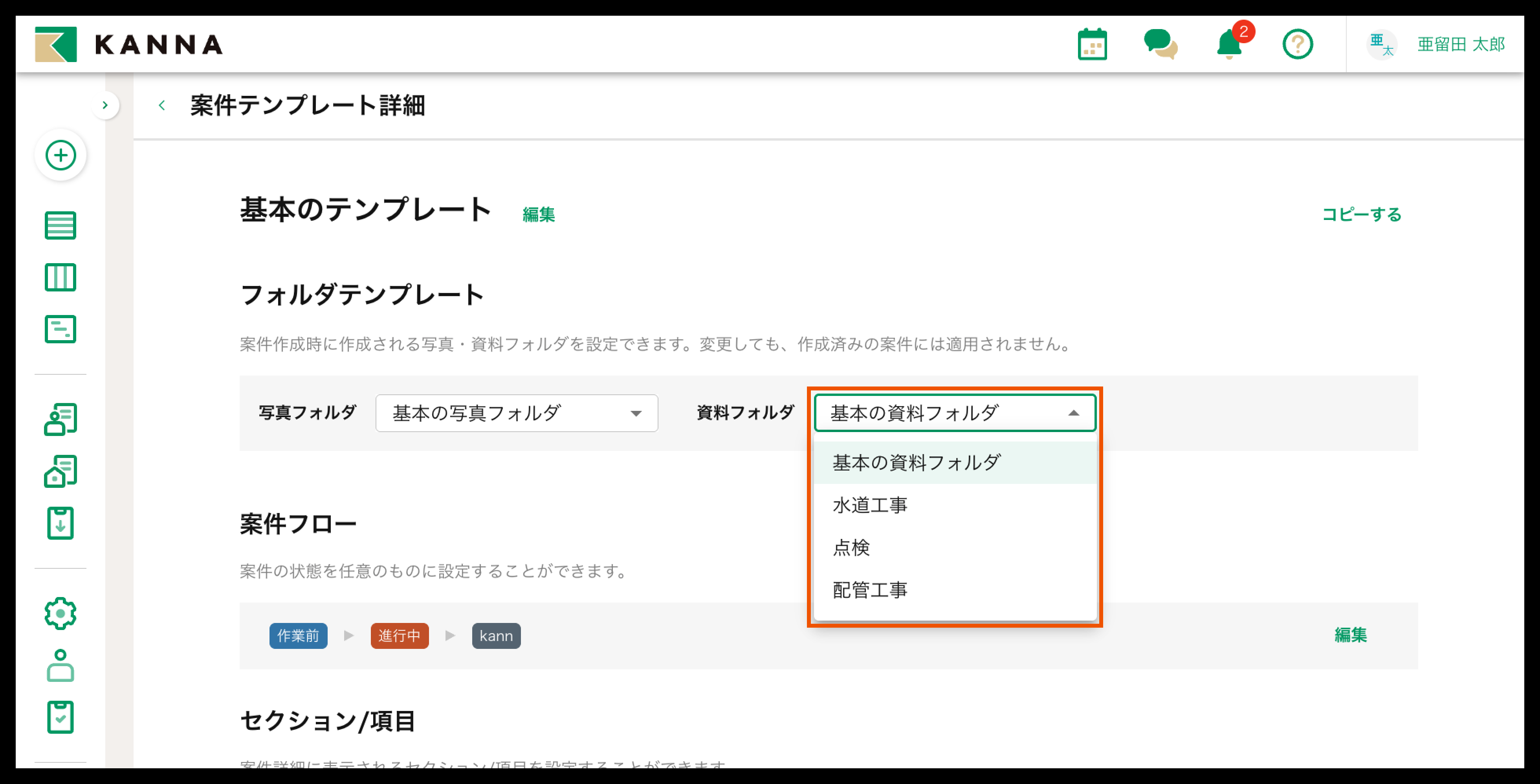 ひとつのフォルダテンプレートを複数の案件テンプレートとに紐付けすることも可能です。