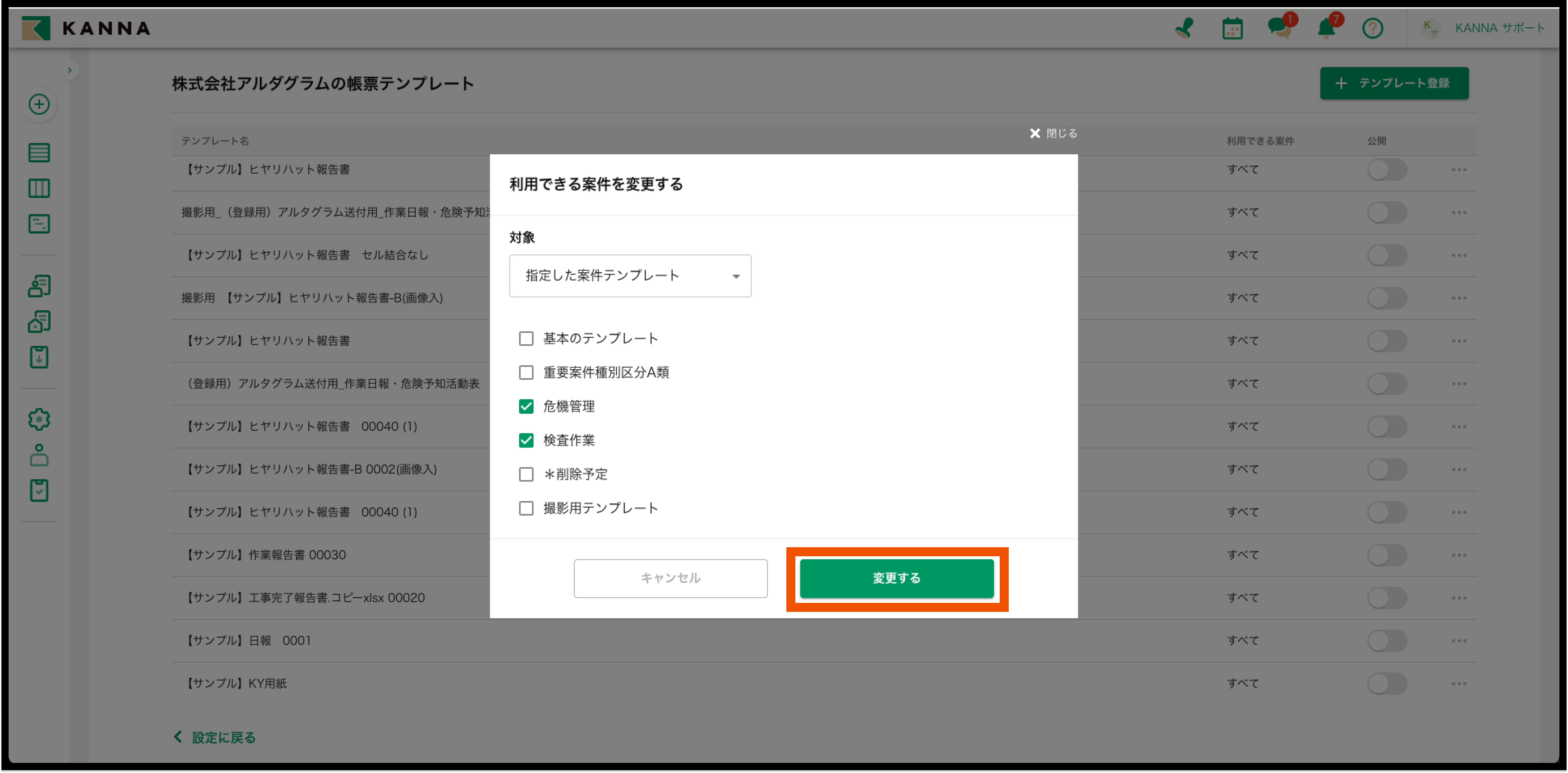 【KANNAレポート】帳票テンプレートを案件テンプレートごとに出す出さないを設定できるようになりました