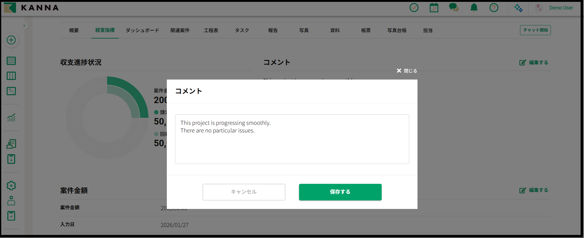 経営指標タブでは案件毎の売上や回収状況、進捗状況を管理することができます。