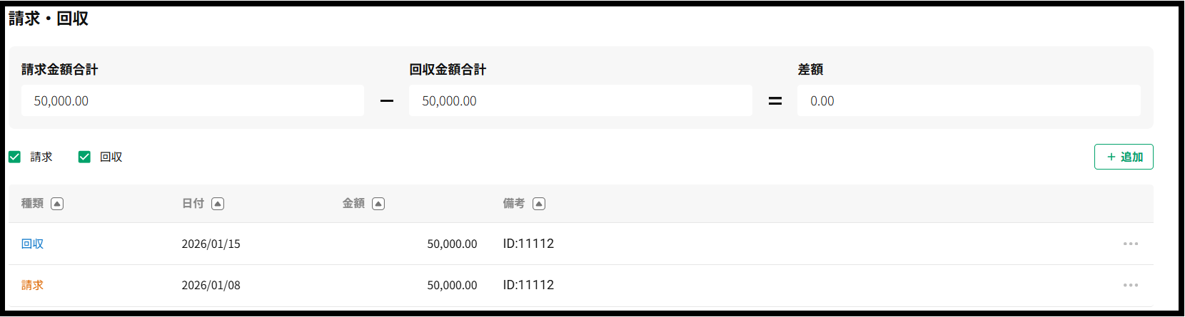 | 備考 | 請求や回収時に請求書番号やmemoを登録することができます。 |