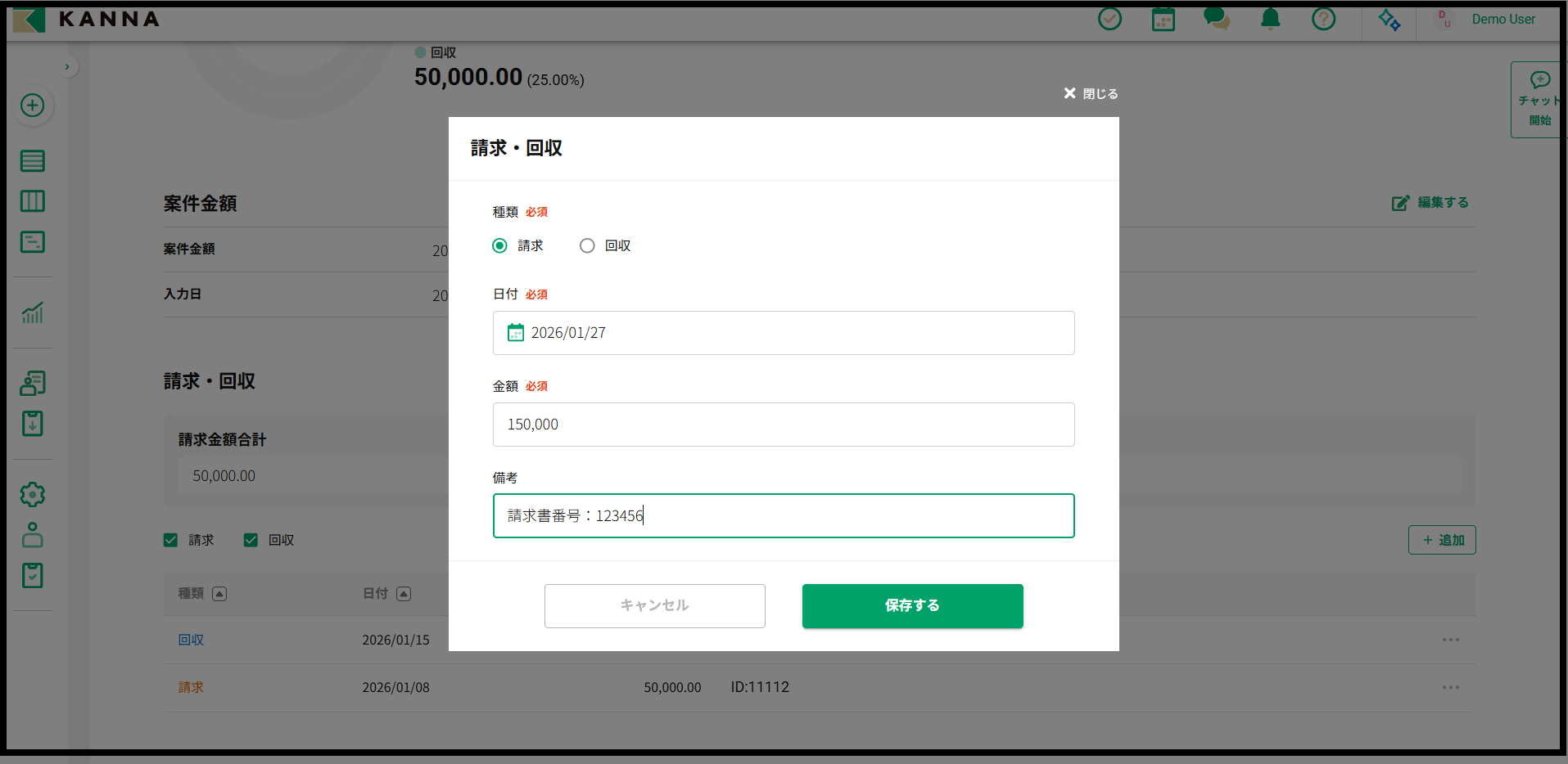 | 日付 | 請求や回収を行った日付を入力することができます。 |