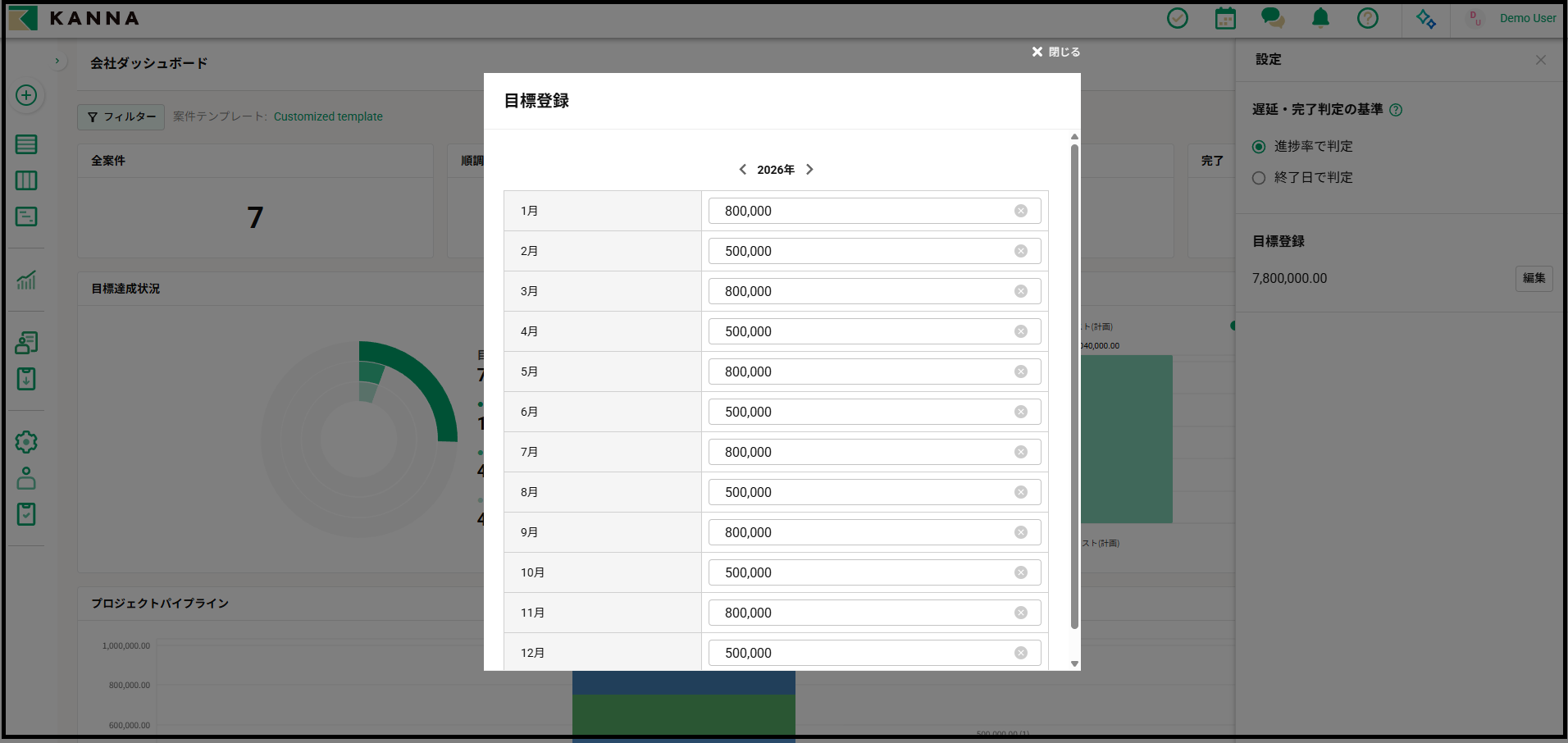 目標達成状況グラフに関する目標金額を登録することが可能です。目標金額は月次で登録することができます。数値を入力すると自動で登録されます。