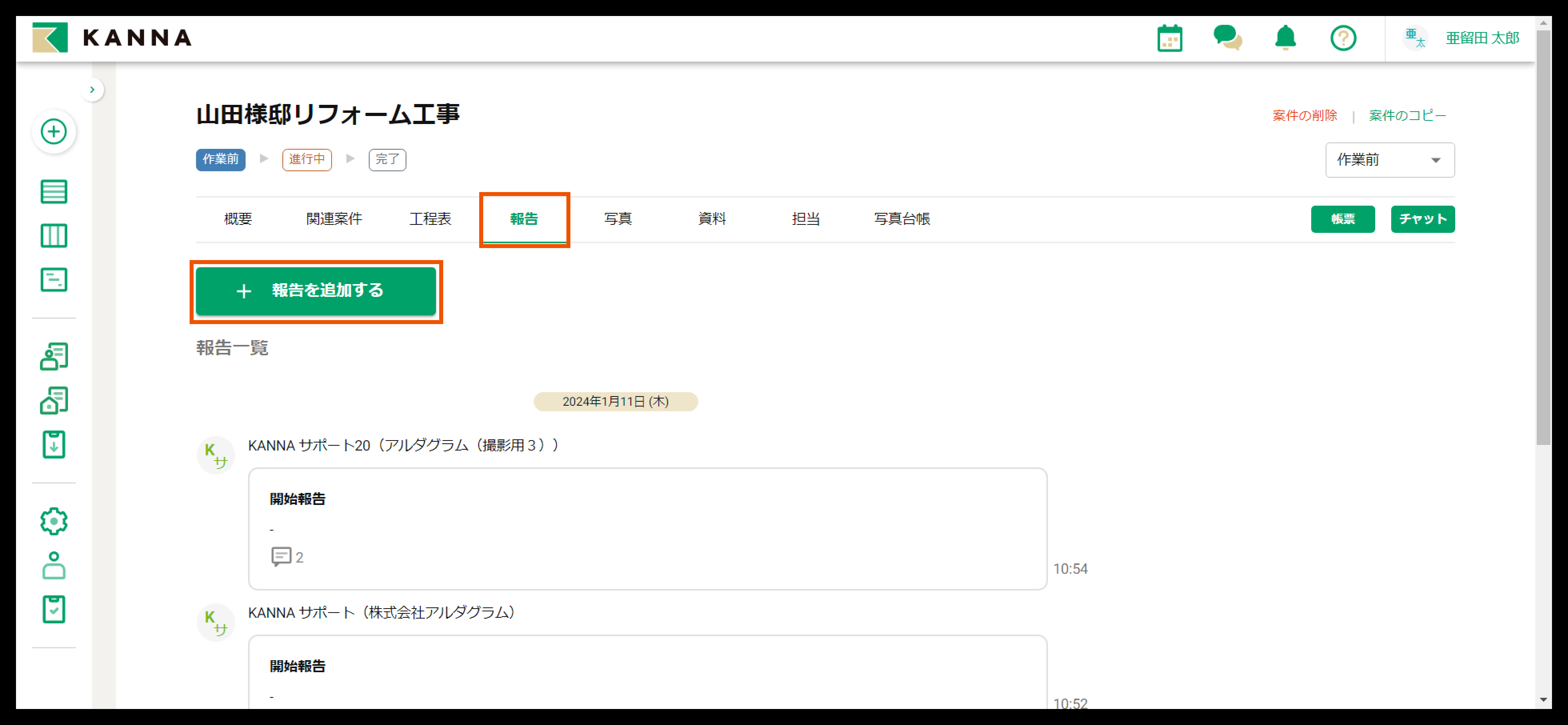 KANNAでは案件ごとに報告を追加することができます。