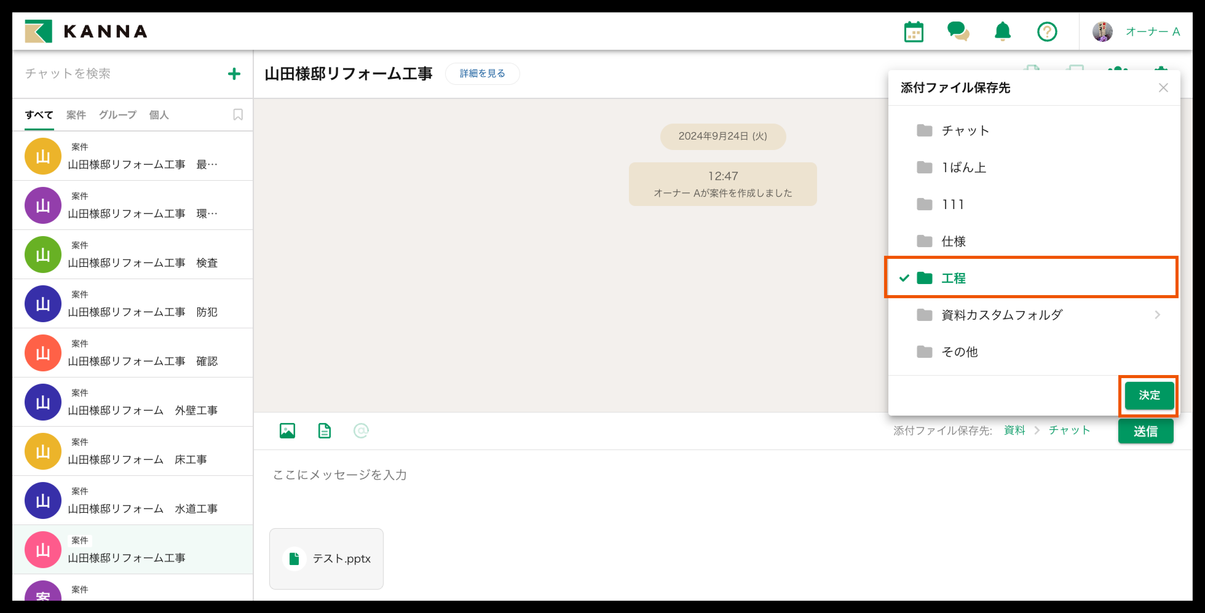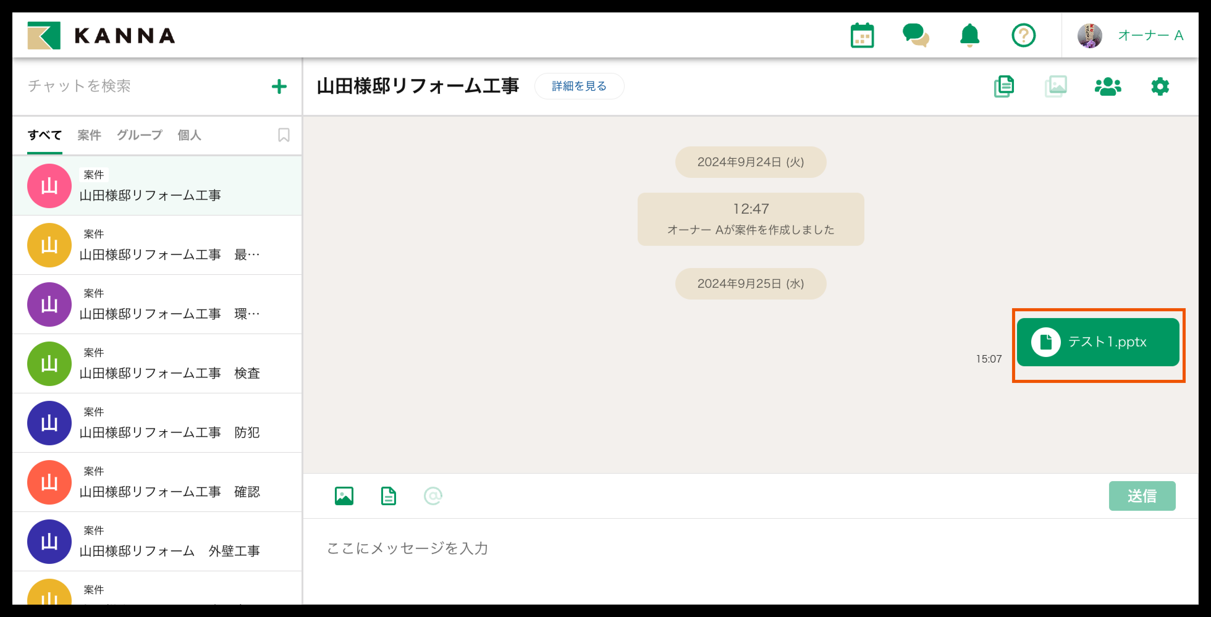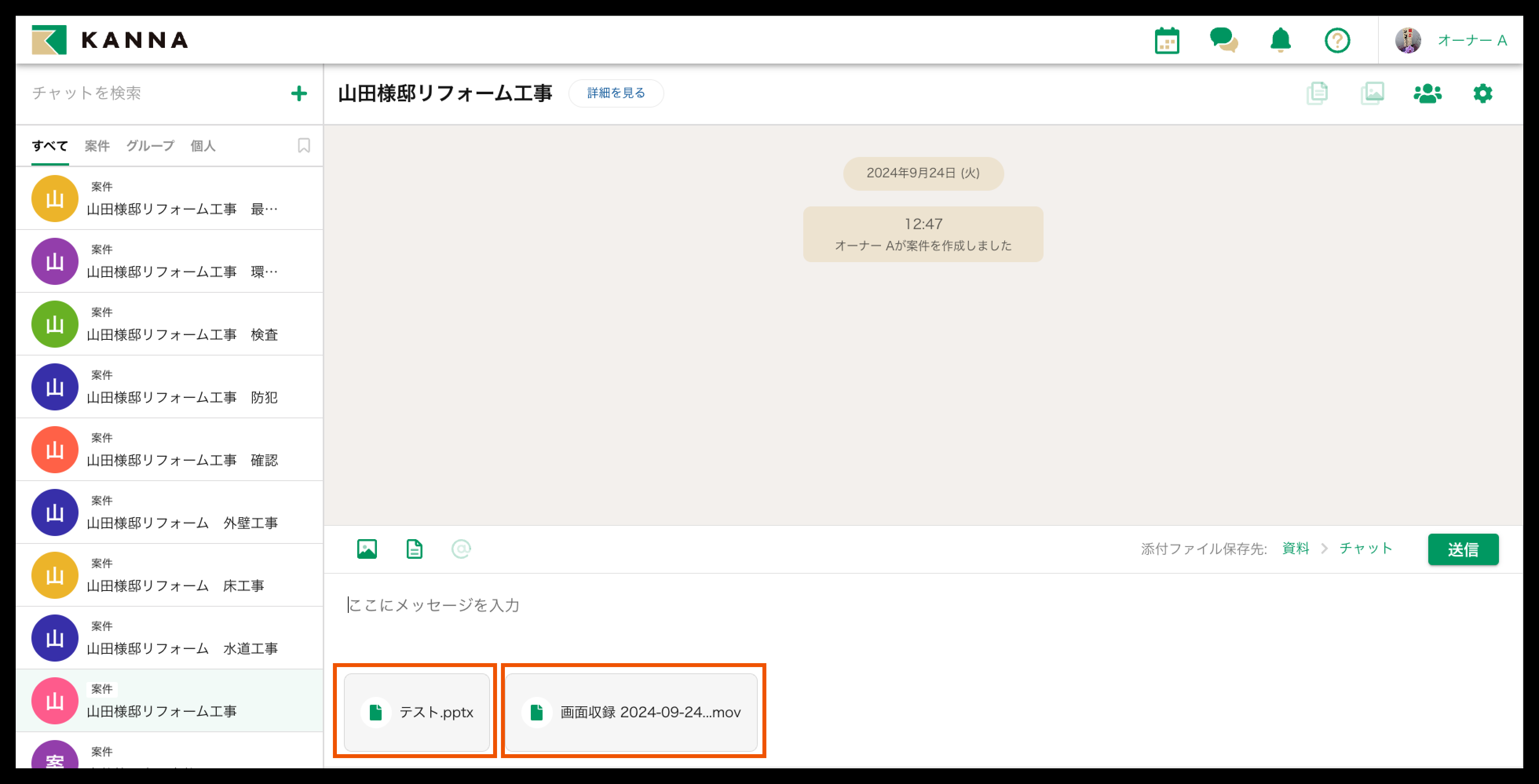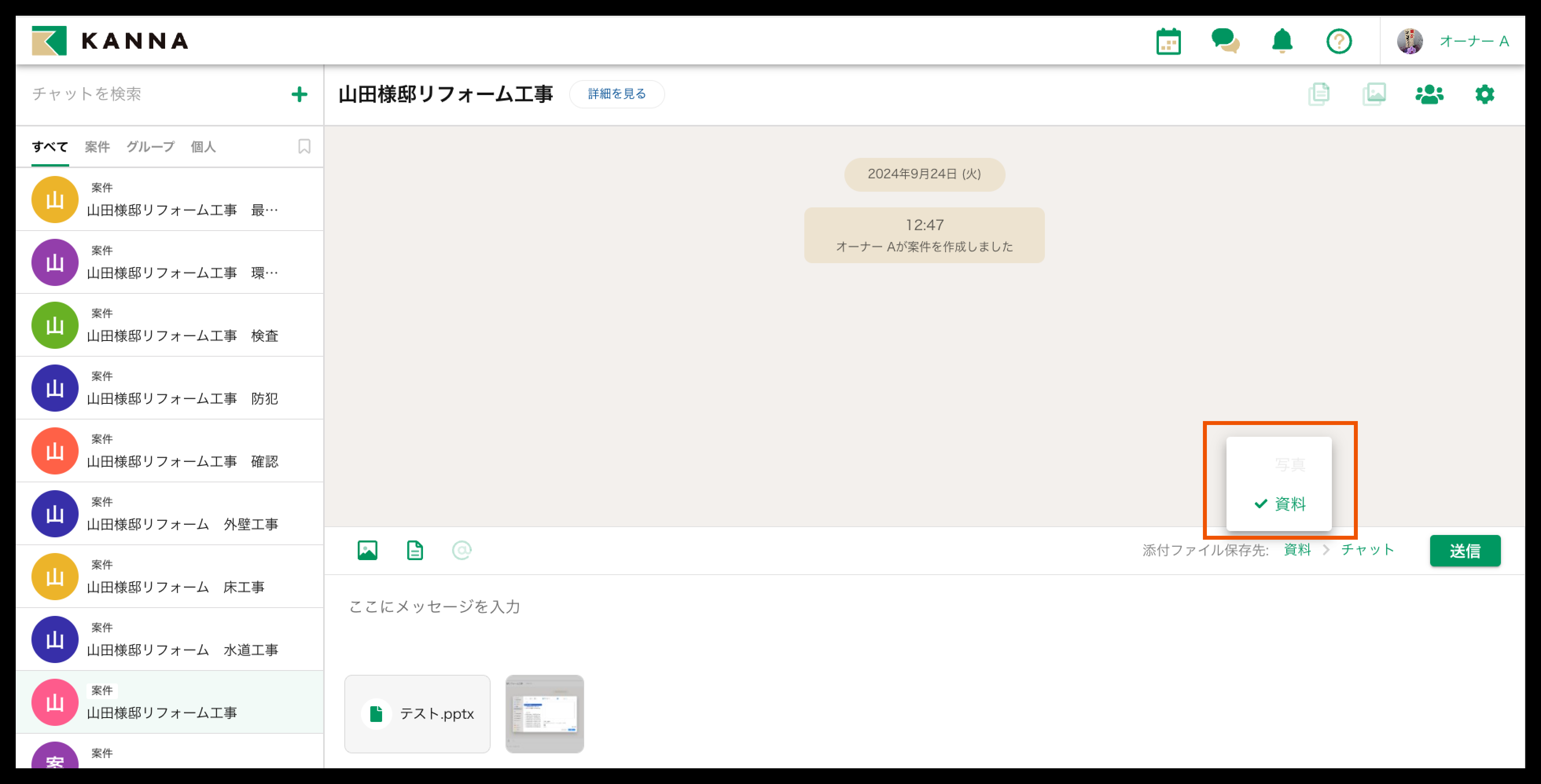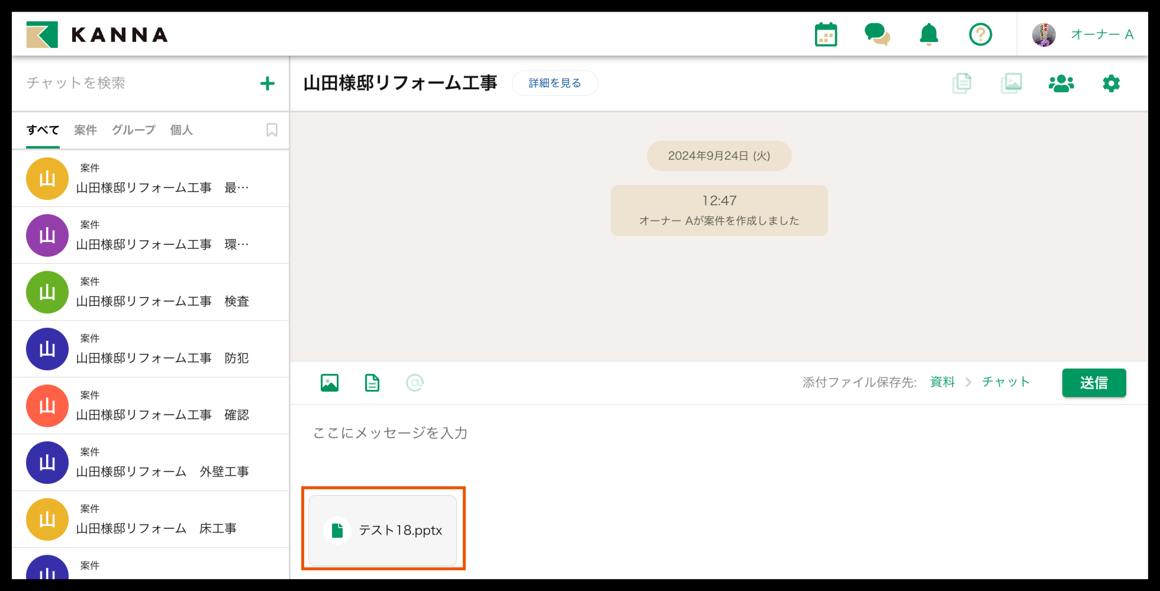 また、各案件のチャットで送った資料は自動的に案件内のフォルダに保存されます。