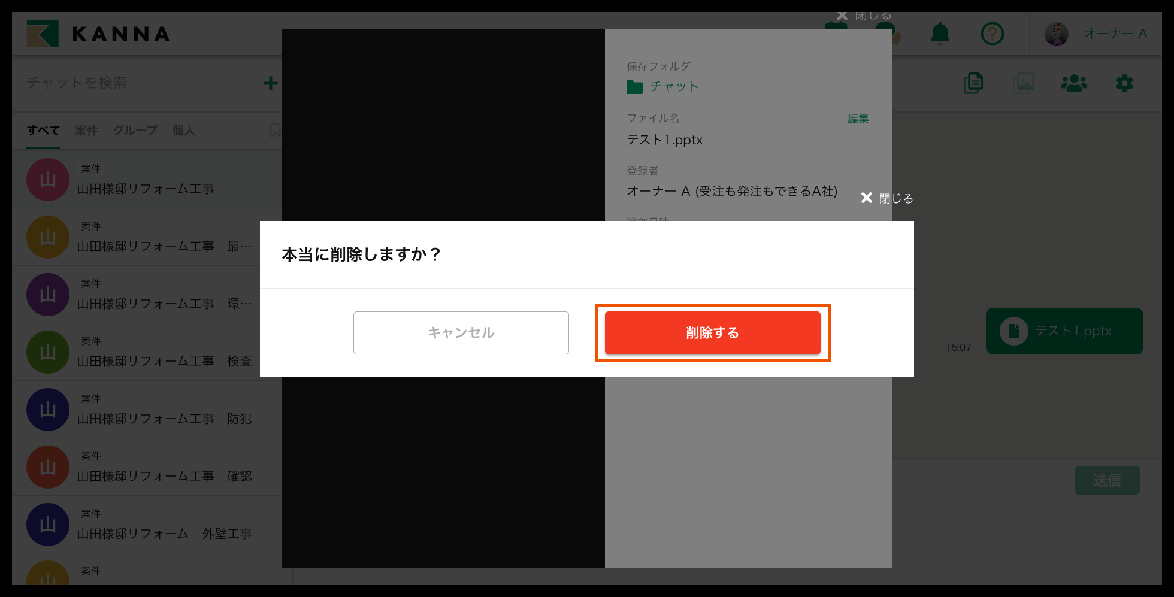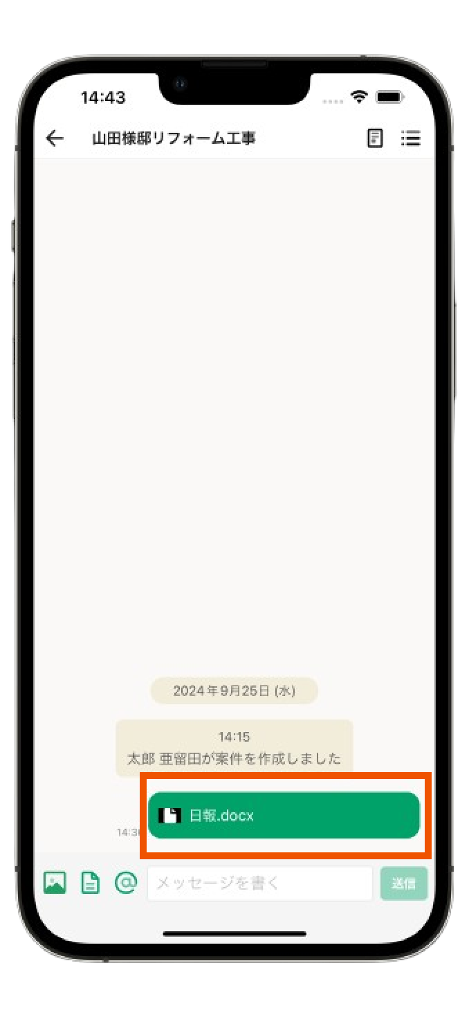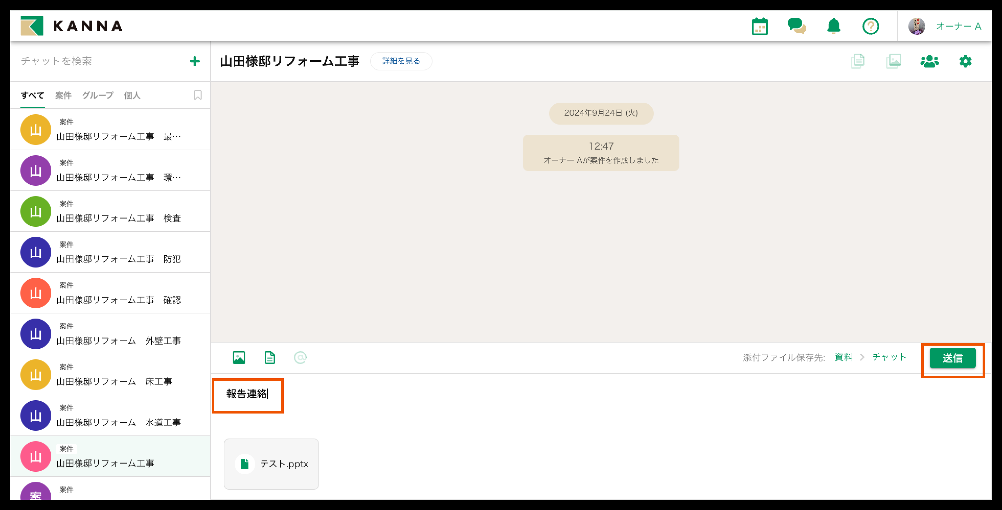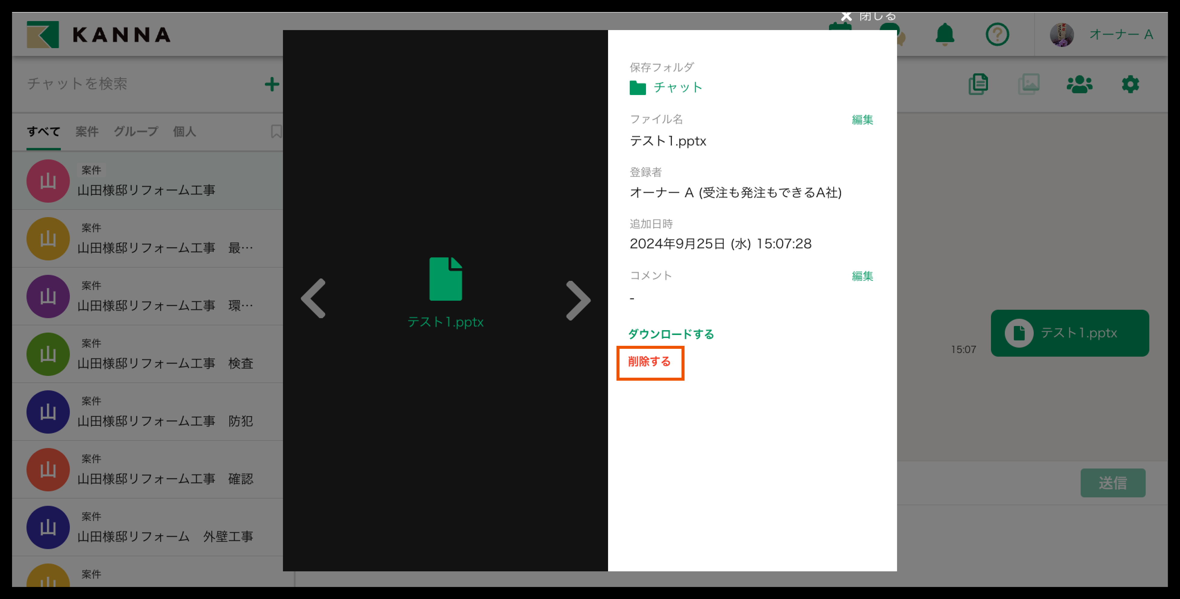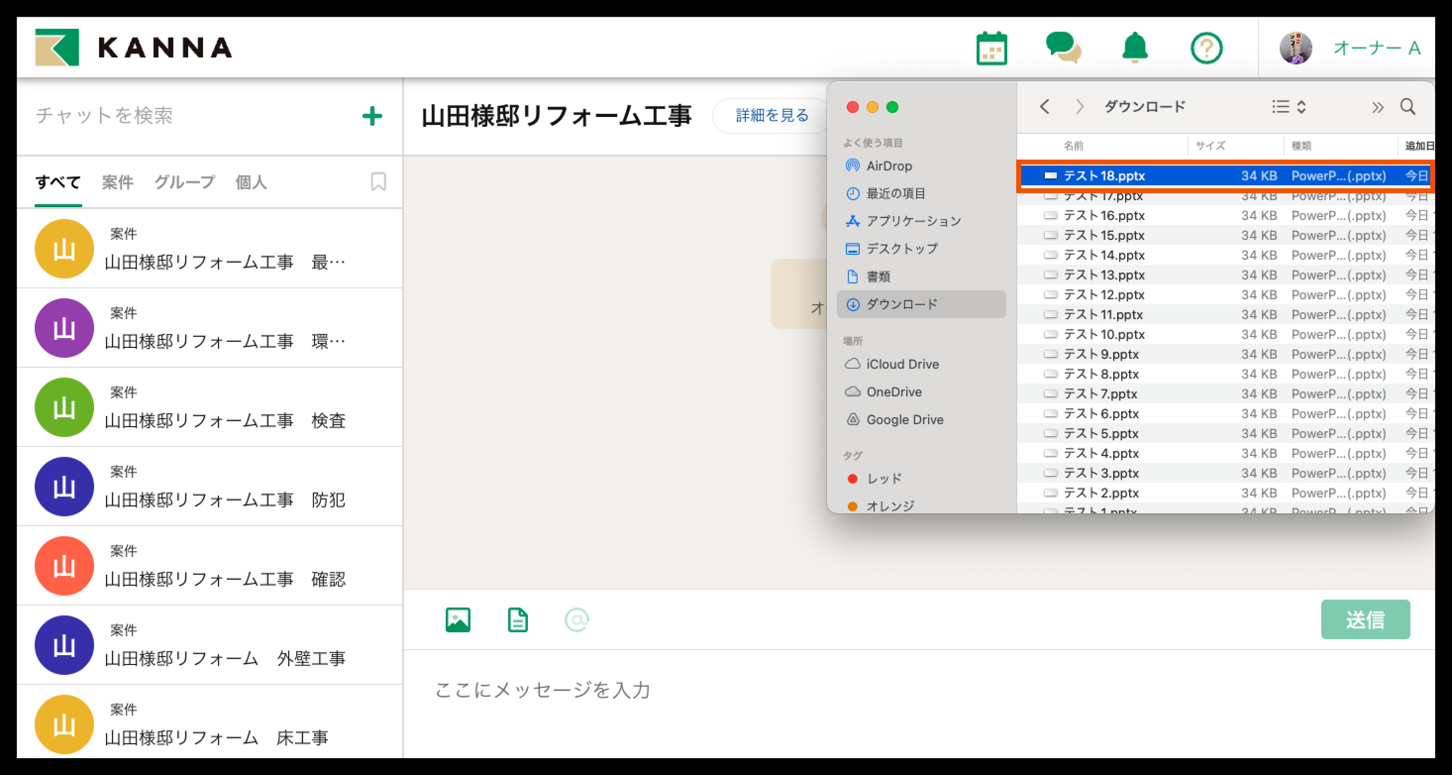 また、各案件のチャットで送った資料は自動的に案件内のフォルダに保存されます。