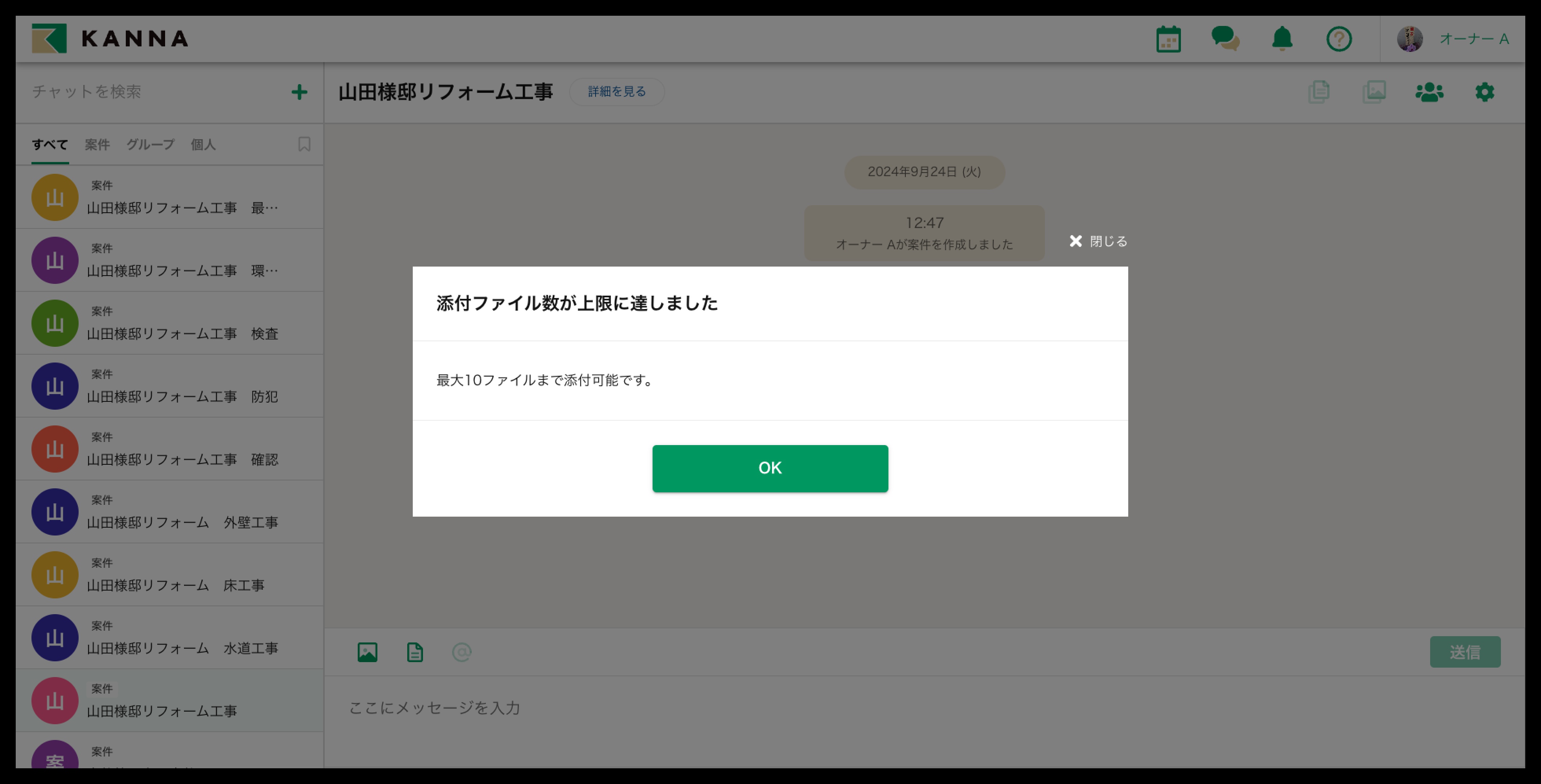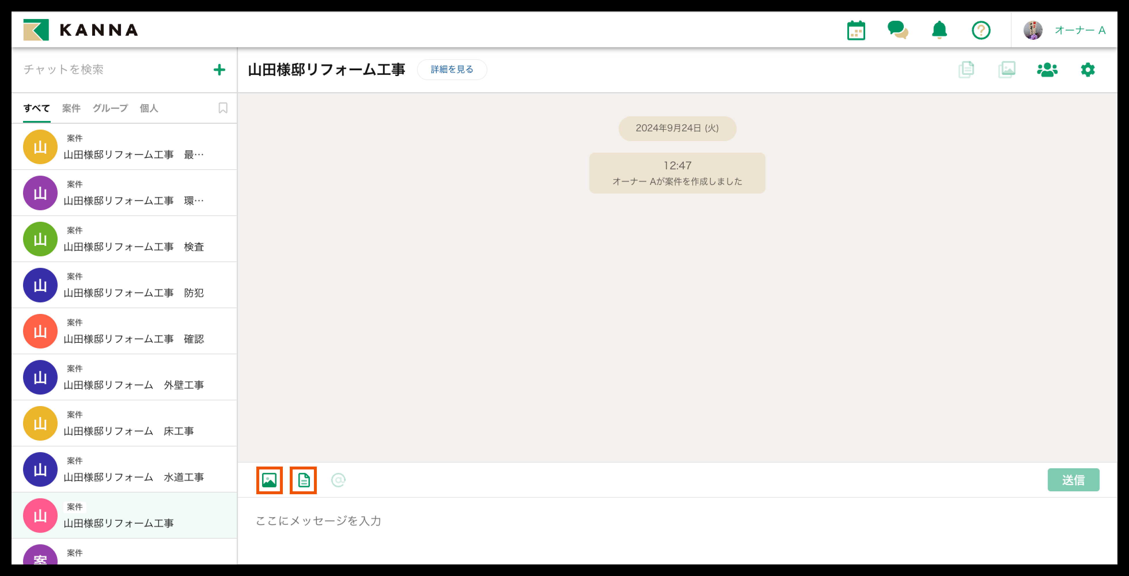 ※案件に紐付いていないグループチャットと個人チャットで写真や資料を送信する場合は、送信者側のKANNAストレージが使用されます。有料会員の招待でKANNAをご利用いただいている無料会員の使用可能ストレージは0.5GBです。それを超える場合は写真や資料が送信できなくなりますのでのでご注意ください。