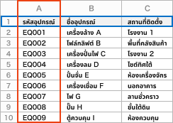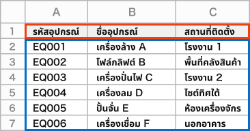 ตัวอย่าง: เมื่อผู้ใช้เลือก “EQ001” ค่า “High-Pressure Washer A” และ “Factory 1” ในแถวเดียวกันจะถูกกรอกอัตโนมัติ