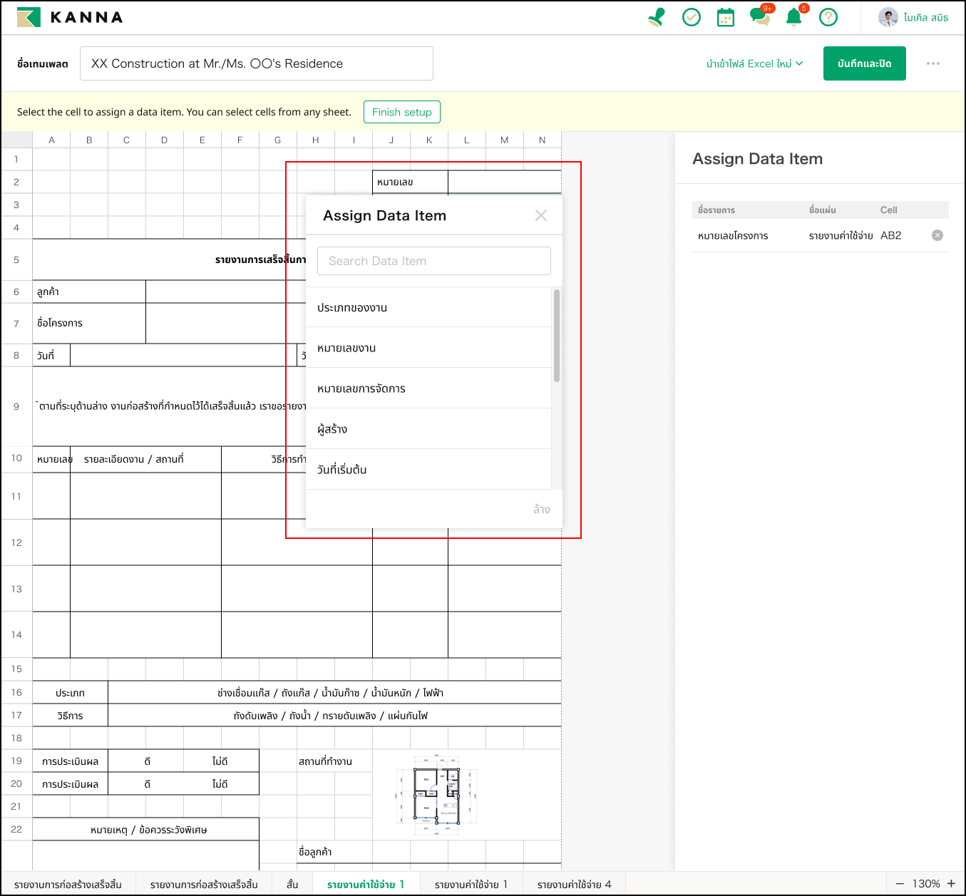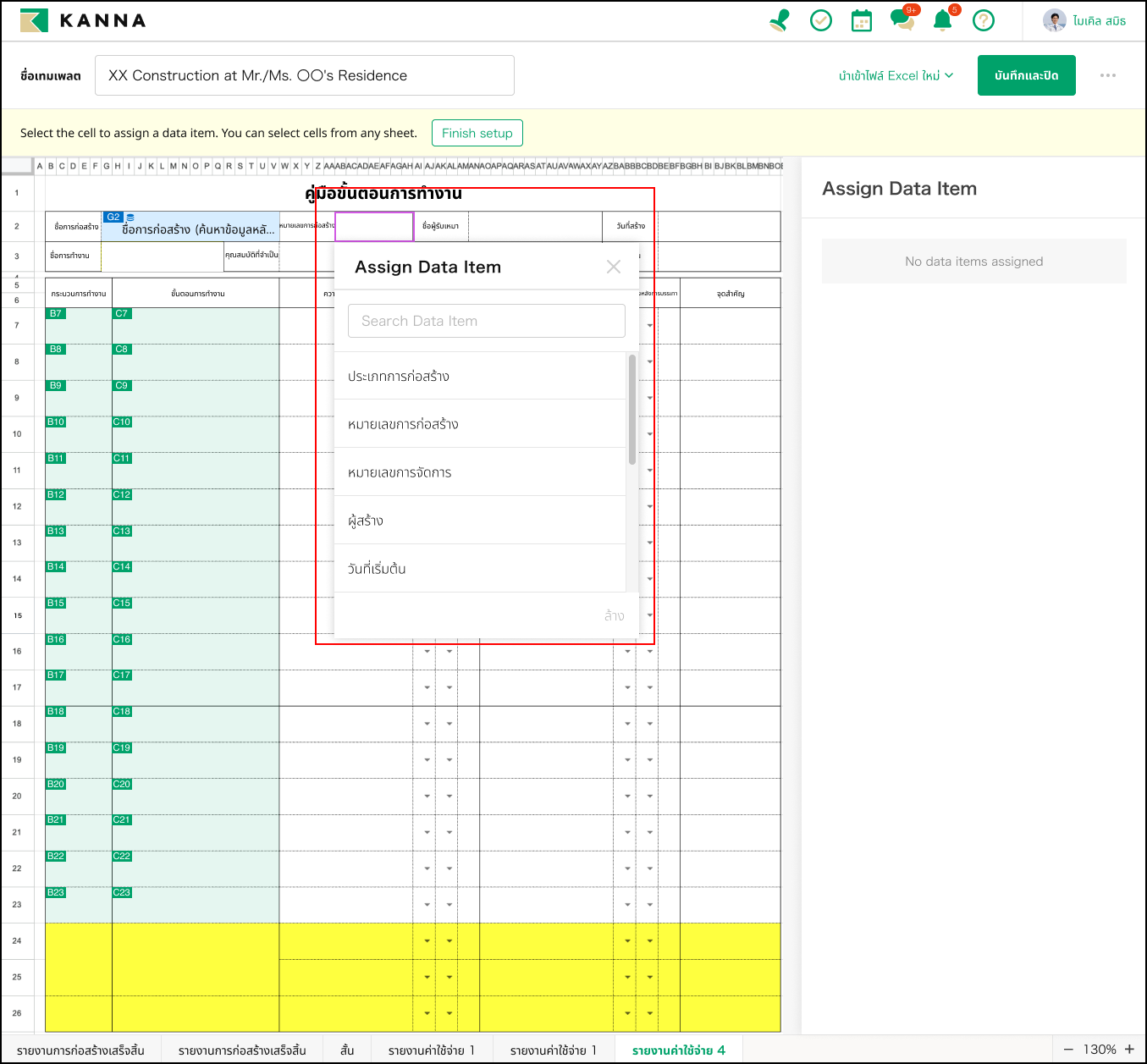 เซลล์ที่ได้รับการกำหนด Data item แล้ว สามารถดูได้ในรูปแบบรายการจากแถบด้านขวาของหน้าจอ