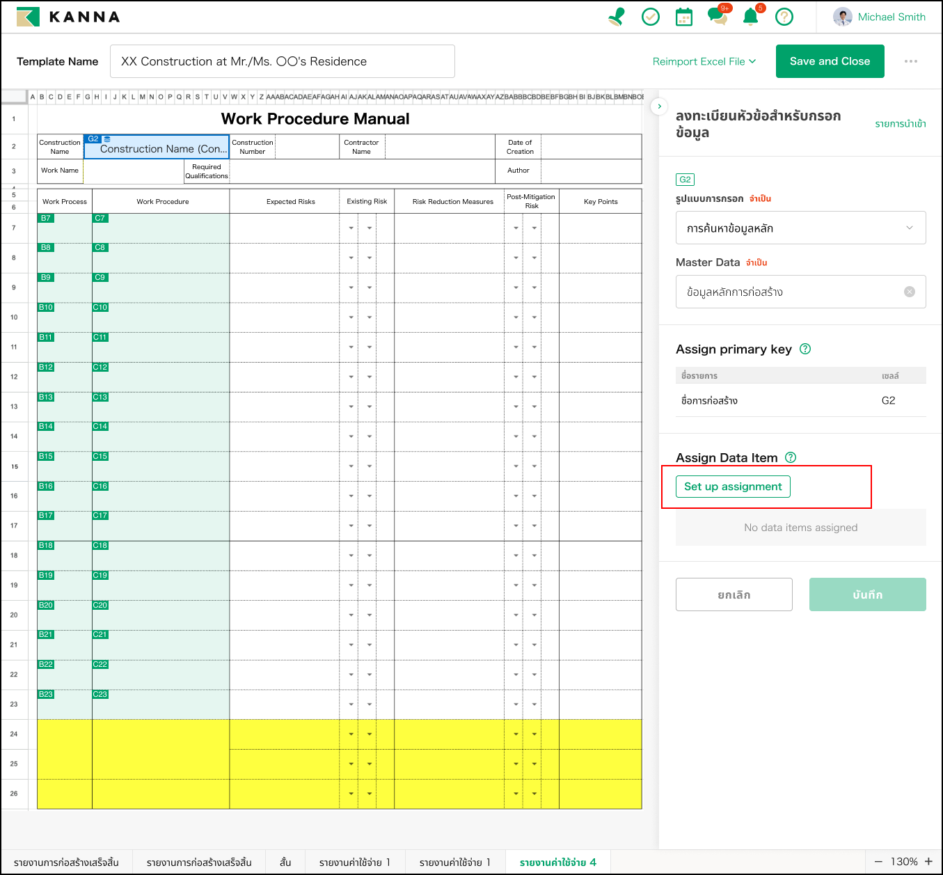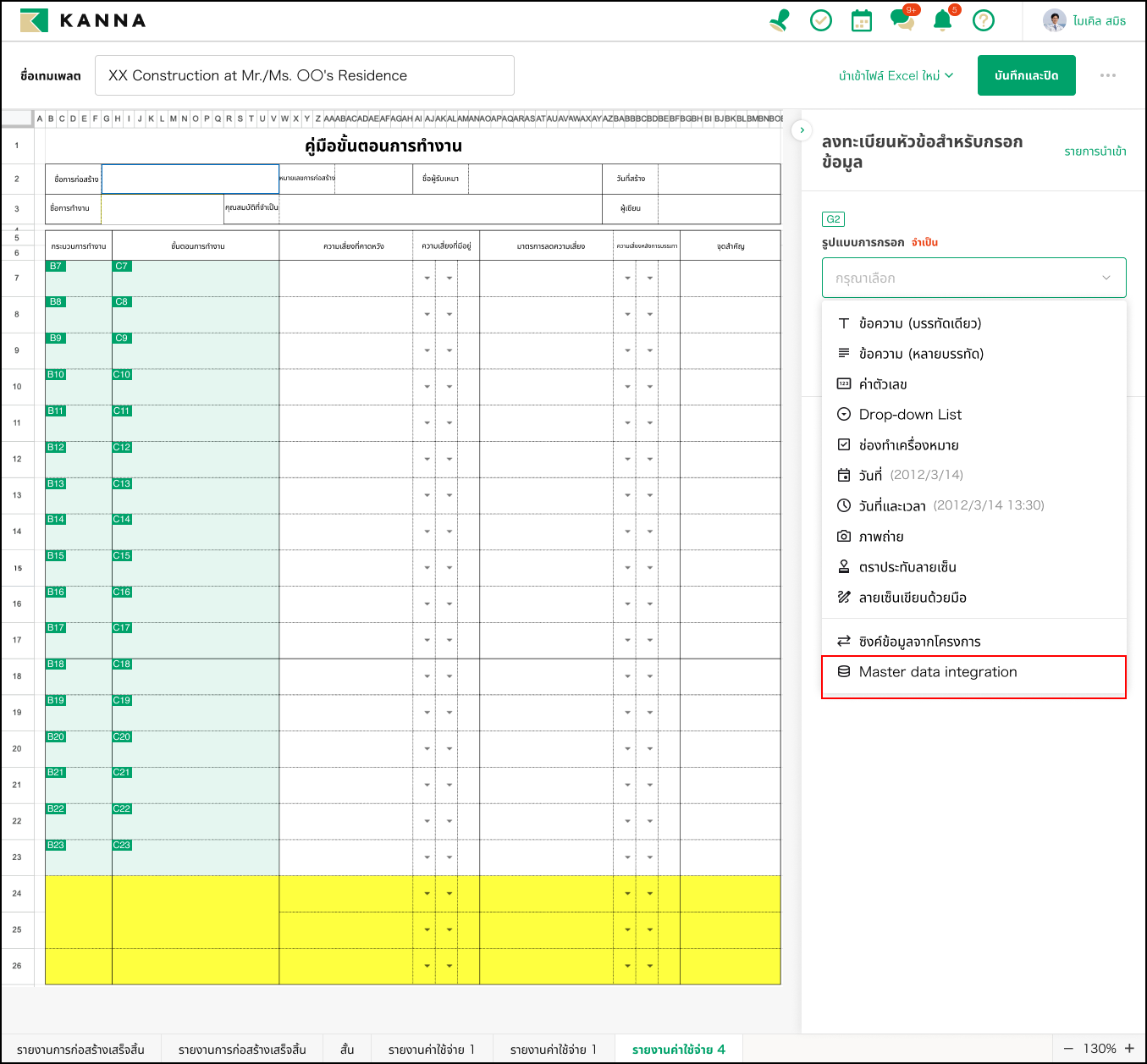 ในหน้าการตั้งค่า แม่แบบรายงาน (Report Template) ให้เลือกเซลล์ แล้วเลือก Master data integration จากตัวเลือก Input Type