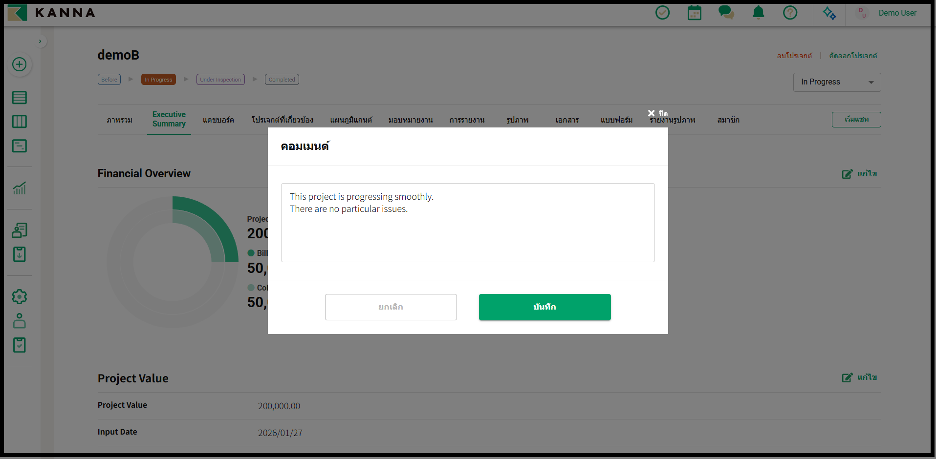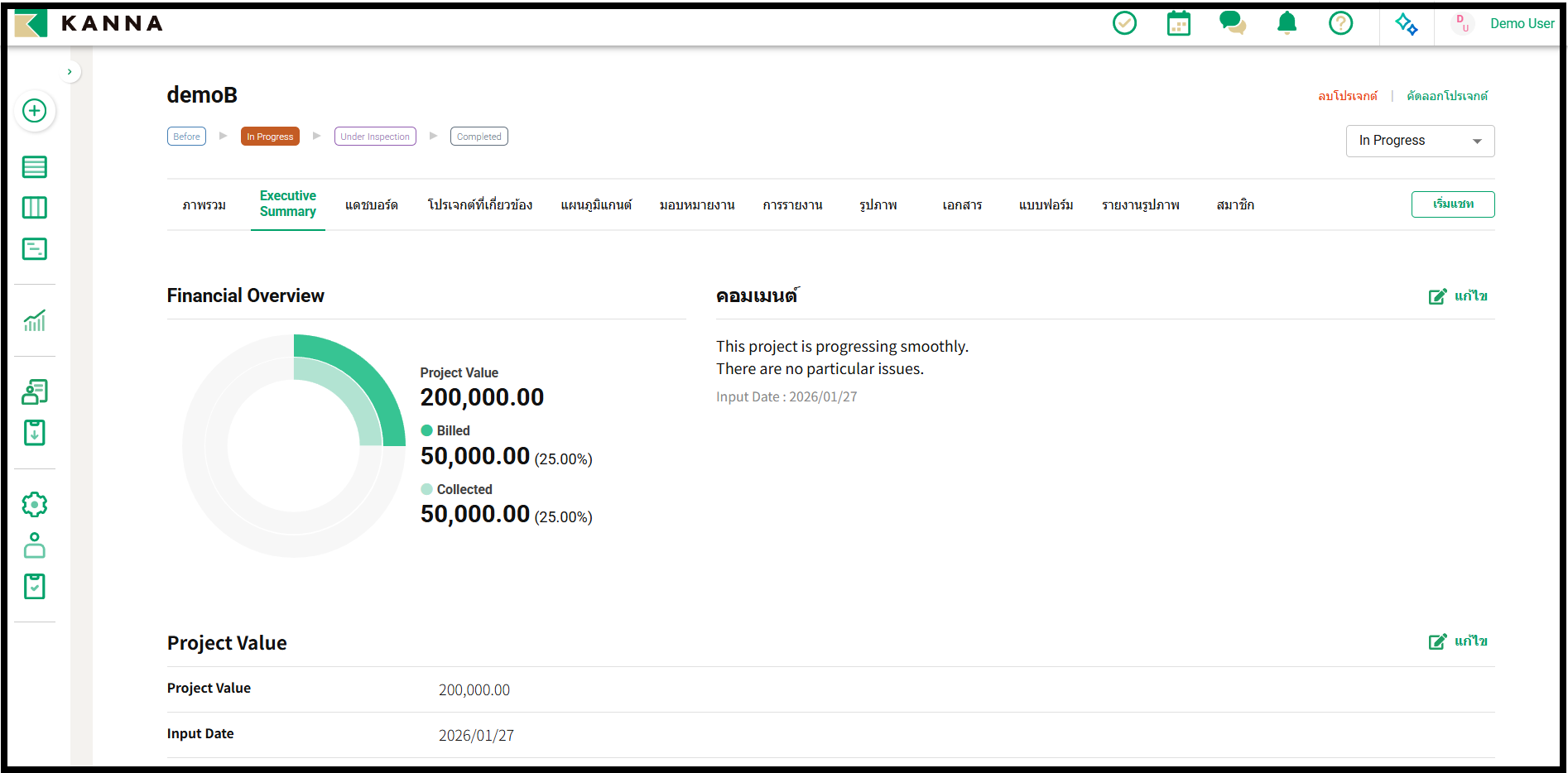 * แท็บ Executive Summary สามารถดูและแก้ไขได้โดยสมาชิกที่มีสิทธิ์ระดับ Company Administrator (ผู้ดูแลระบบของบริษัท) หรือสูงกว่า โดยไม่คำนึงถึงสิทธิ์ในโปรเจกต์นั้นๆ