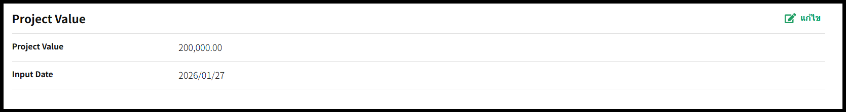 | Project Value | แสดงยอดเงินที่ลงทะเบียนในช่อง Project Value บนแท็บ Executive Summary *หน่วยสกุลเงินที่แสดงจะสะท้อนตามการตั้งค่าใน [การตั้งค่าบัญชีบริษัท] > [Currency Settings] |