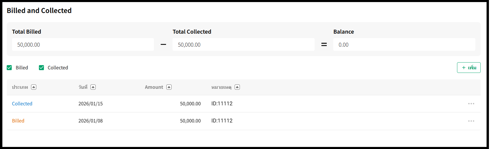 ประเภท | ระบุ "Billed" (วางบิล) หรือ "Collected" (เก็บเงิน) |